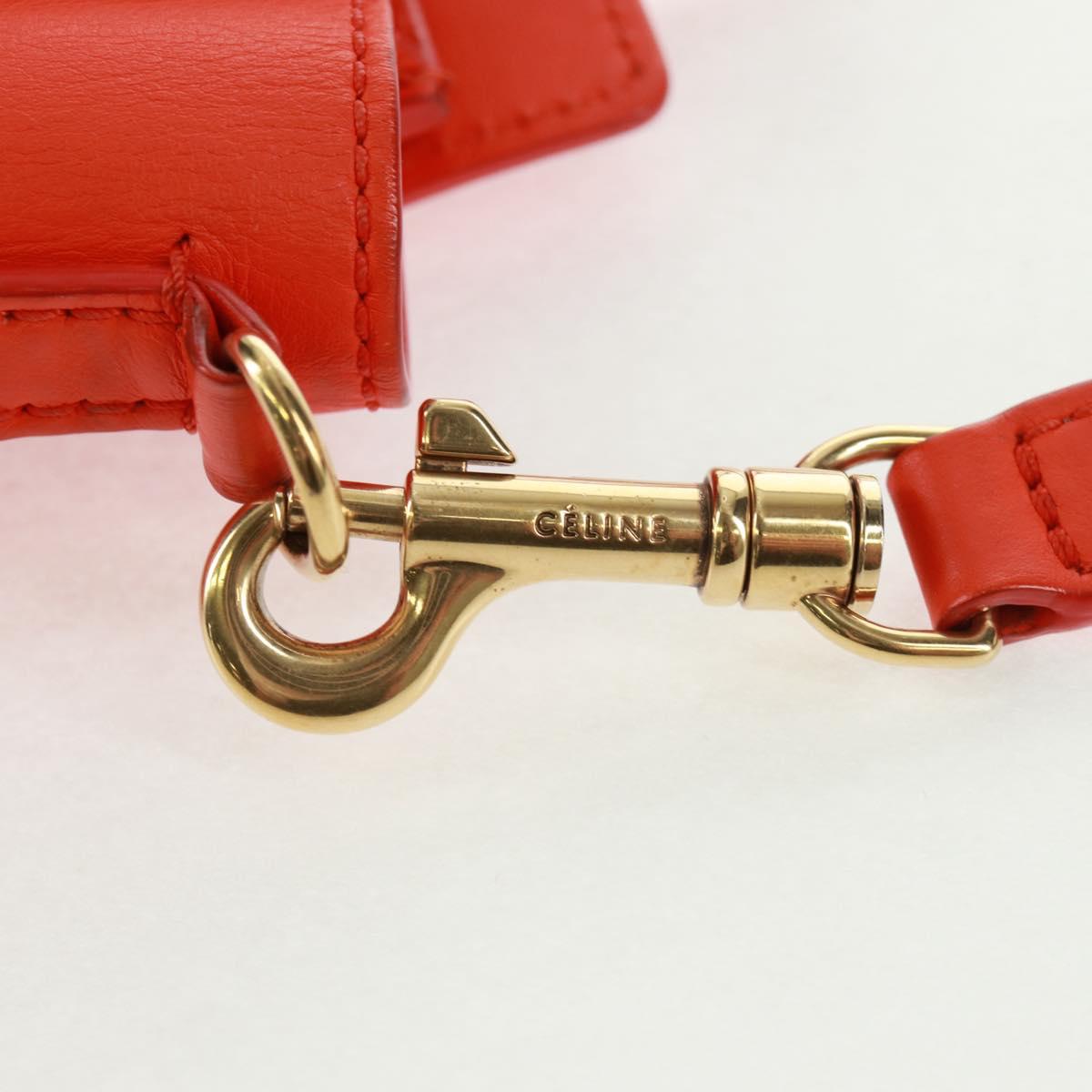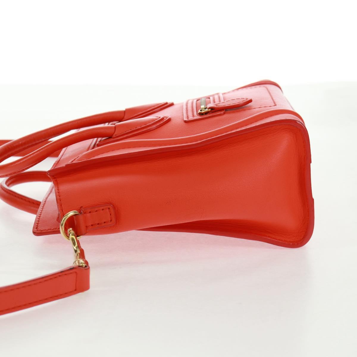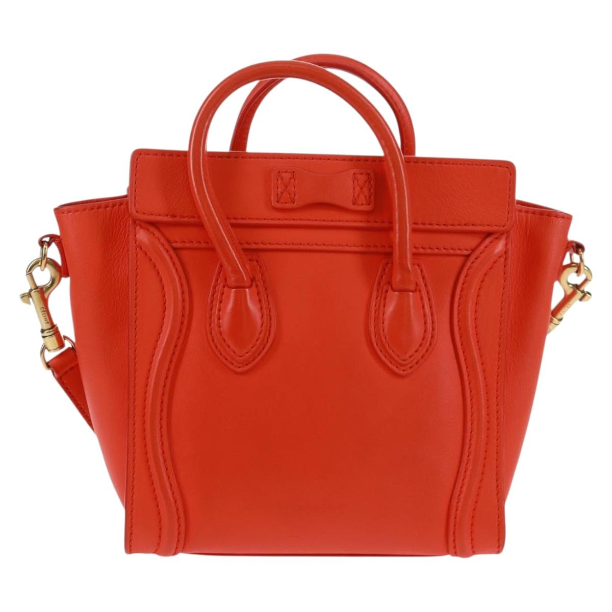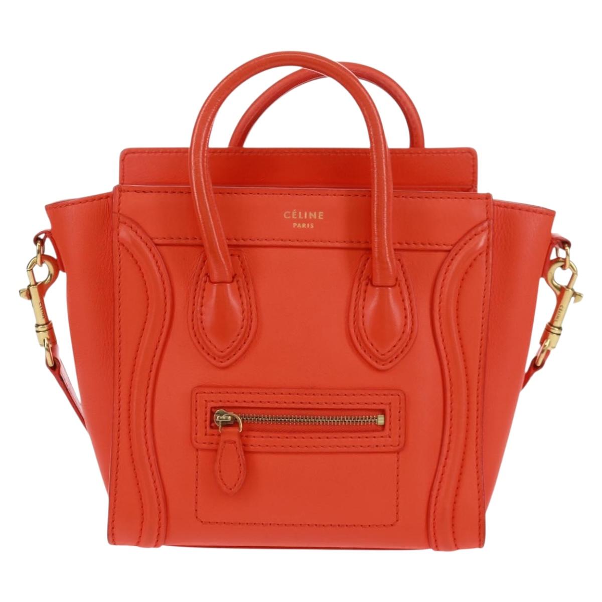 This is an authentic CELINE Drummed Calfskin Nano Luggage in Vermillion. This stylish small tote is crafted of rich, grained leather in red-orange. This shoulder bag features rolled leather top handles, an optional shoulder strap with ruthenium clasps, decorative leather detailing, and an exterior zipper pocket. The top unzips to a suede interior with a patch pocket.