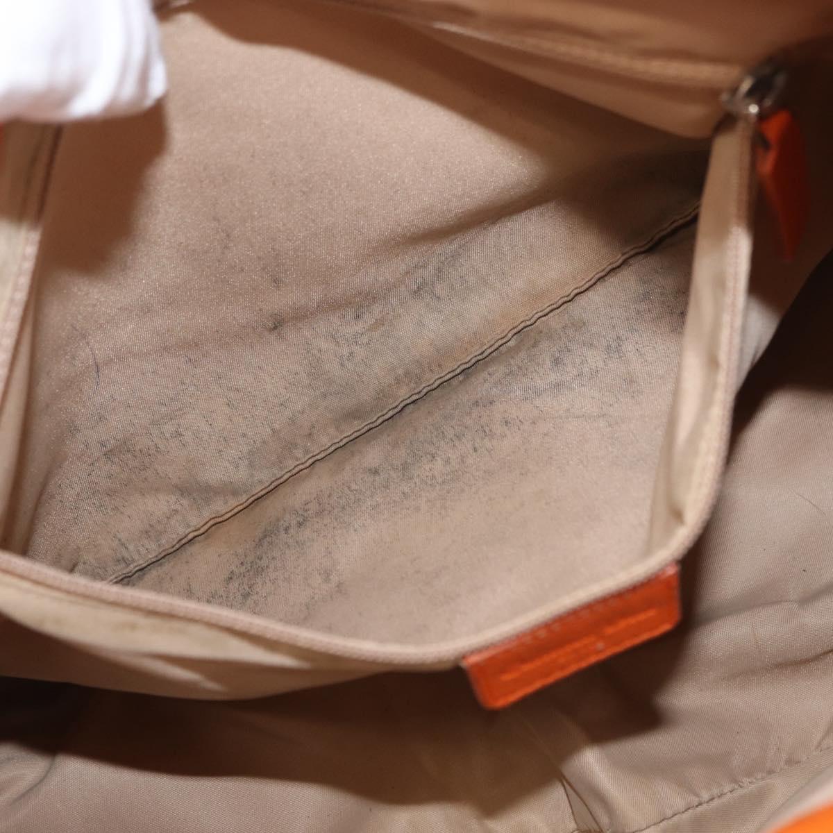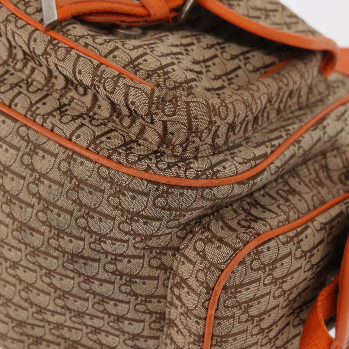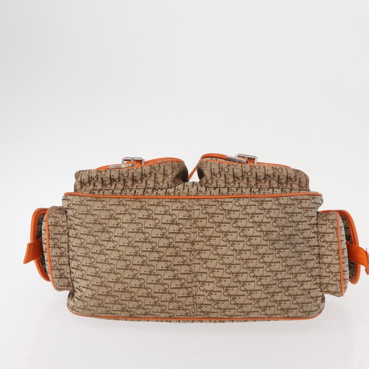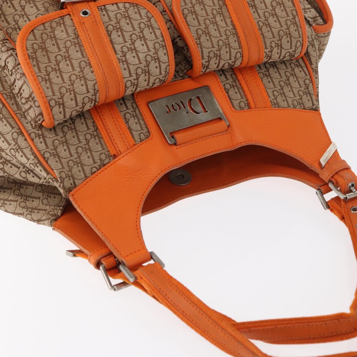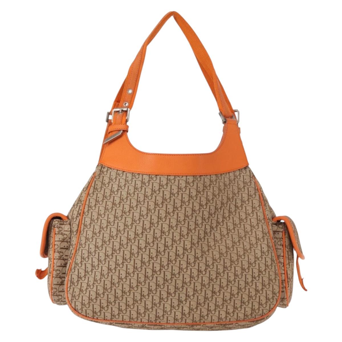This is an authentic CHRISTIAN DIOR Monogram Street Chic Multipocket Hobo Bag crafted of traditional brown on beige Dior logo canvas and brightf orange cowhide leather. The bag has a polished brass front Dior name plate accent on the front. The interior is a camel fabric with a zipper pocket.