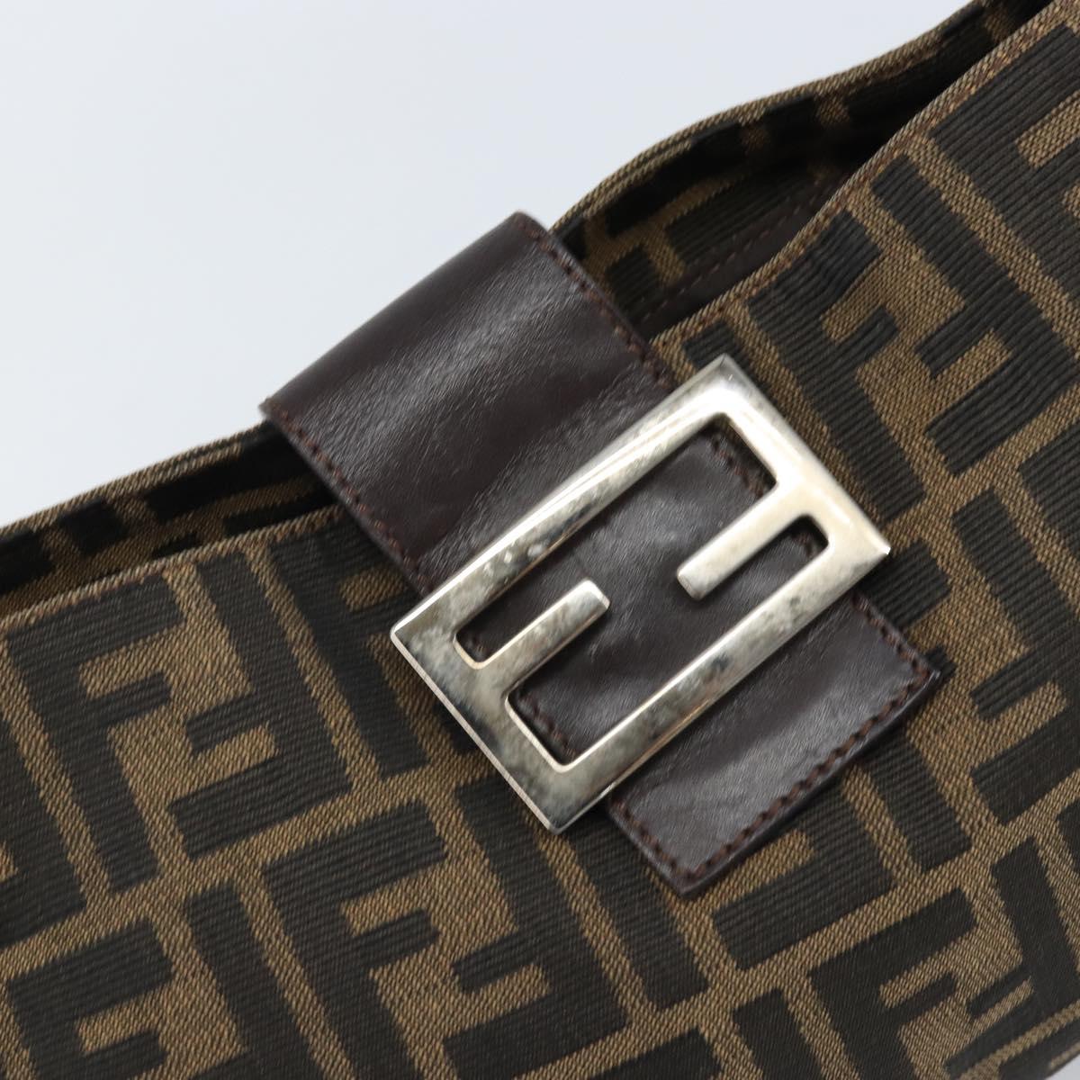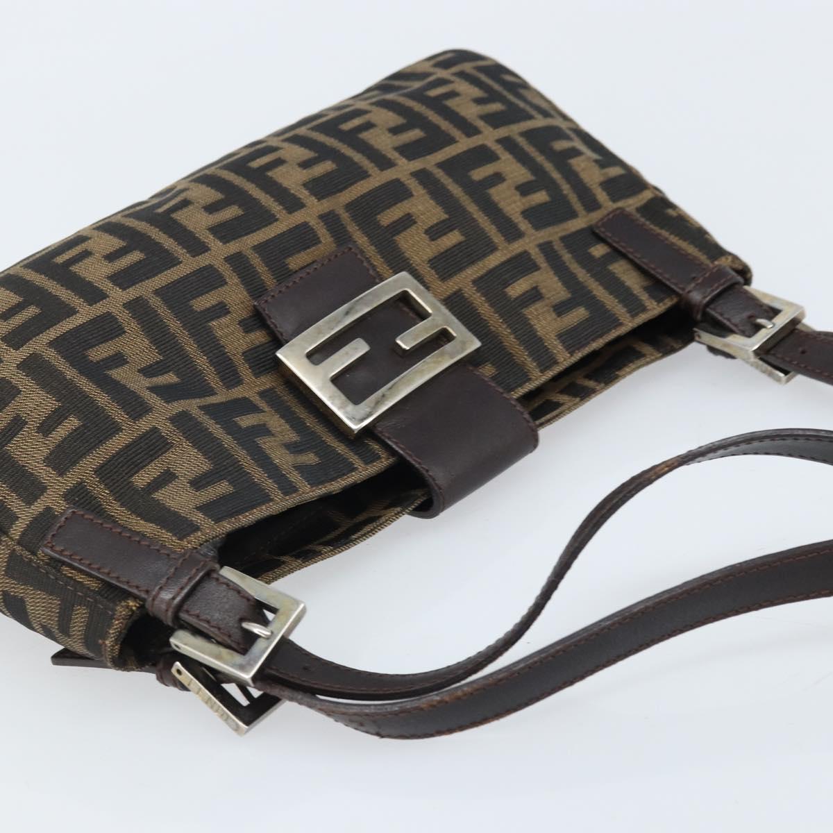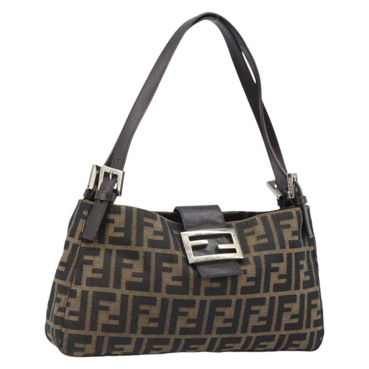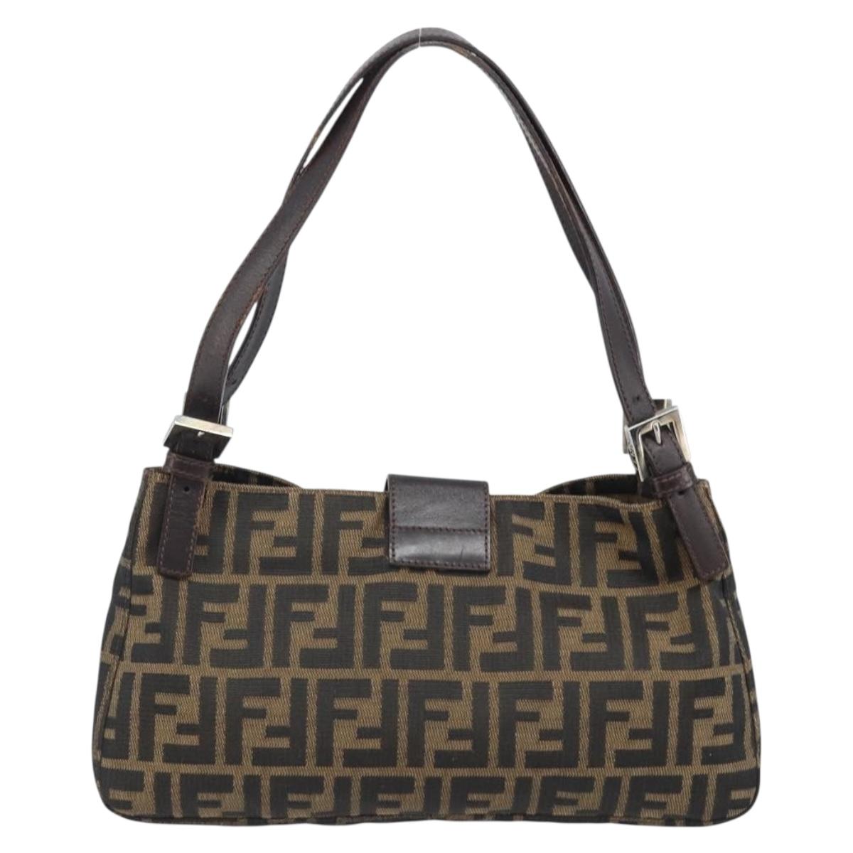 This is an authentic FENDI Zucca shoulder bag crafted of Zucca print canvas. It features a crossover snap closure, adjustable brown leather shoulder straps, and a prominent polished silver Fendi FF frontal detail closure. The interior opens to a lined interior with a pocket. 11.5"W x 6.5"H x 2"D, 7-9" handle drop