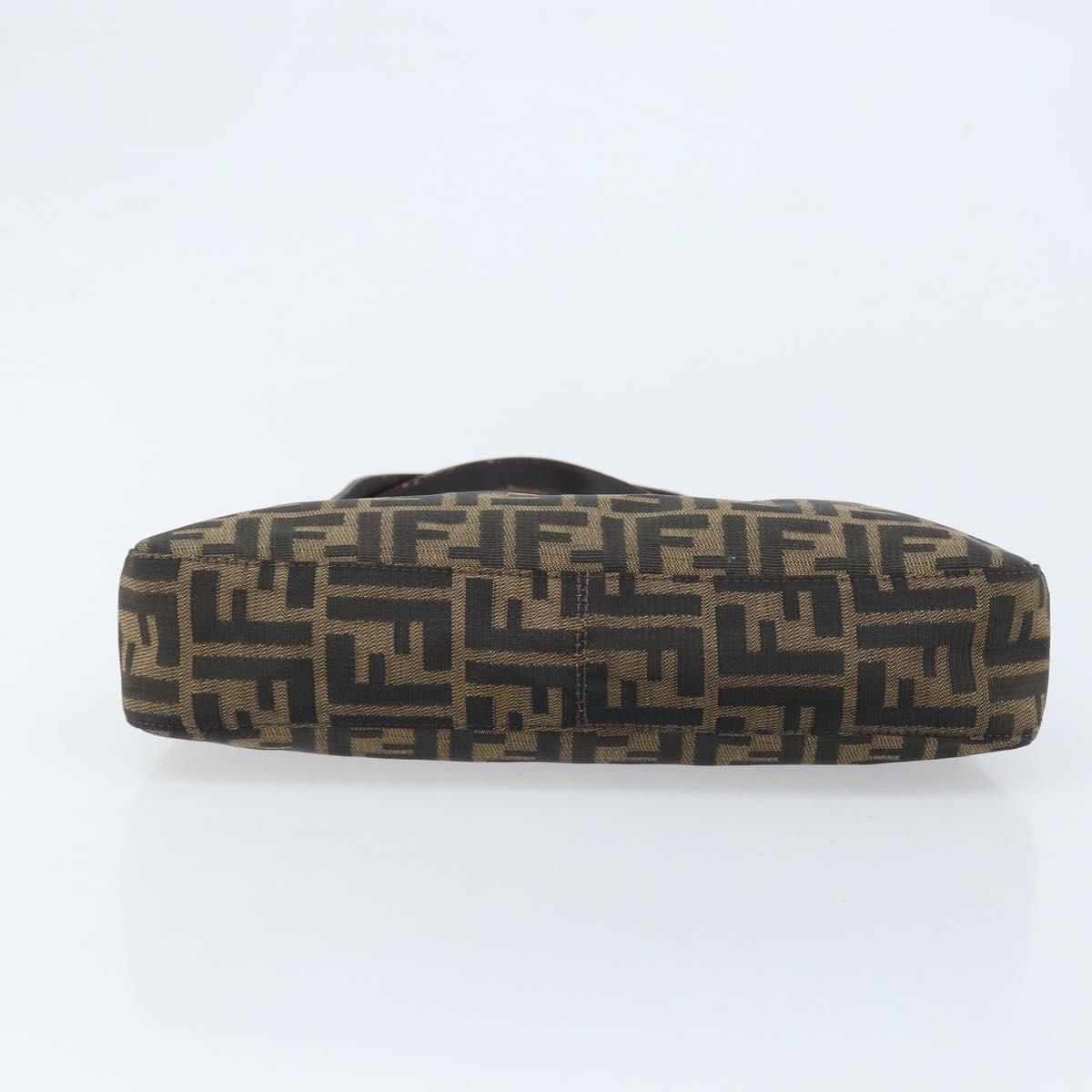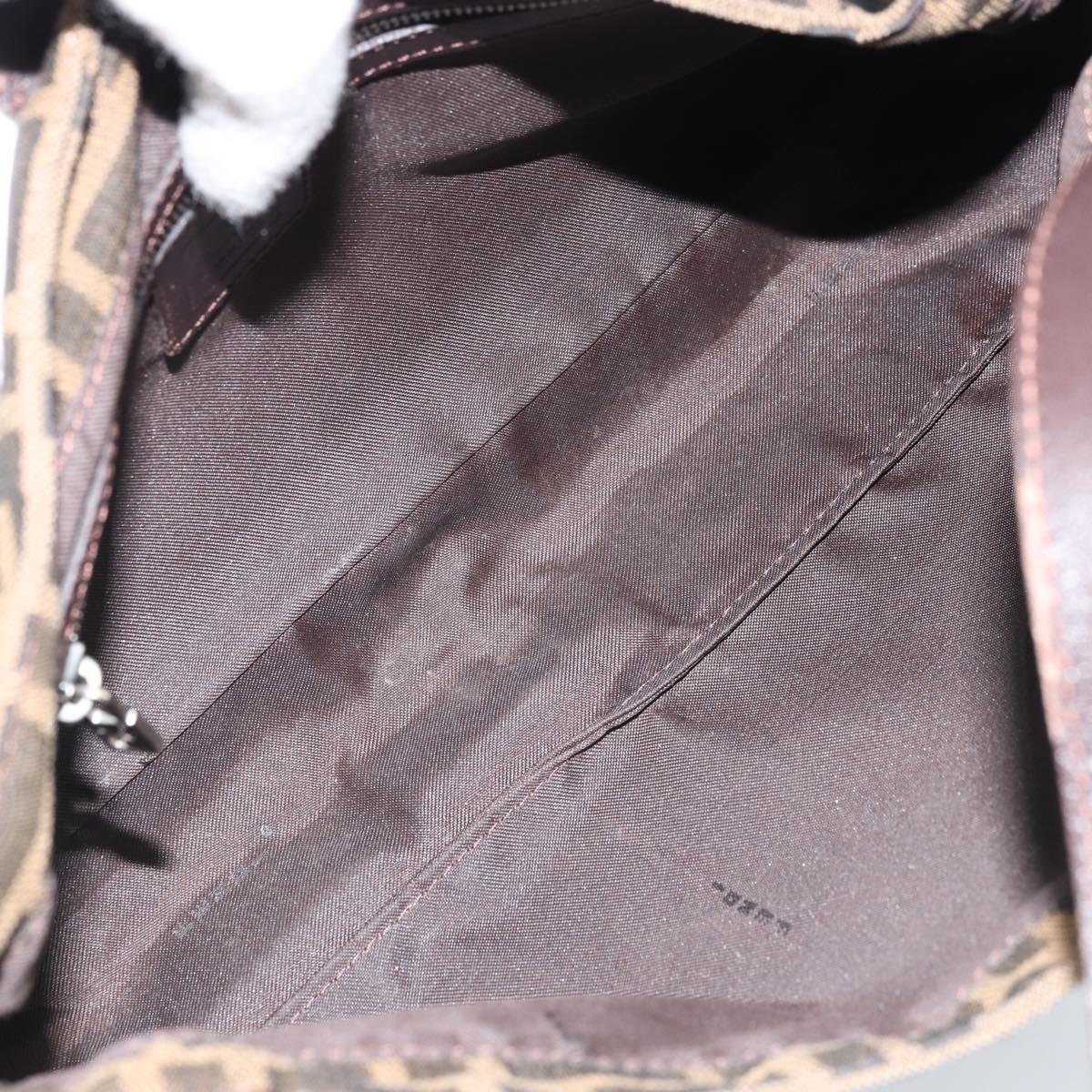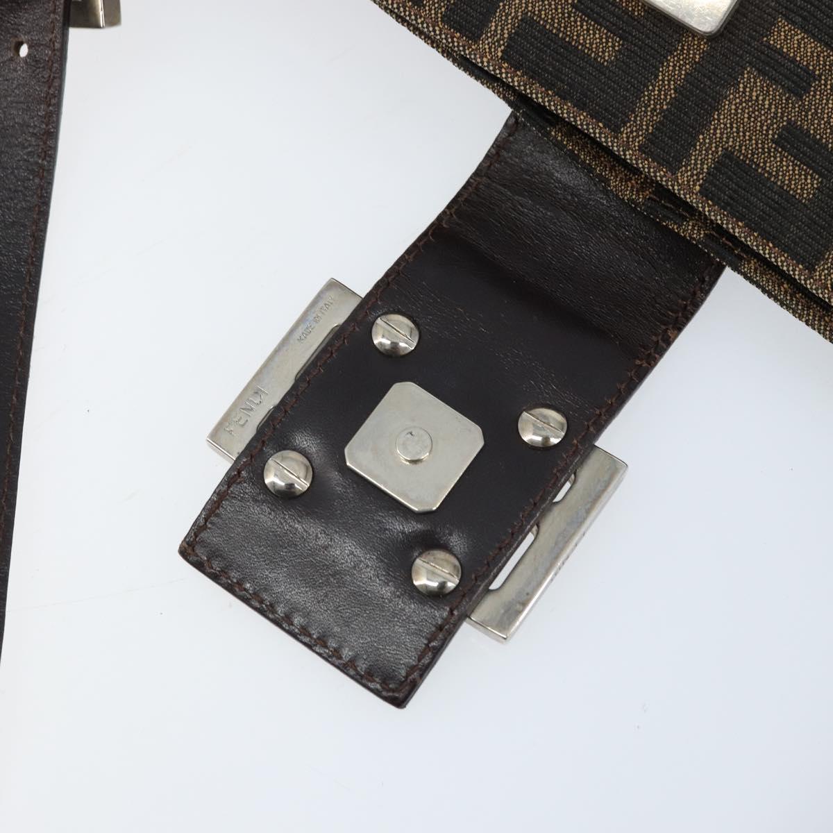 This is an authentic FENDI Zucca shoulder bag crafted of Zucca print canvas. It features a crossover snap closure, adjustable brown leather shoulder straps, and a prominent polished silver Fendi FF frontal detail closure. The interior opens to a lined interior with a pocket. 11.5"W x 6.5"H x 2"D, 7-9" handle drop