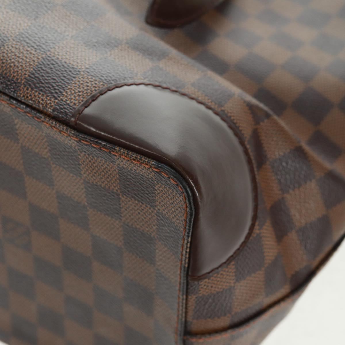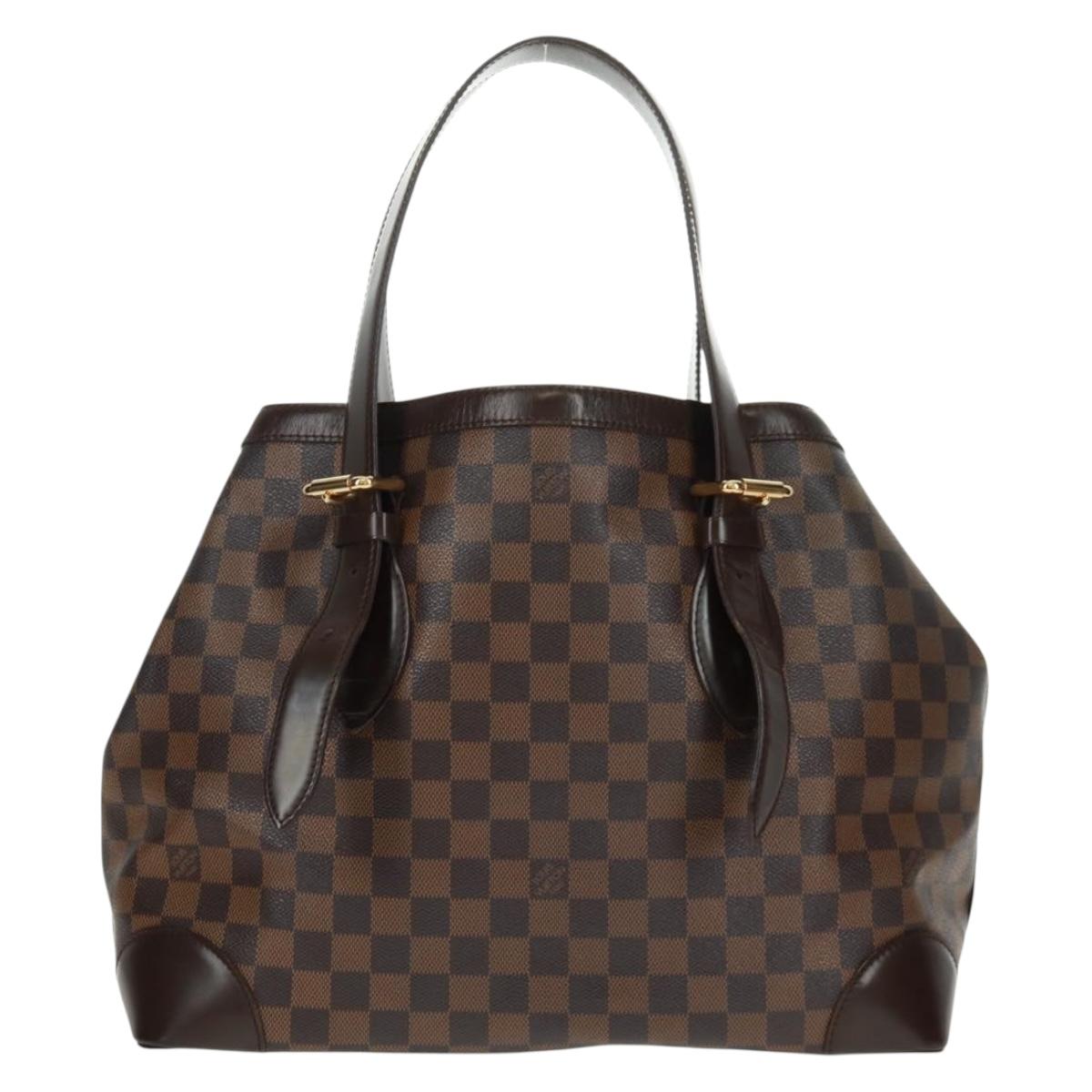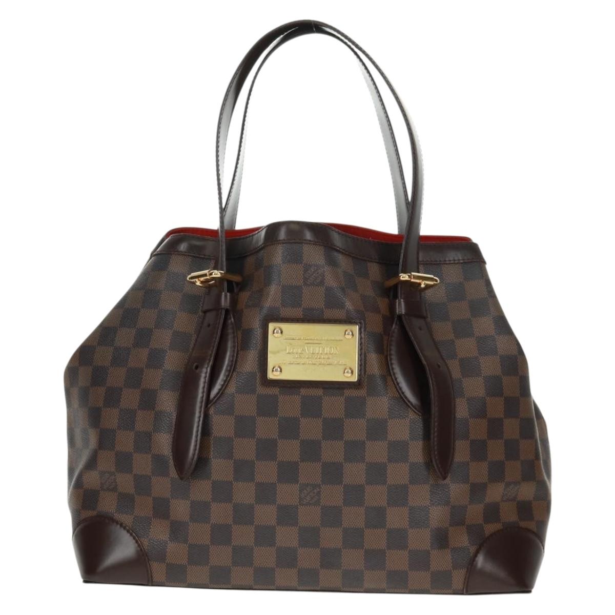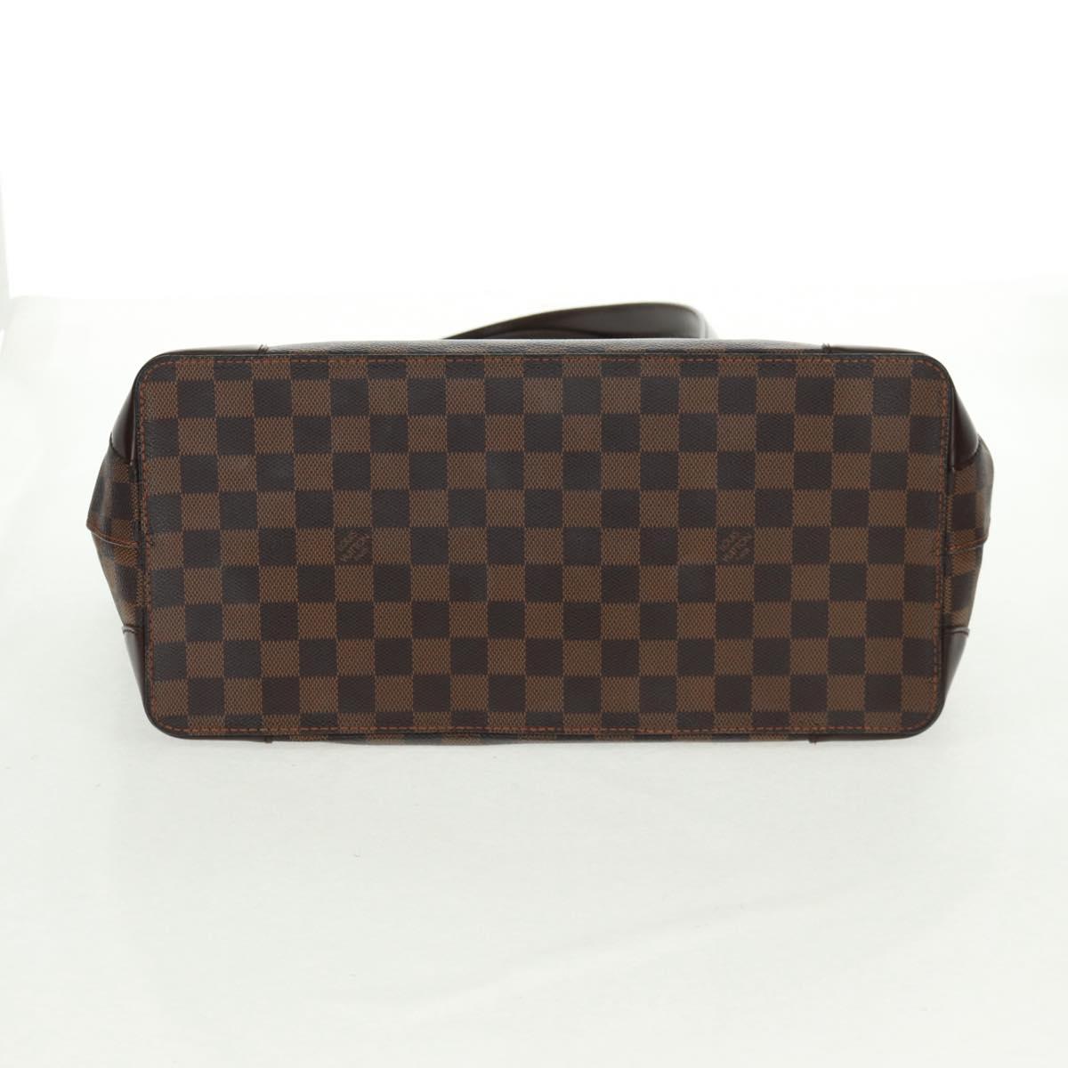 This is an authentic LOUIS VUITTON Damier Ebene Hampstead MM. This sophisticated shoulder bag is crafted of Louis Vuitton signature checkered damier canvas. This bag has complimentary chocolate brown leather trim and tall top handles with polished brass hardware. The top is open to a red microfiber interior with zipper and patch pockets.
