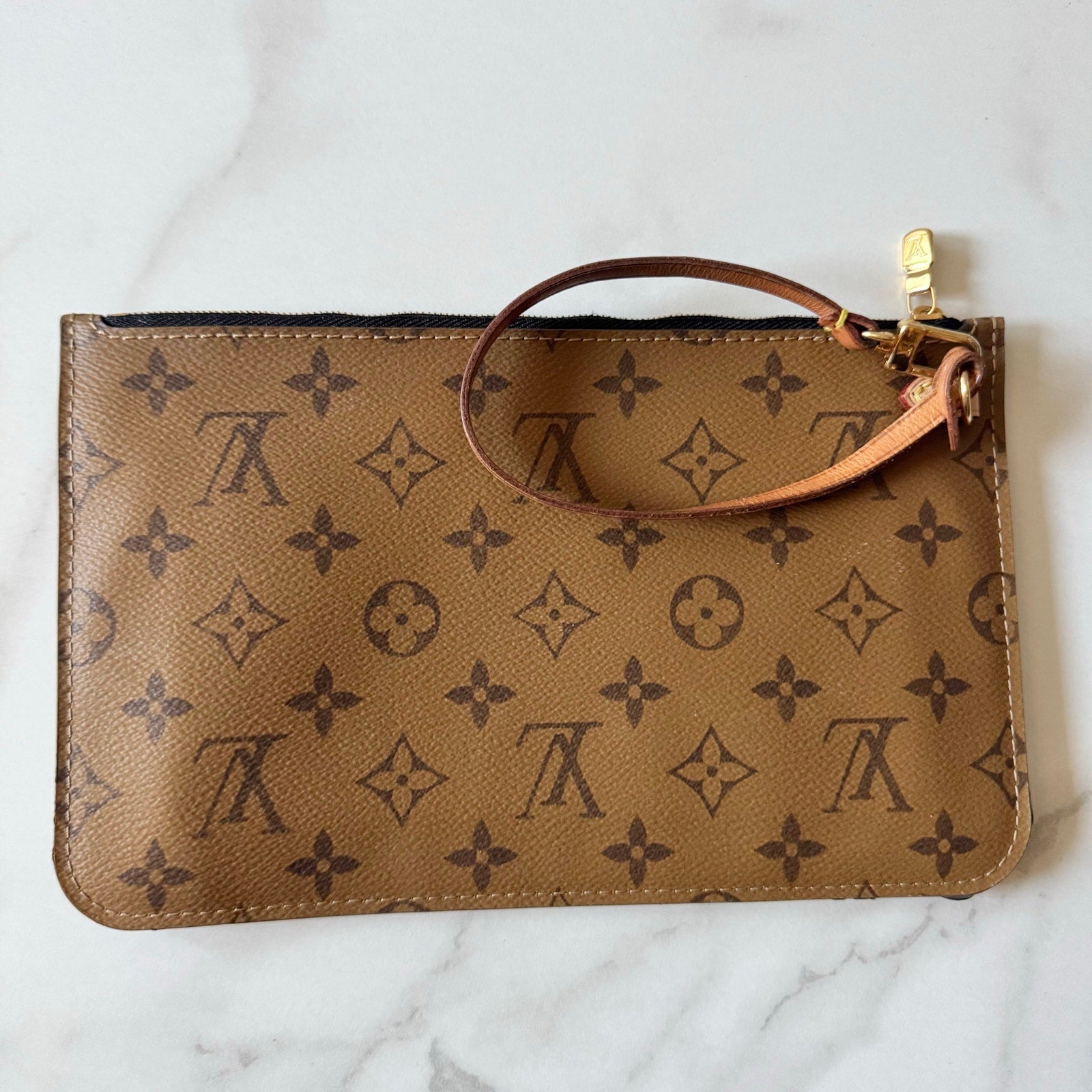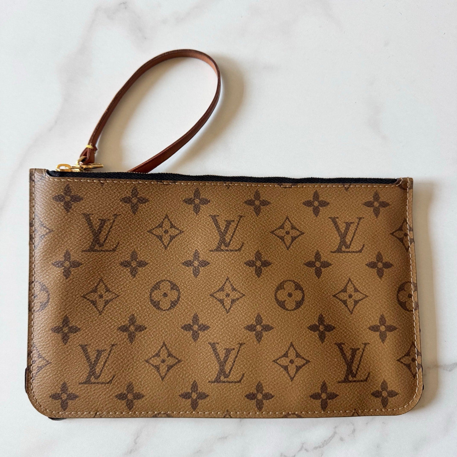 This is an authentic LOUIS VUITTON Carry It Pouch crafted of Louis Vuitton reverse monogram coated canvas with a detachable vachetta leather wrist strap. The top unzips to a black fabric interior with an internal pocket. It fits an iPhone ProMax!