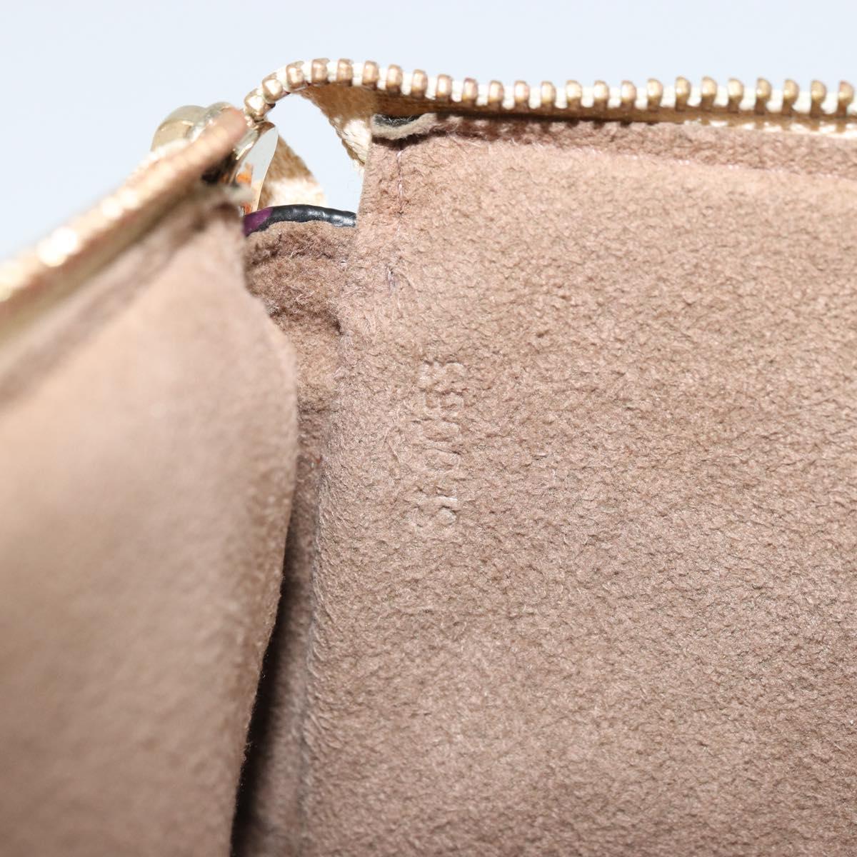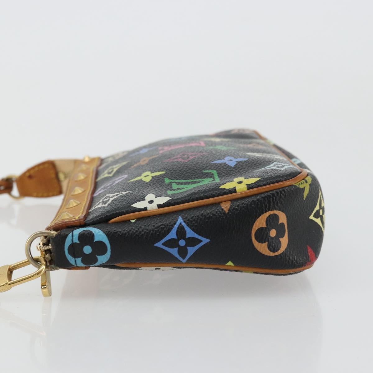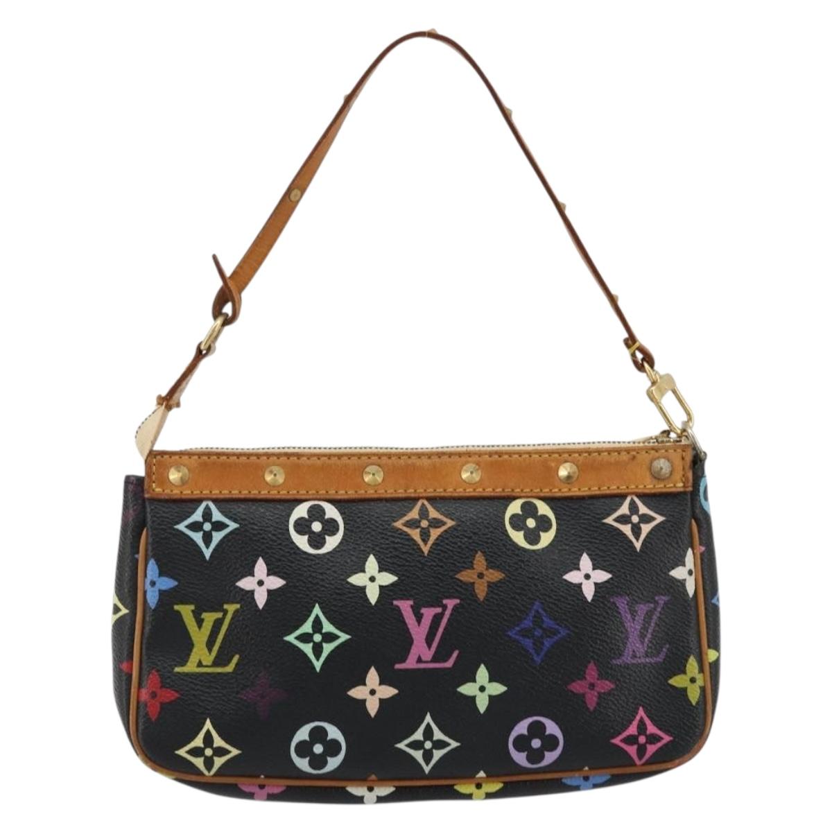 This is an authentic LOUIS VUITTON X Takashi Murakami Multicolor Noir Pochette Accessories crafted of Louis Vuitton Multicolore monogram in 33 vibrant colors on black coated canvas. The pouch features a vachetta cowhide leather studded wrist strap and matching trim. The top zipper opens to a microfiber interior.