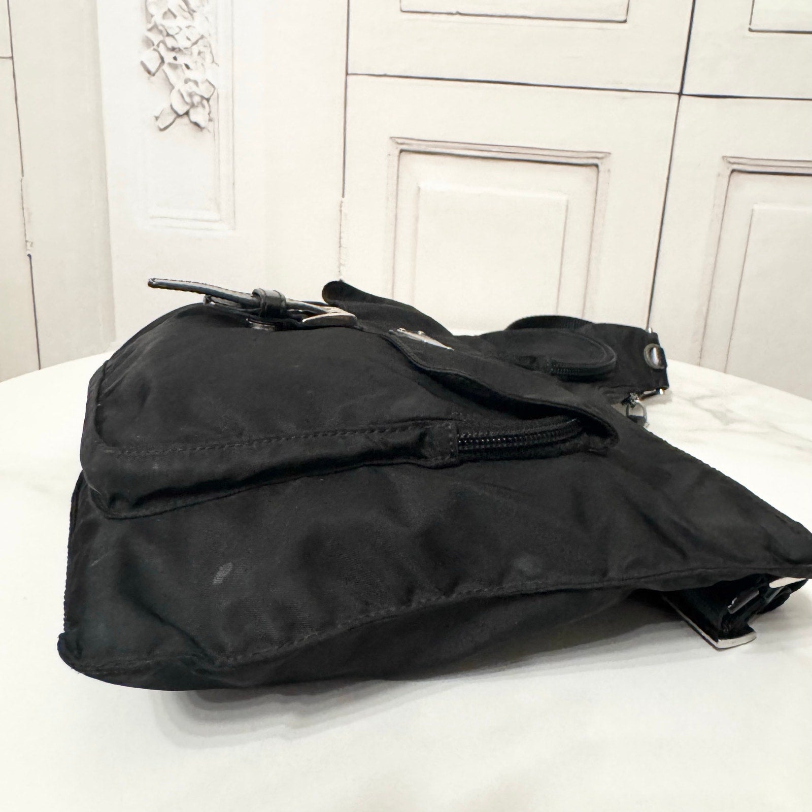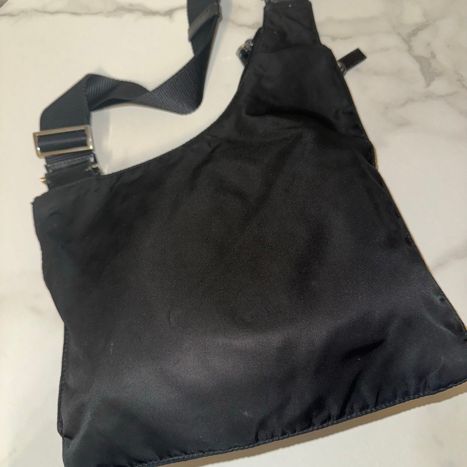 This is an authentic PRADA Nylon Vela Sling Messenger Bag crafted of fine nylon in black. The purse features a nylon cross body strap, an external zipper pocket, silver hardware and a front flap secured by a buckle and strap. The main zipper compartment has a black Prada logo jacquard interior with a zipper pocket.