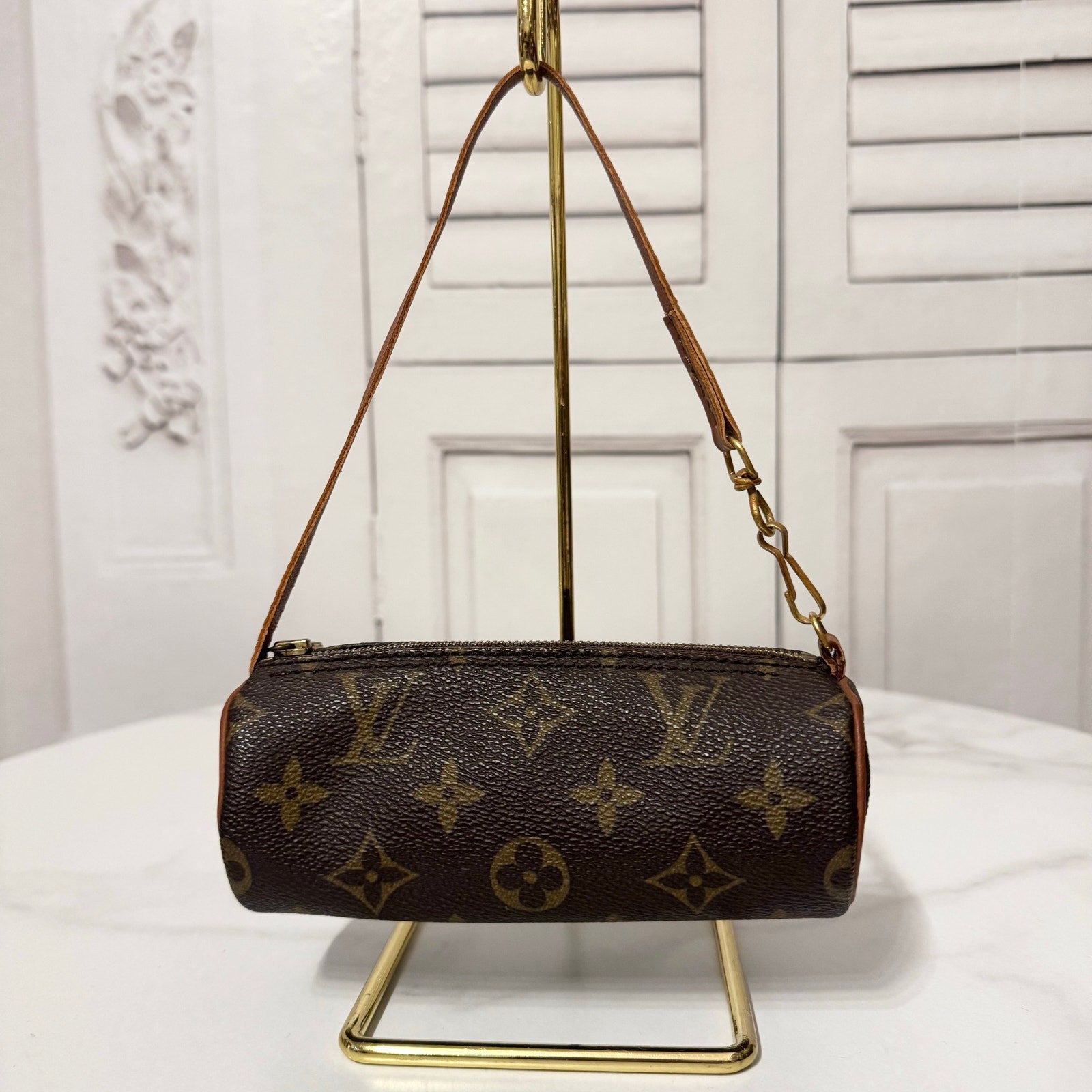 This is an authentic vintage LOUIS VUITTON Monogram Mini Papillon. The charming pochette is the smaller version of the popular Papillon handbag. It is crafted of classic Louis Vuitton monogram on toile canvas. The pochette has leather piping and a matching strap with a brass clasp end, which can be secured to your handbag. The top zips open to a terra cotta cross-grain leather interior.