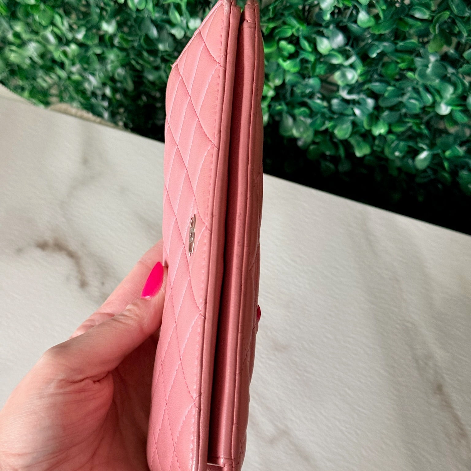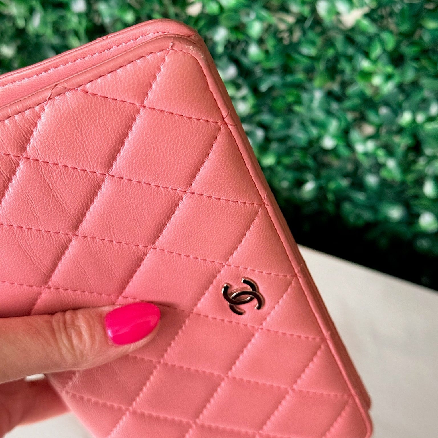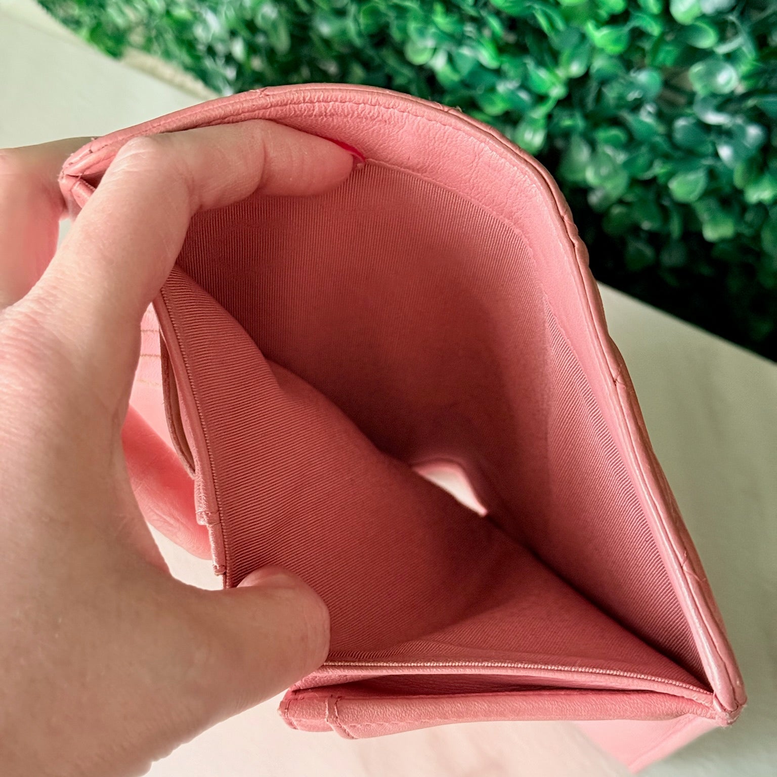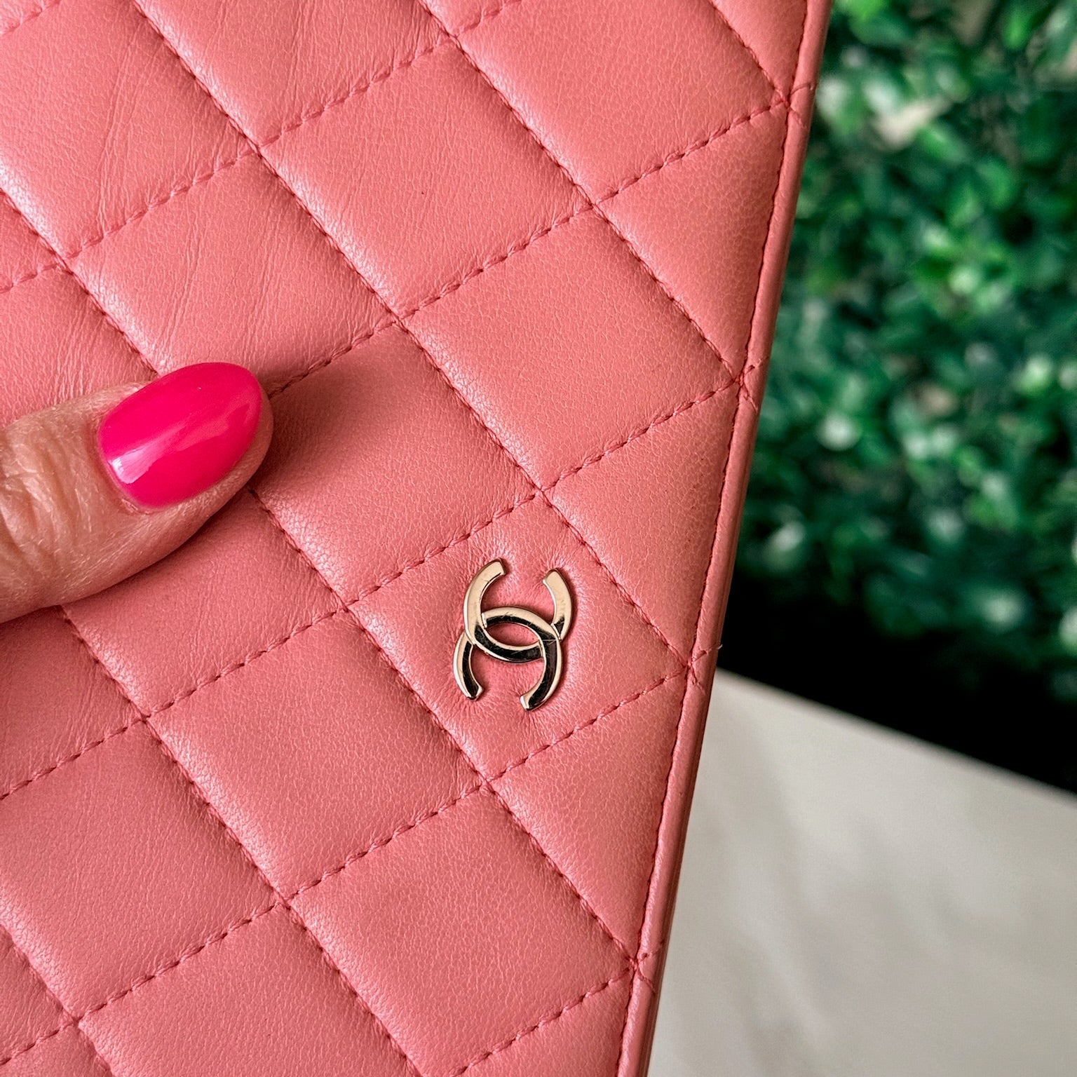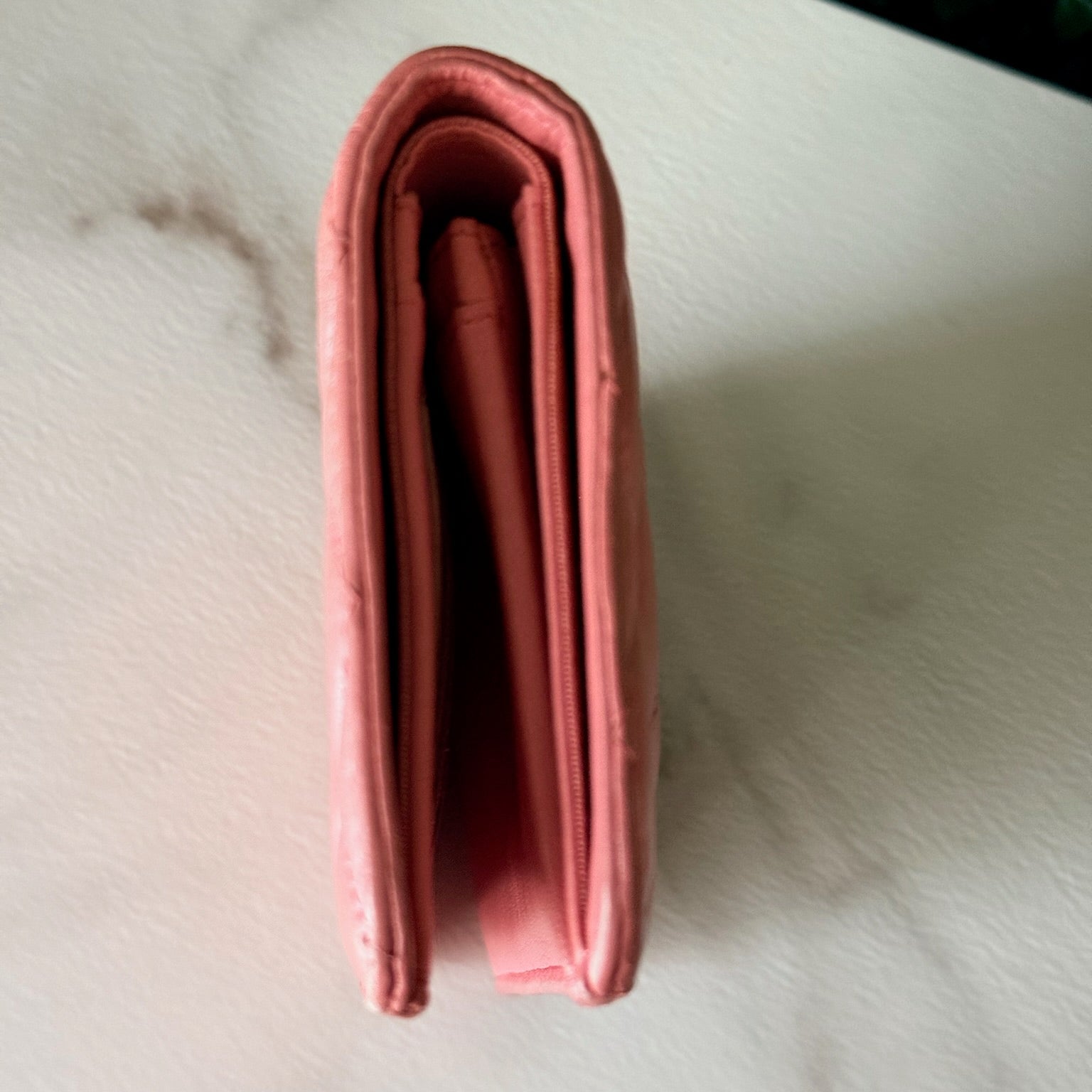 This is an authentic CHANEL Wallet crafted of pink quilted leather that opens to a leather interior with card slots, patch pockets, and a zipper compartment.