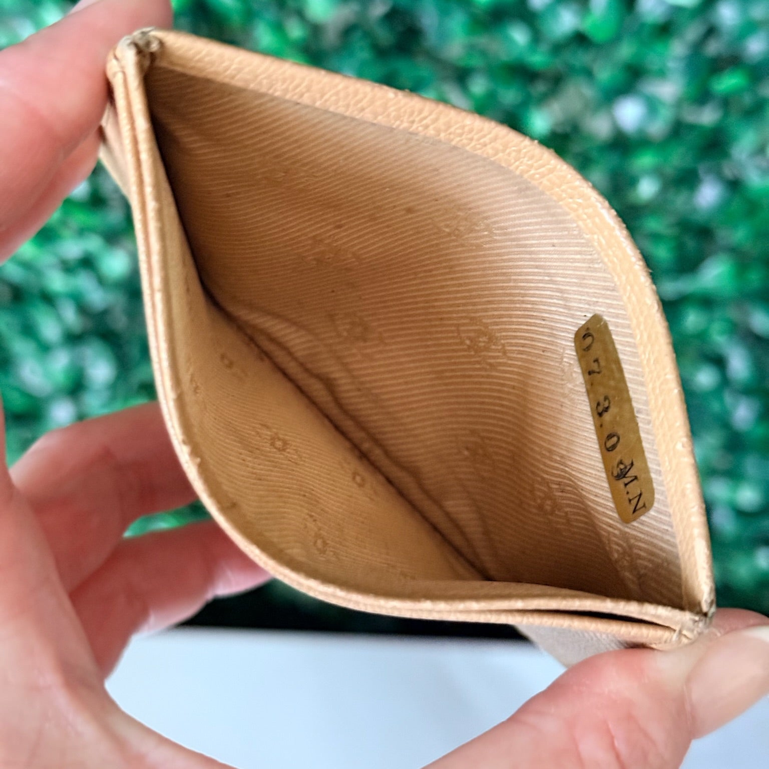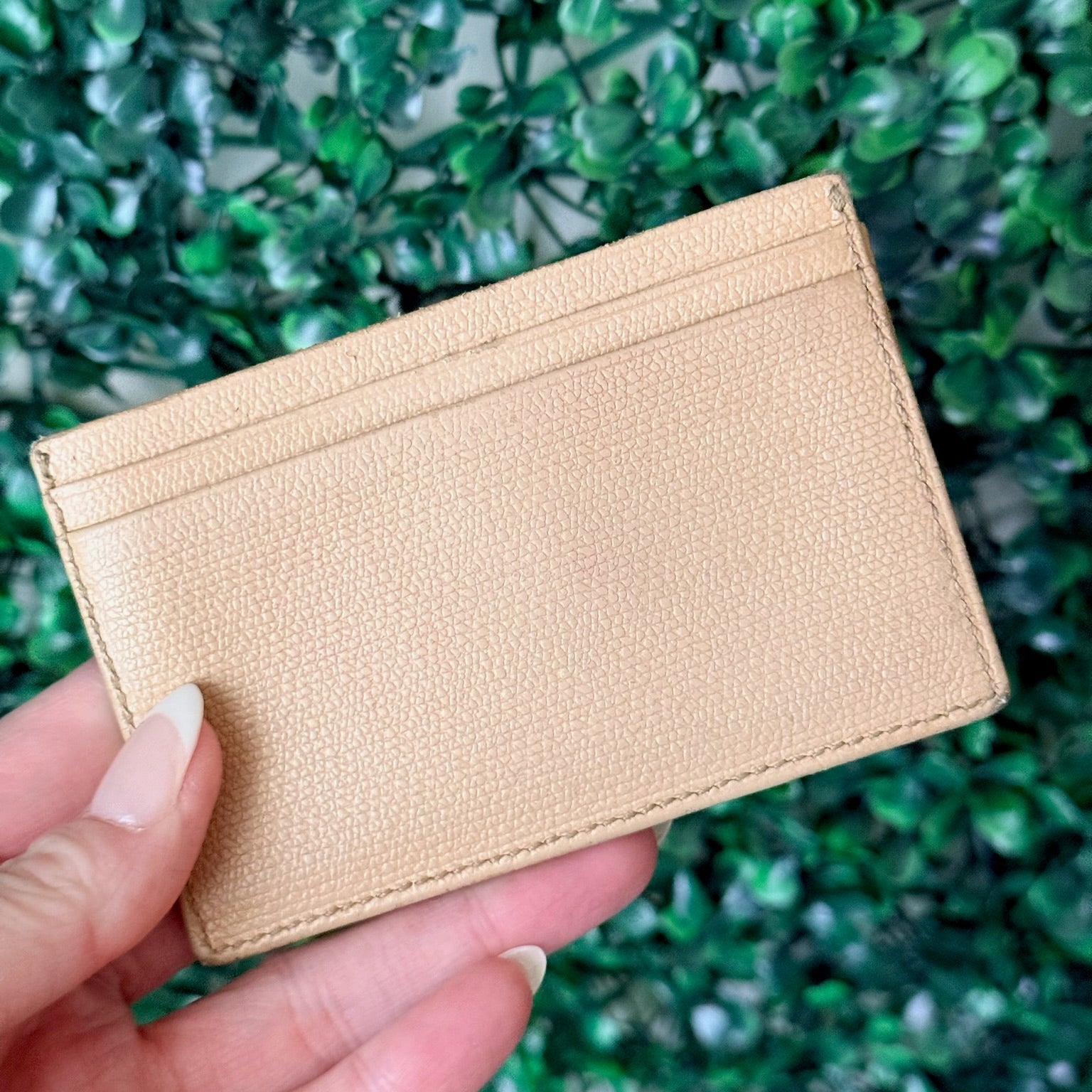 This is an authentic CHANEL Card Holder crafted of beige leather with a card slot on either side of the main compartment and an enamel CC logo on the front.