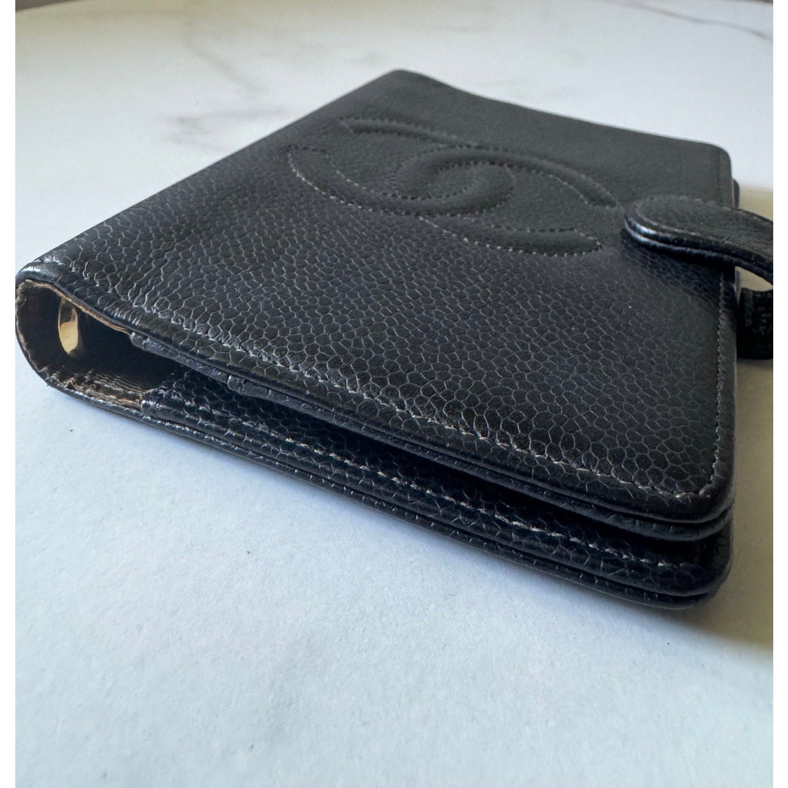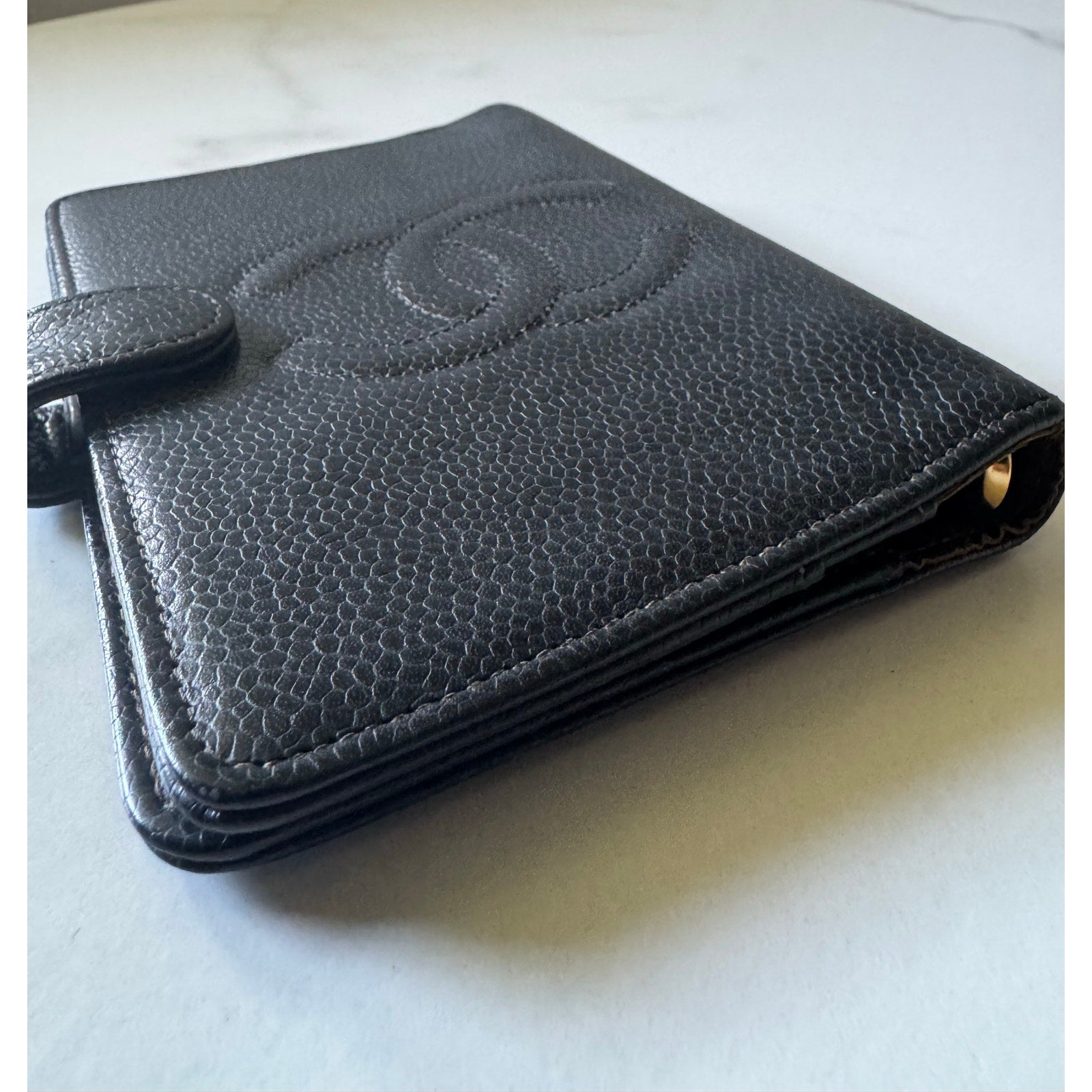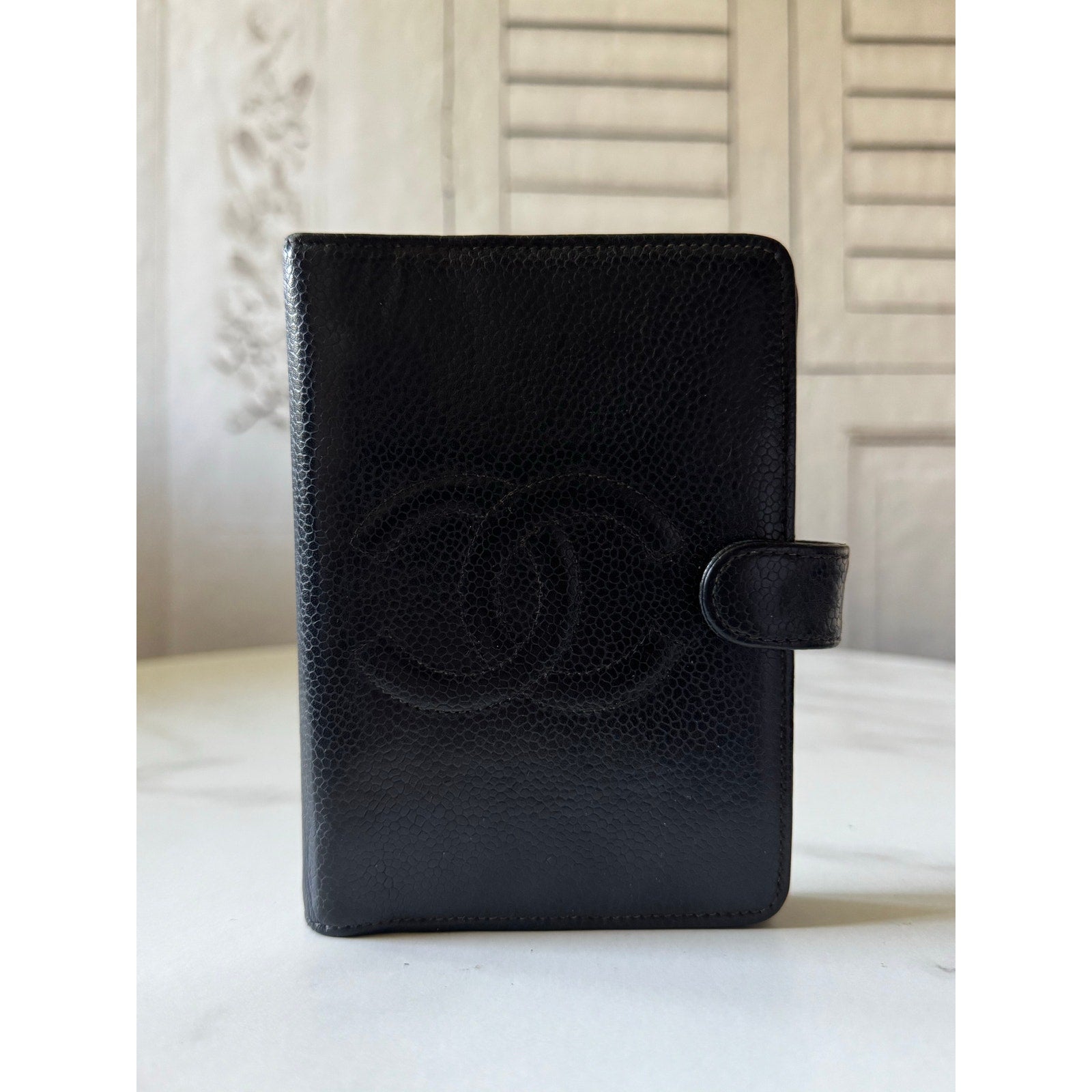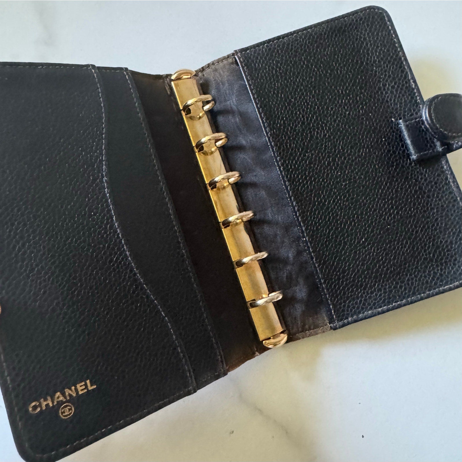 This is an authentic Chanel Small Ring Agenda Cover featuring an exterior of durable black caviar leather held by a snap closure. It opens to an leather interior of with three large pockets, and a brass 6-ring binder. Includes 2 full color custom laminated inserts and paper.