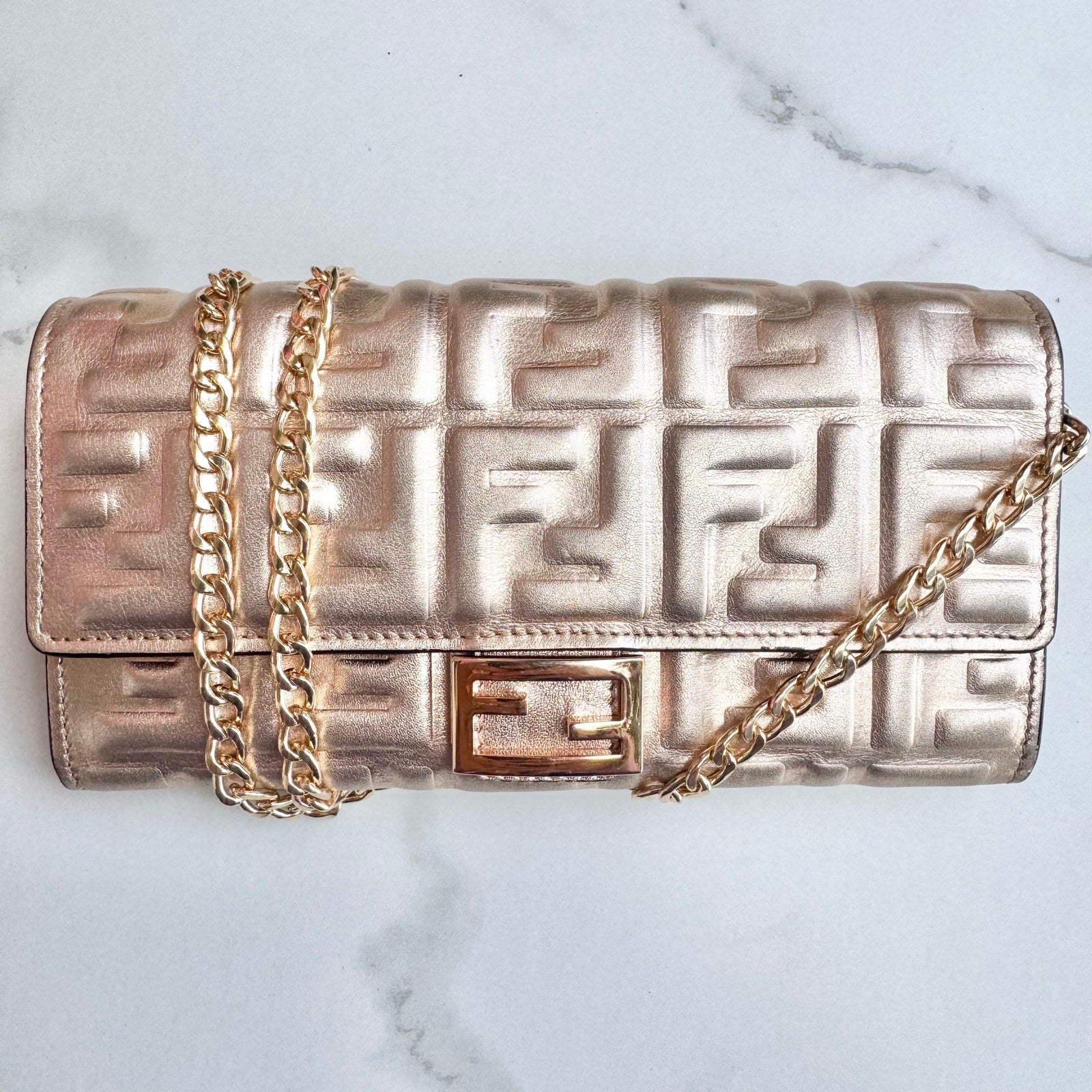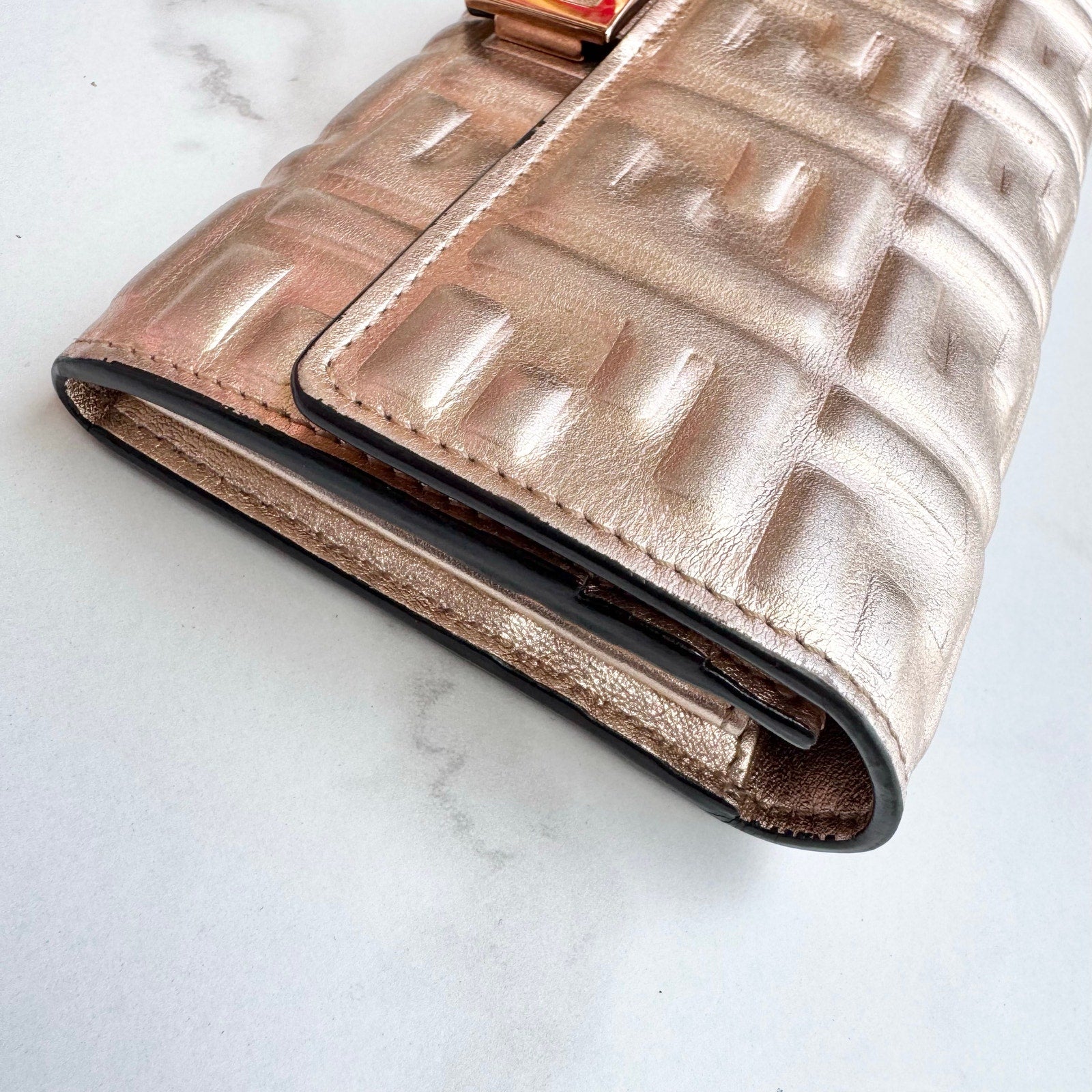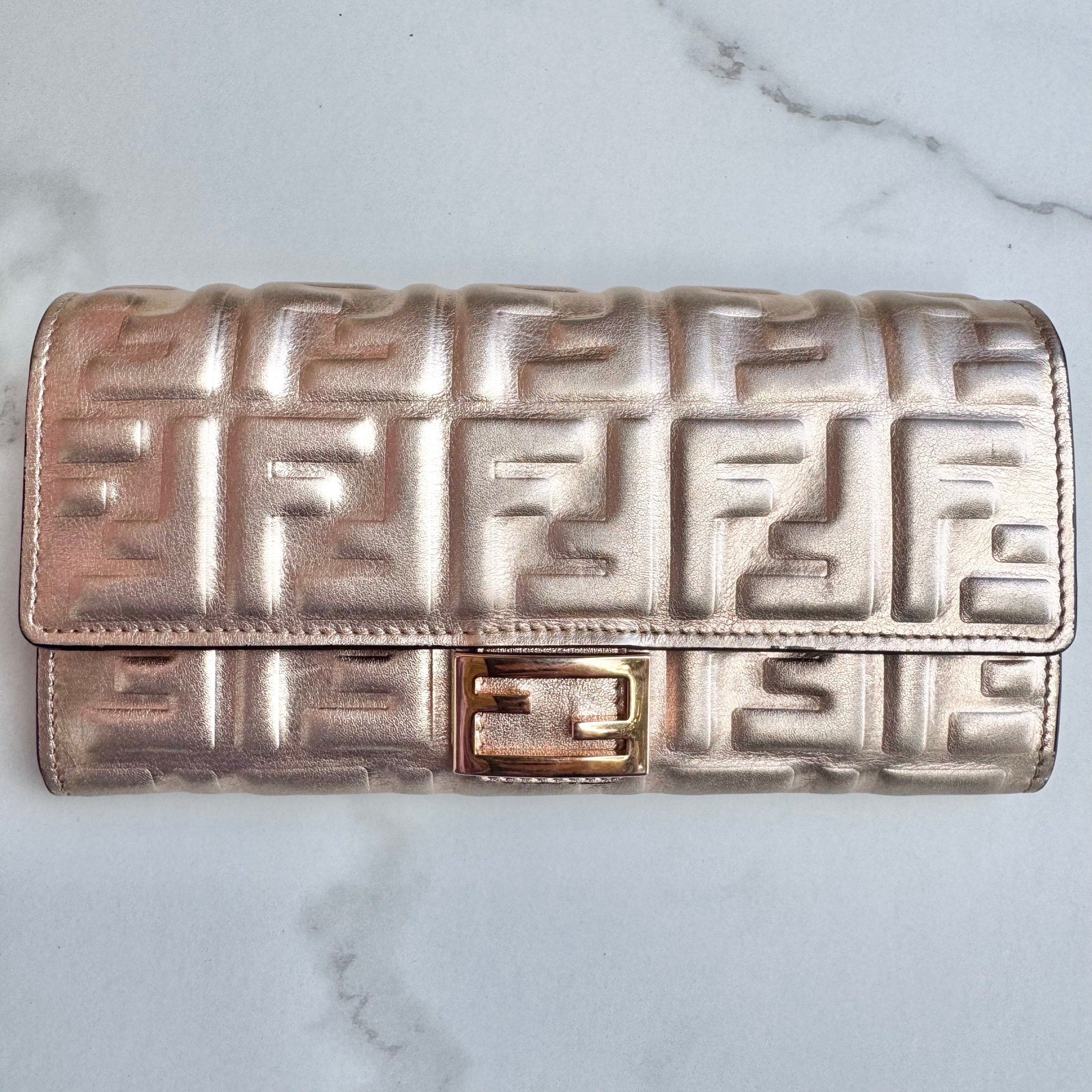 This is an authentic Fendi wallet crafted of metallic rose gold FF embossed calfskin. It features a light gold metal embellishment on the front flap and opens to a leather interior with patch pockets, card slots, and a zipper compartment. Includes non-branded crossbody chain.