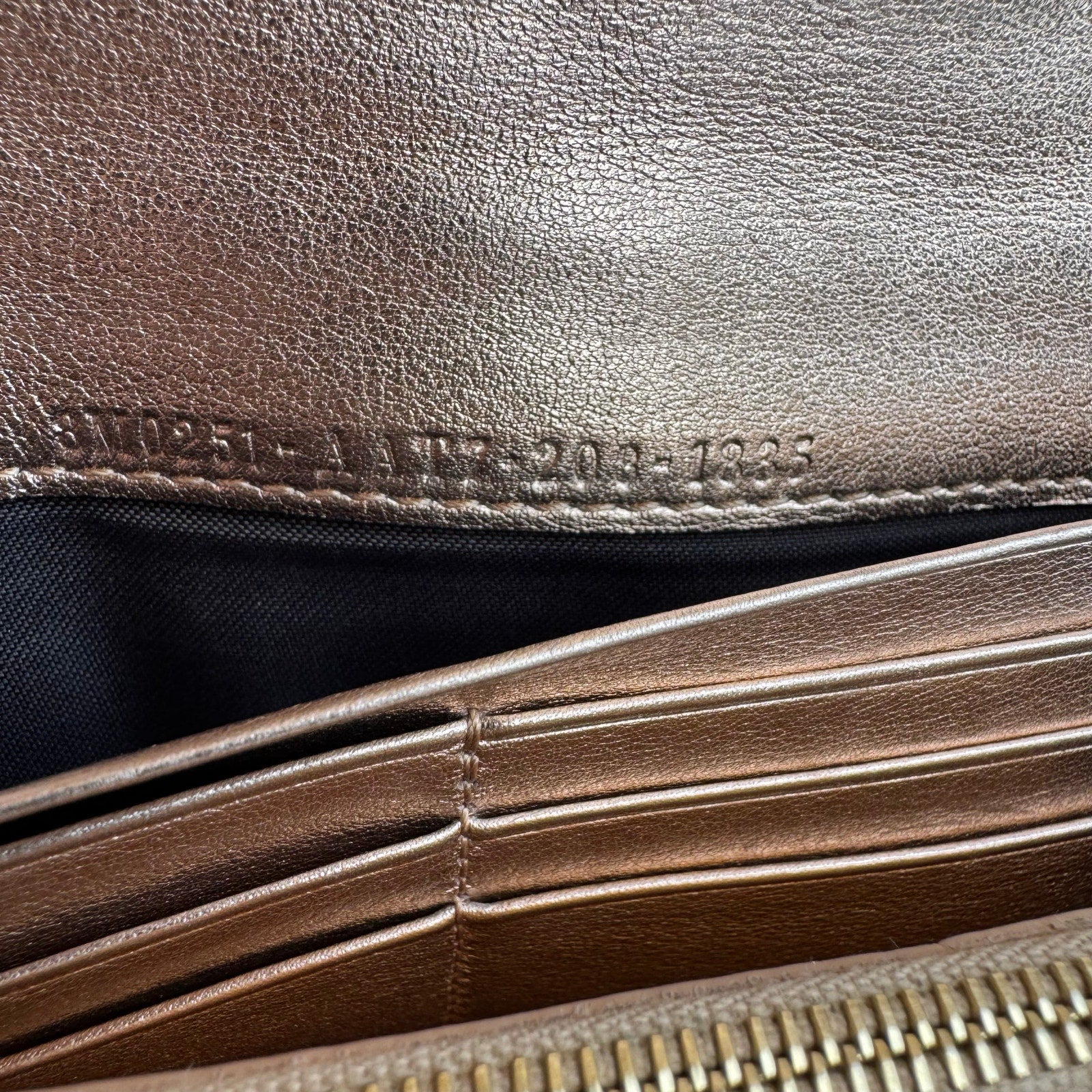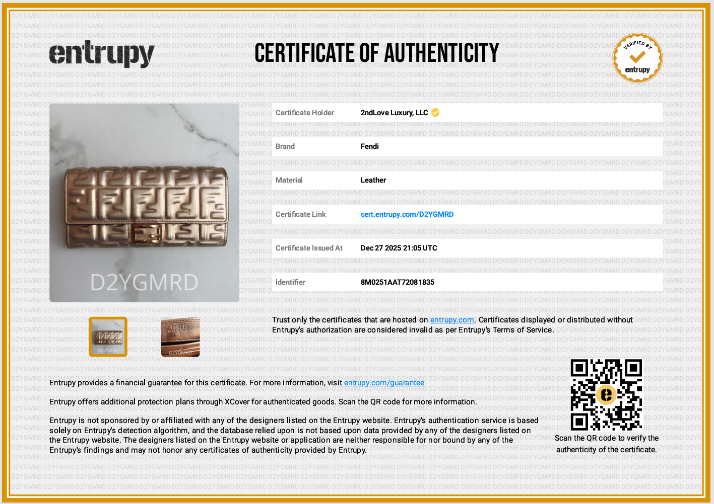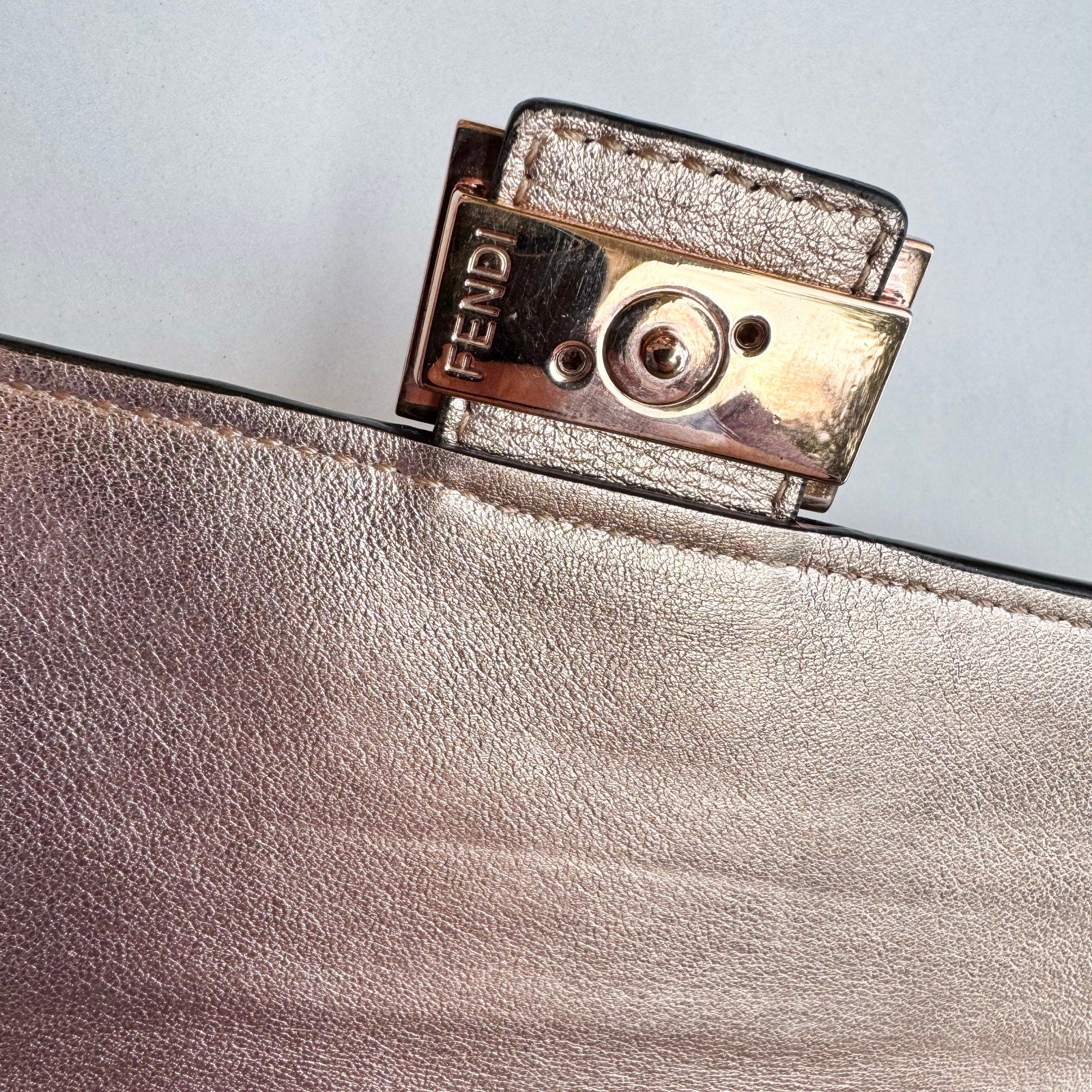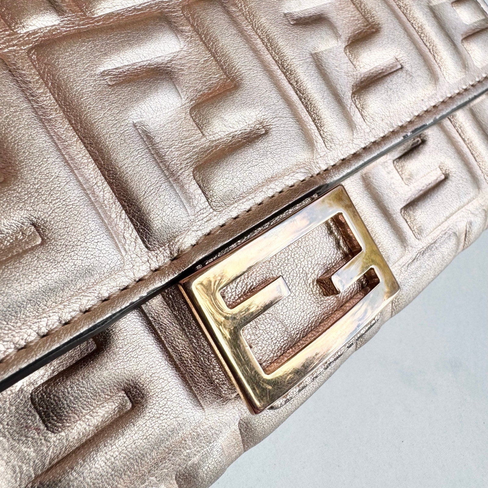 This is an authentic Fendi wallet crafted of metallic rose gold FF embossed calfskin. It features a light gold metal embellishment on the front flap and opens to a leather interior with patch pockets, card slots, and a zipper compartment. Includes non-branded crossbody chain.