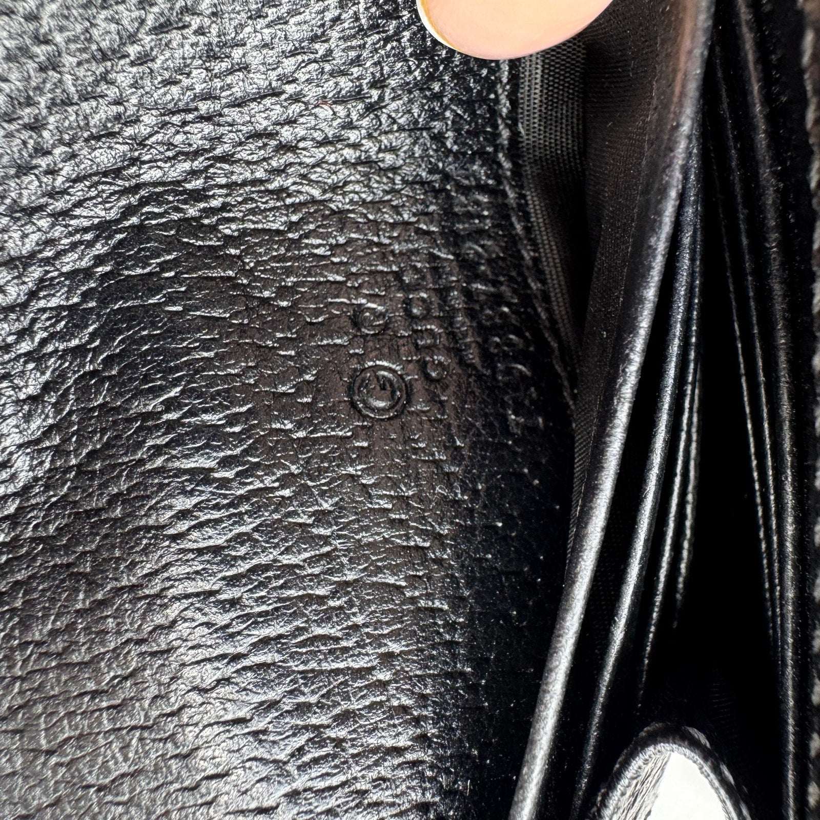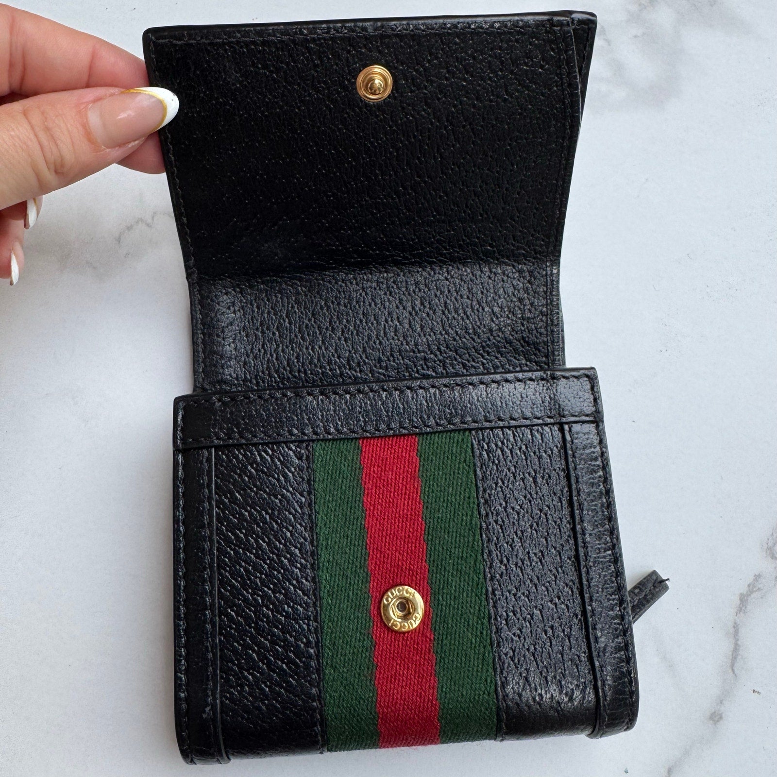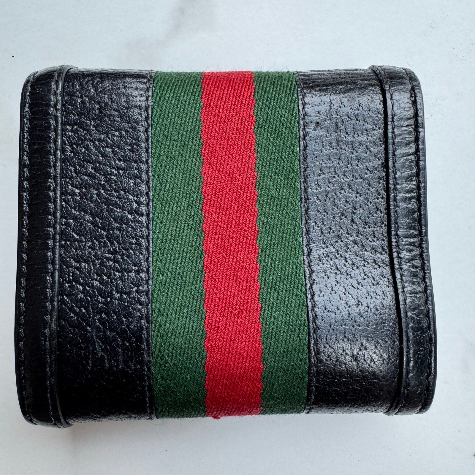 This is an authentic GUCCI Textured Dollar Calfskin Web Ophidia Wallet in Black. This stylish wallet is crafted of calfskin leather in black with a green and red stripe. This wallet features a snap button closure in gold. The flap opens to a black leather interior with card slots, a coin compartment and a bill compartment.