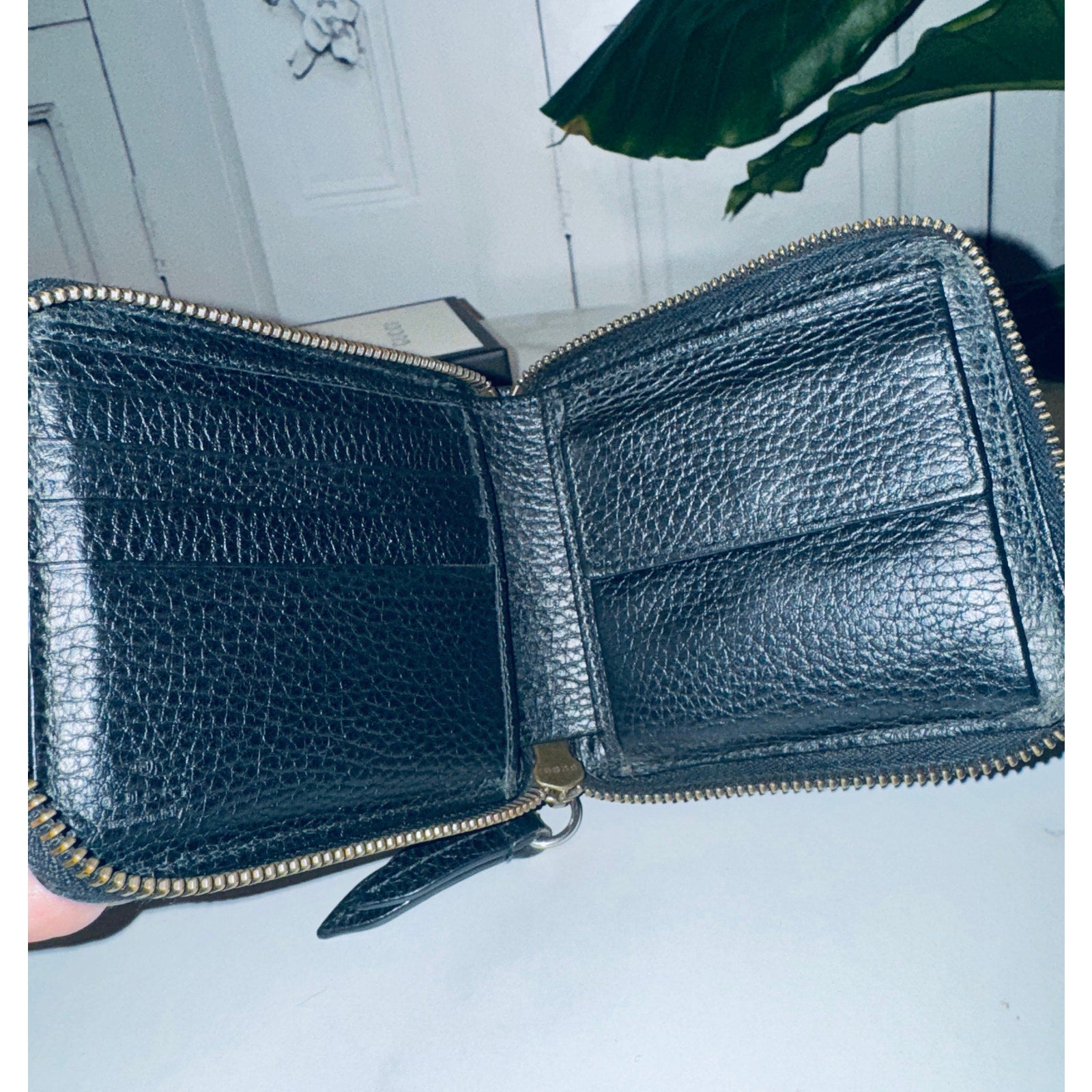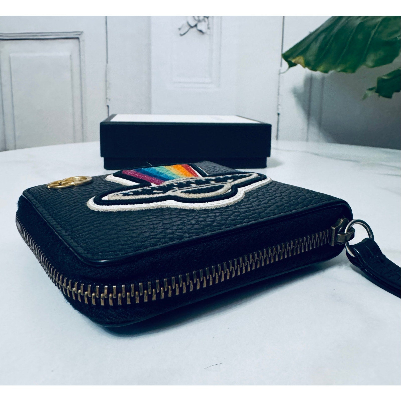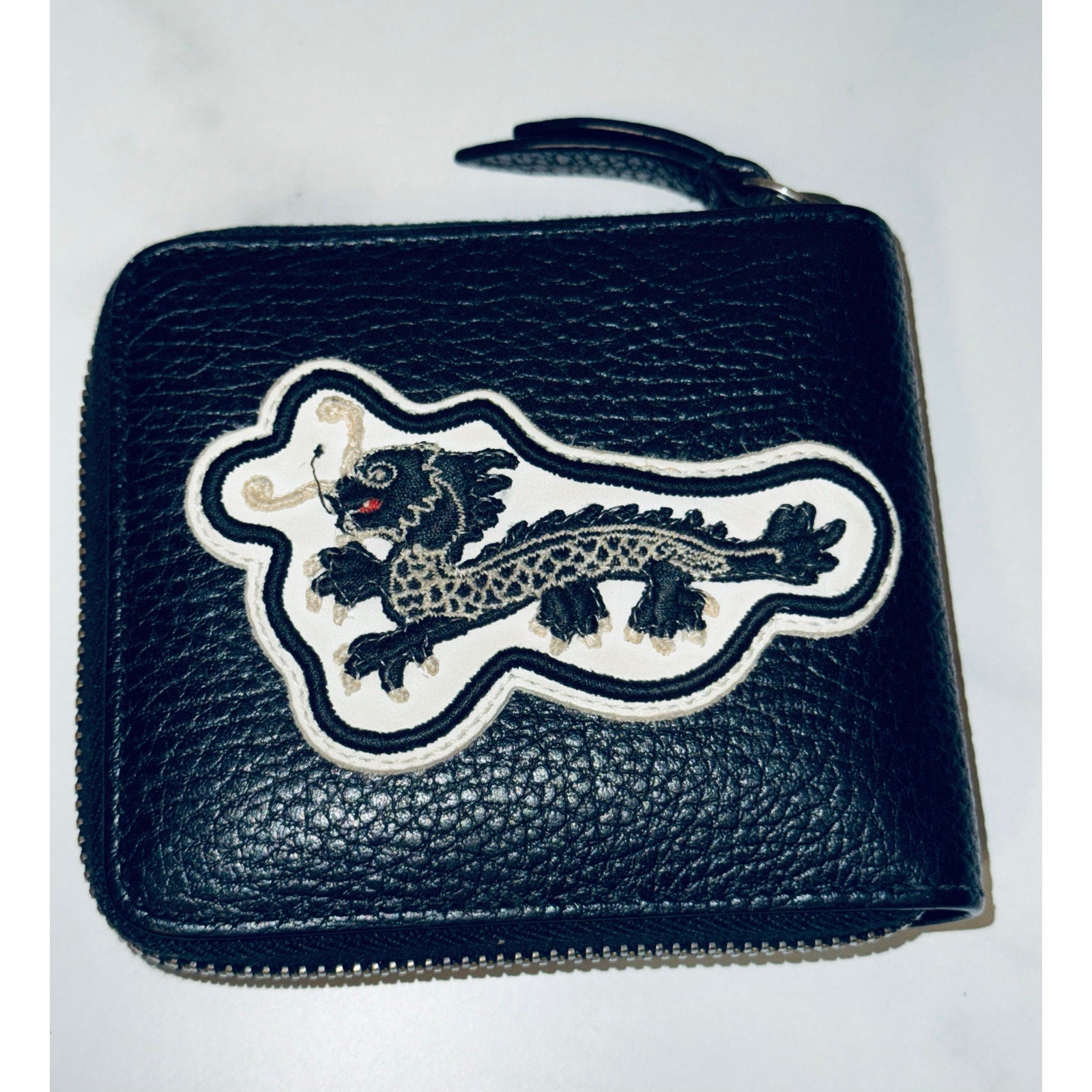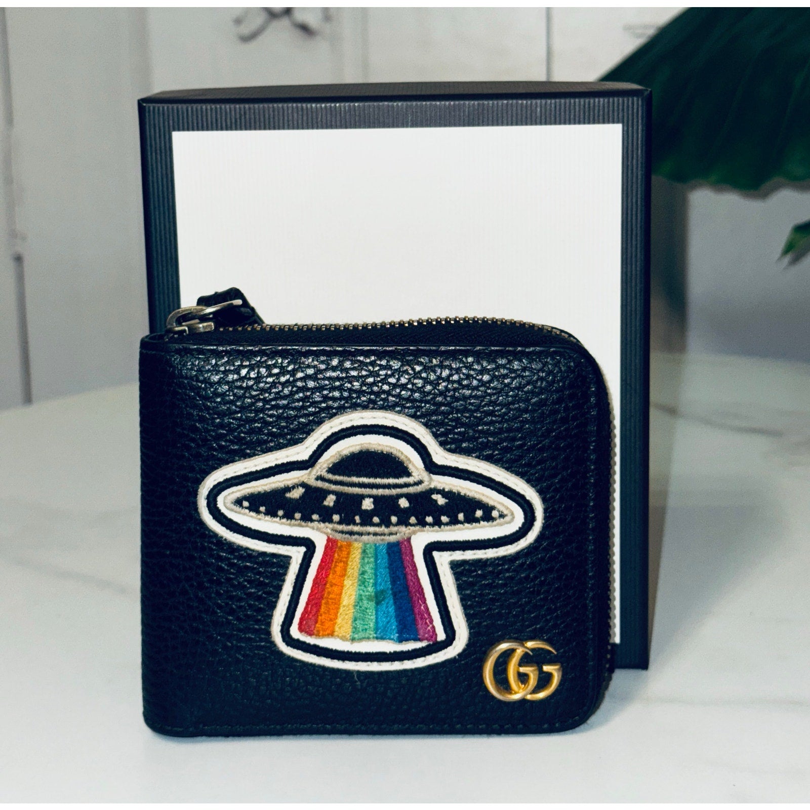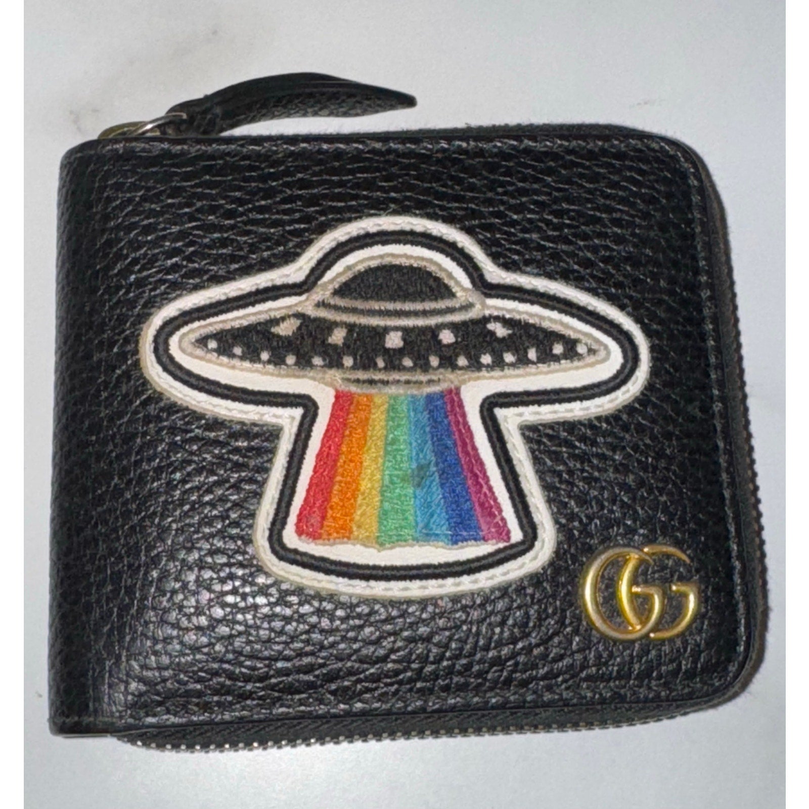 This is an authentic GUCCI Courier Embroidered UFO Zip Around Men's Wallet. This stylish wallet is crafted of black calfskin leather. This card case features UFO and dragon patches. The wallet opens to card slots and a billfold.