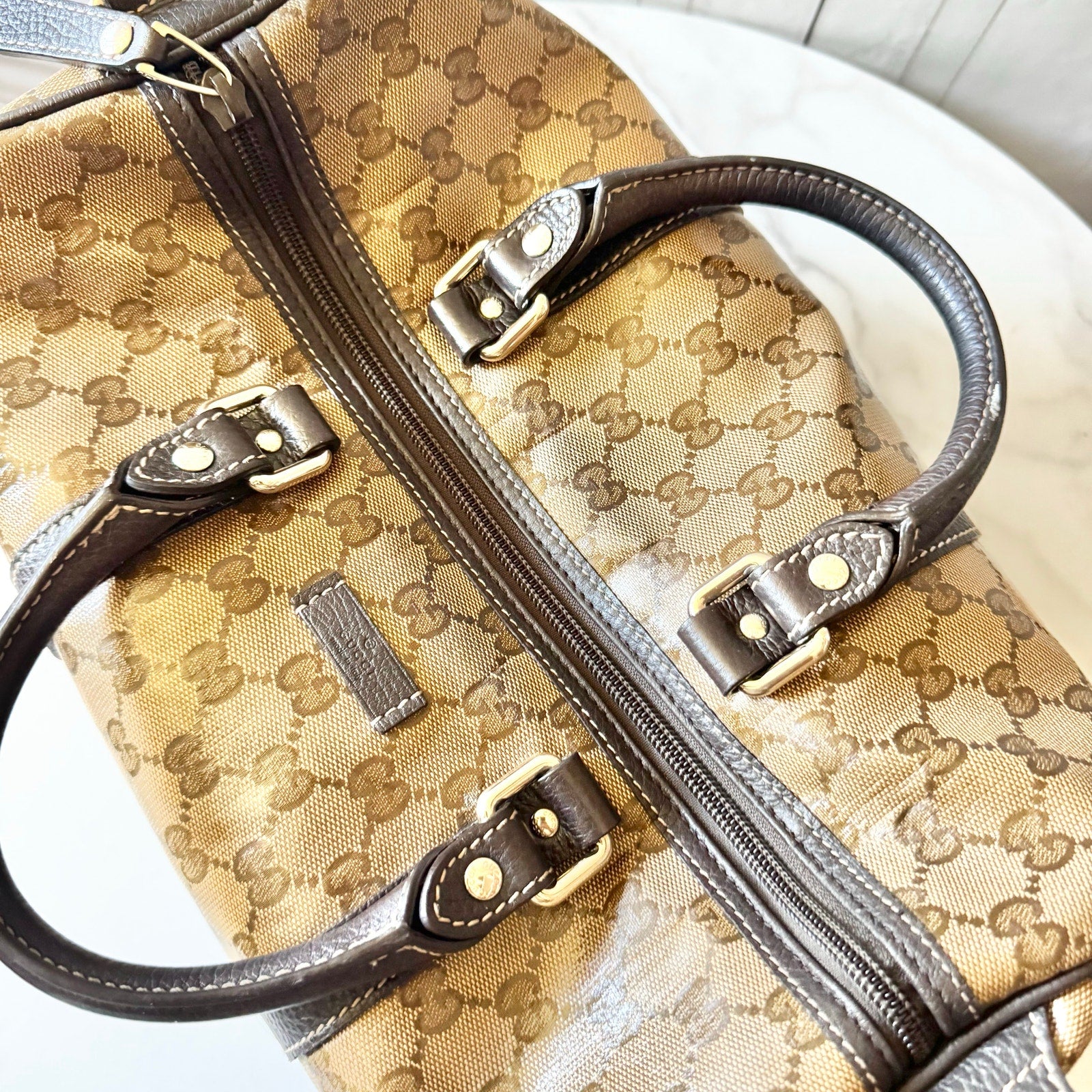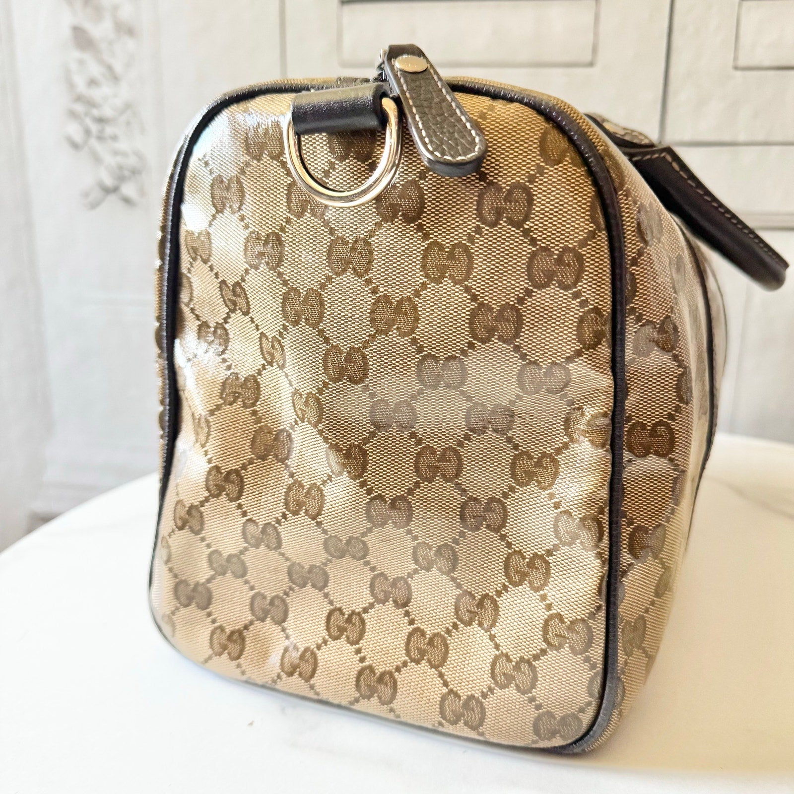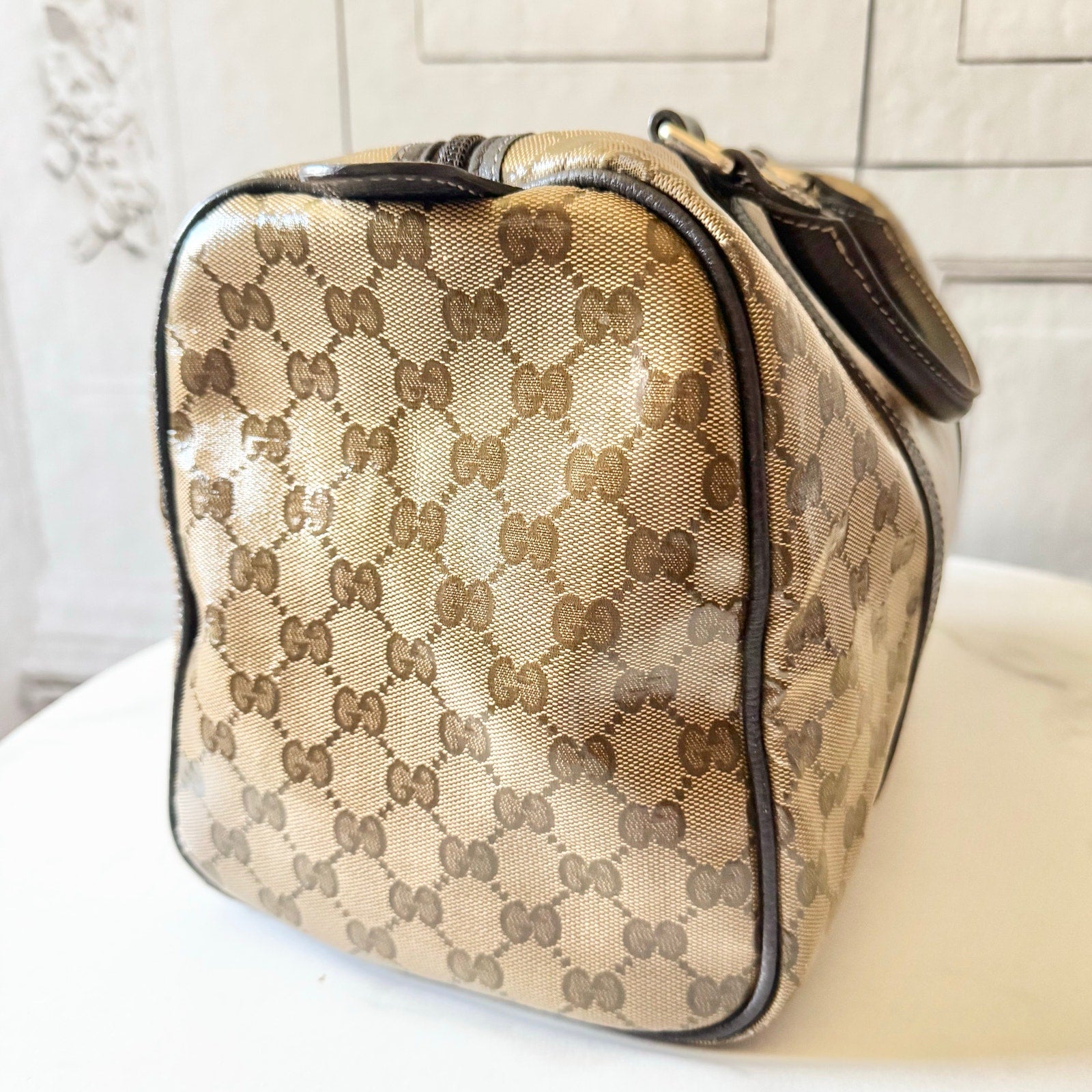 This is an authentic GUCCI Crystal Monogram Medium Joy Boston in Dark Brown. This chic Boston style tote is finely crafted of coated beige Gucci GG monogram canvas. The bag features chocolate brown cowhide leather trim and rolled top handles with polished light gold hardware. The top zipper opens to a mocha brown fabric interior with a hanging patch pocket.