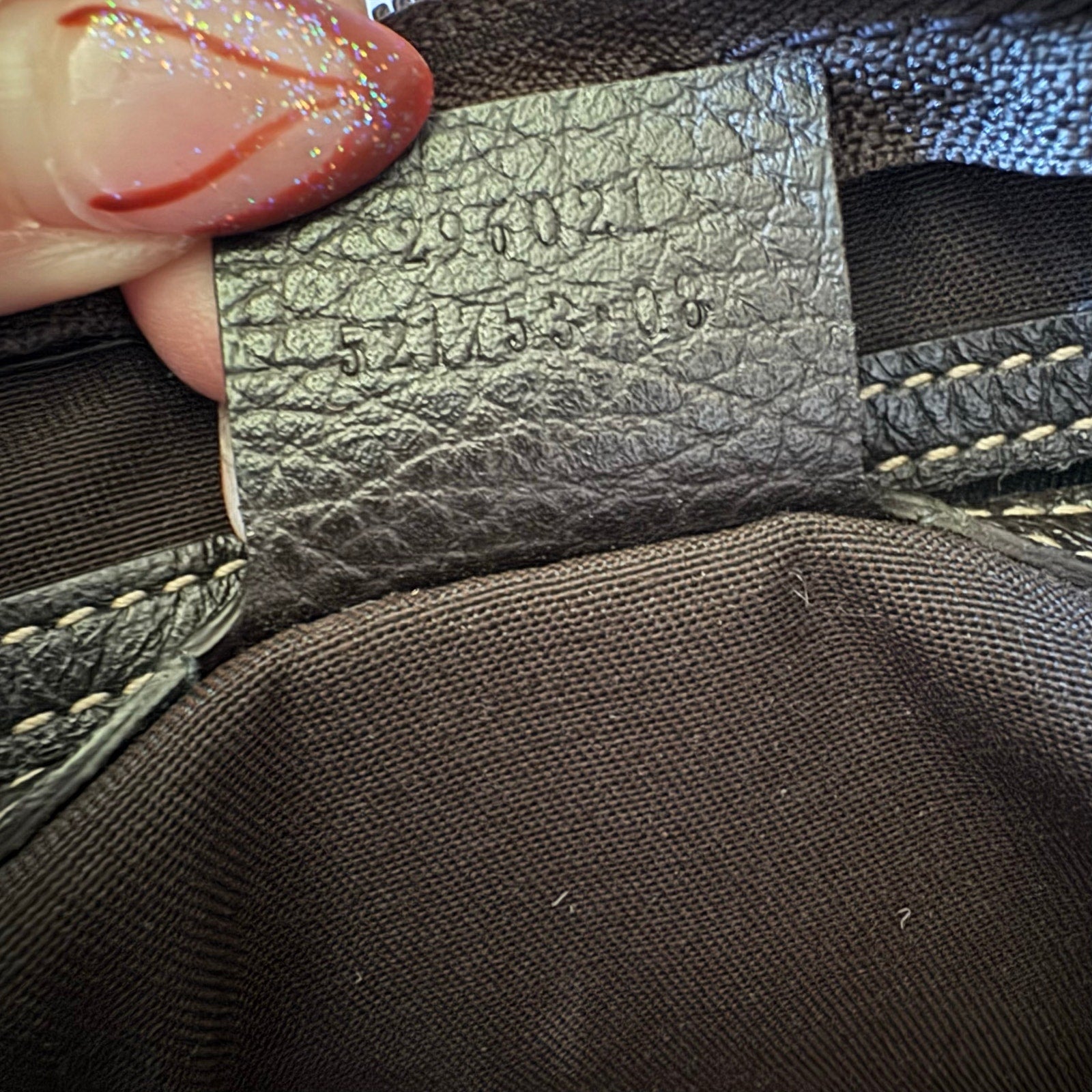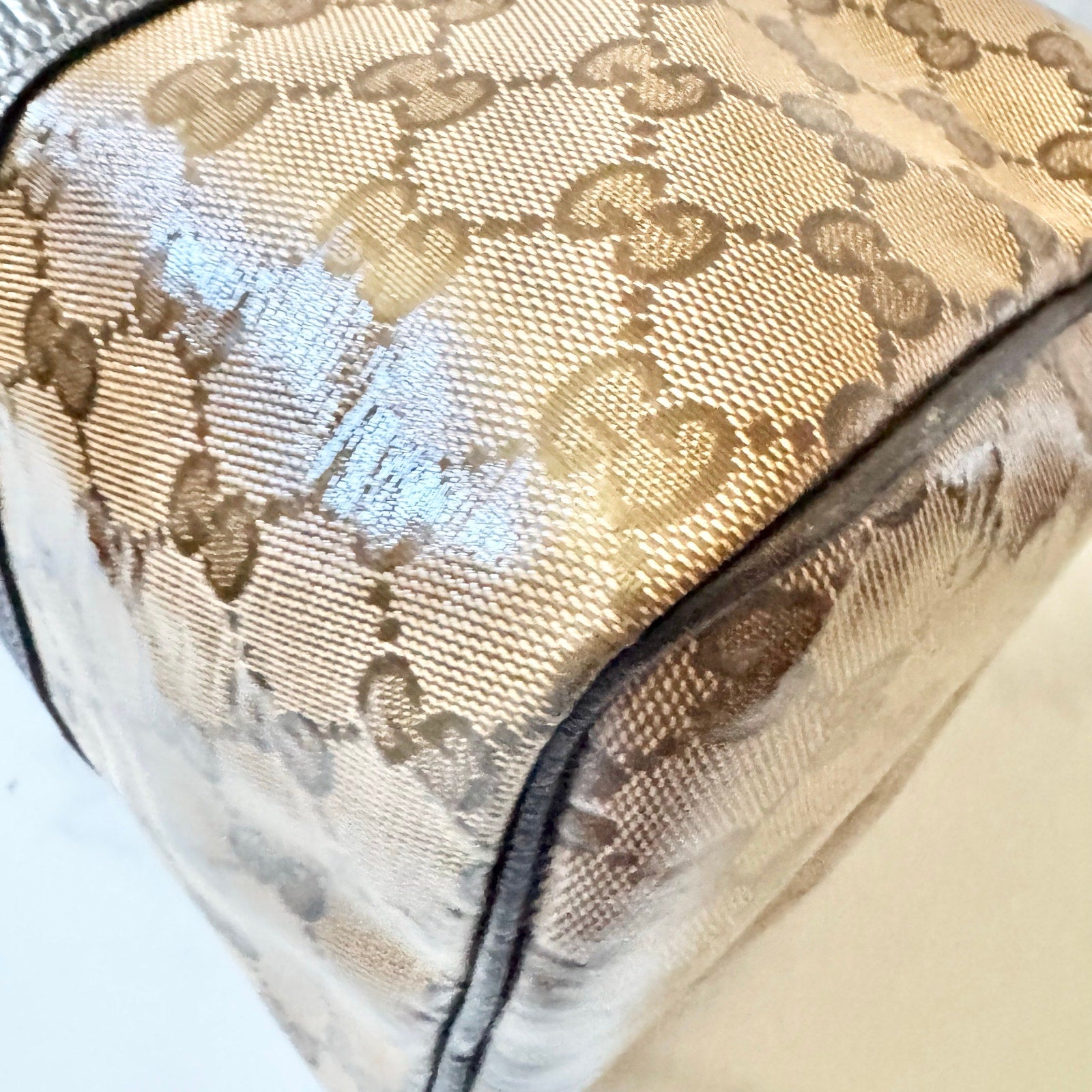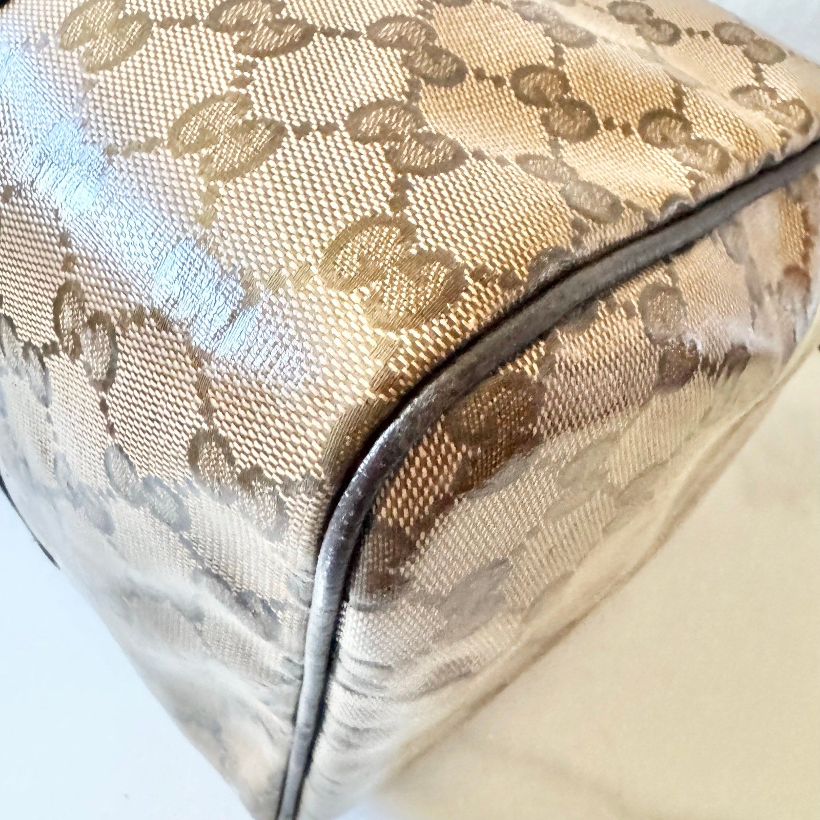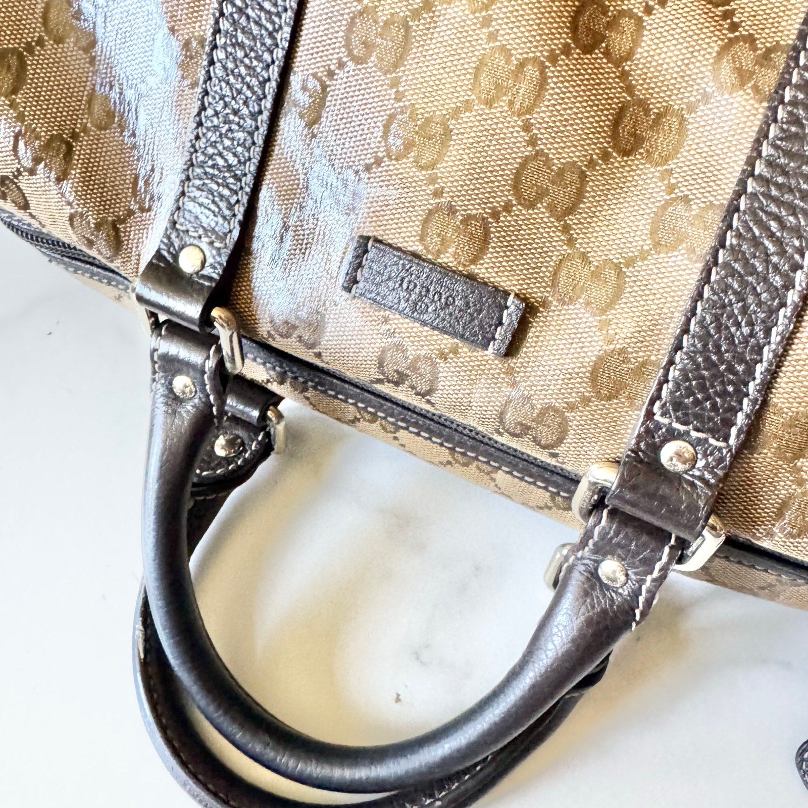 This is an authentic GUCCI Crystal Monogram Medium Joy Boston in Dark Brown. This chic Boston style tote is finely crafted of coated beige Gucci GG monogram canvas. The bag features chocolate brown cowhide leather trim and rolled top handles with polished light gold hardware. The top zipper opens to a mocha brown fabric interior with a hanging patch pocket.