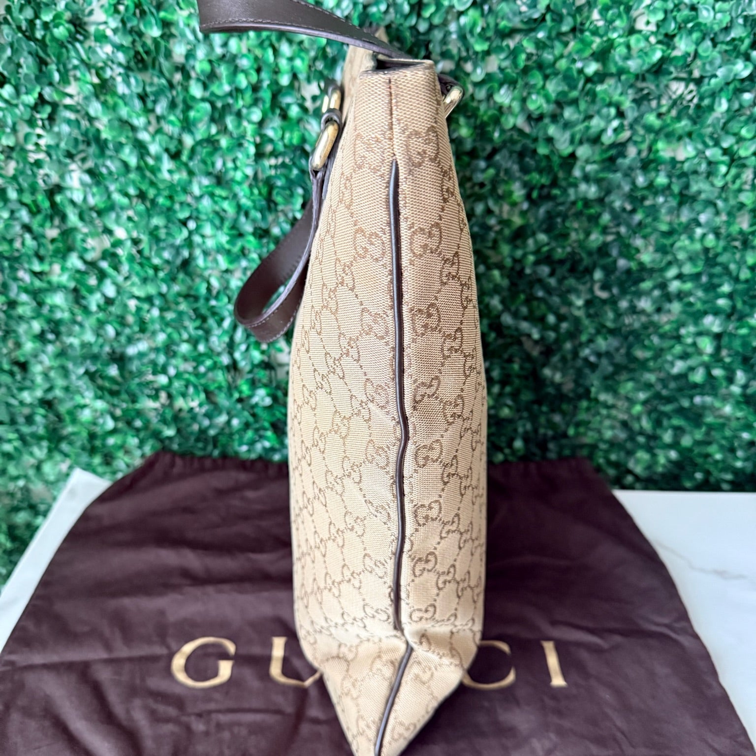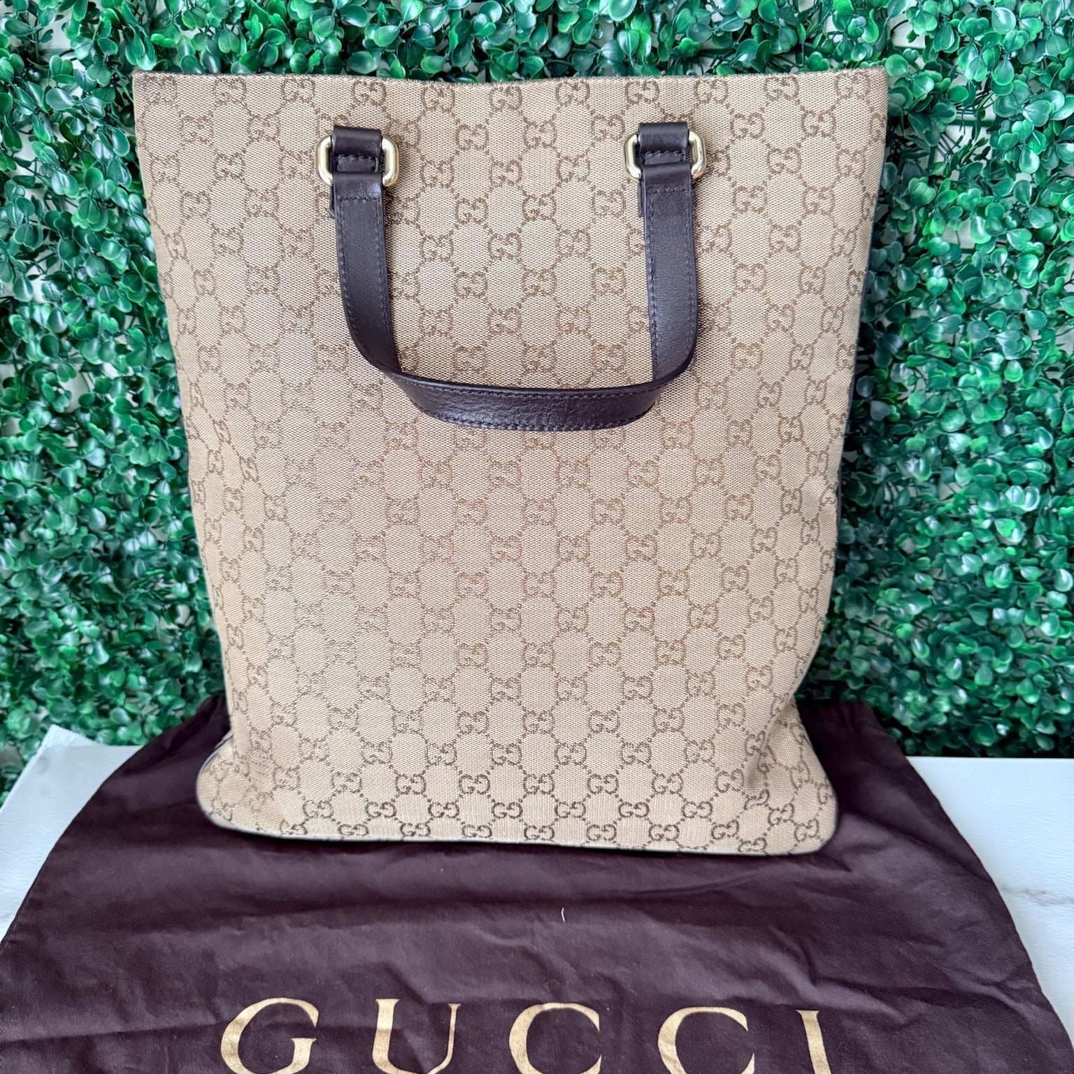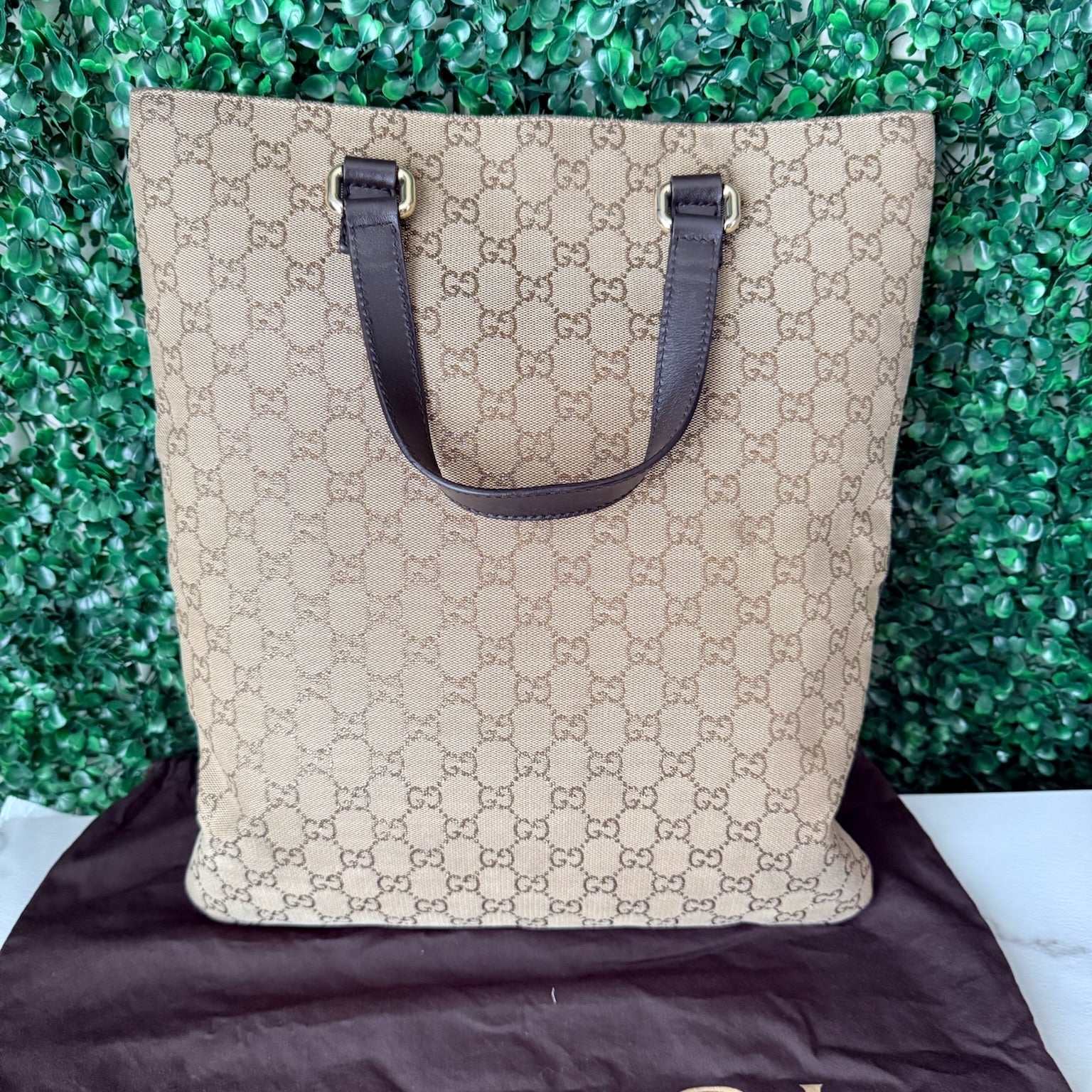 This is an authentic GUCCI Monogram Tote crafted of Gucci GG metallic monogram canvas, brown leather trim and top handles. The top unzips to a fabric interior with a zipper pocket.