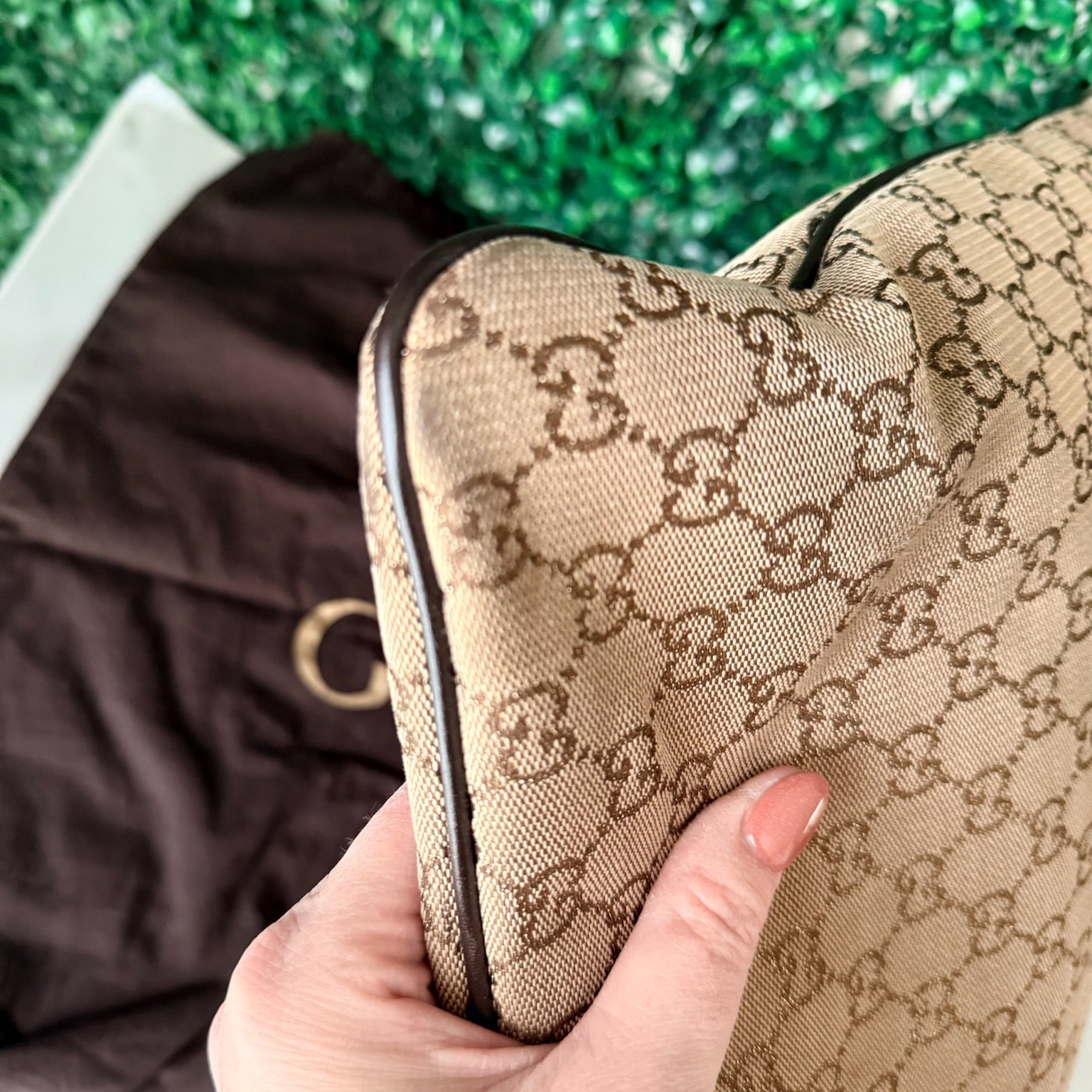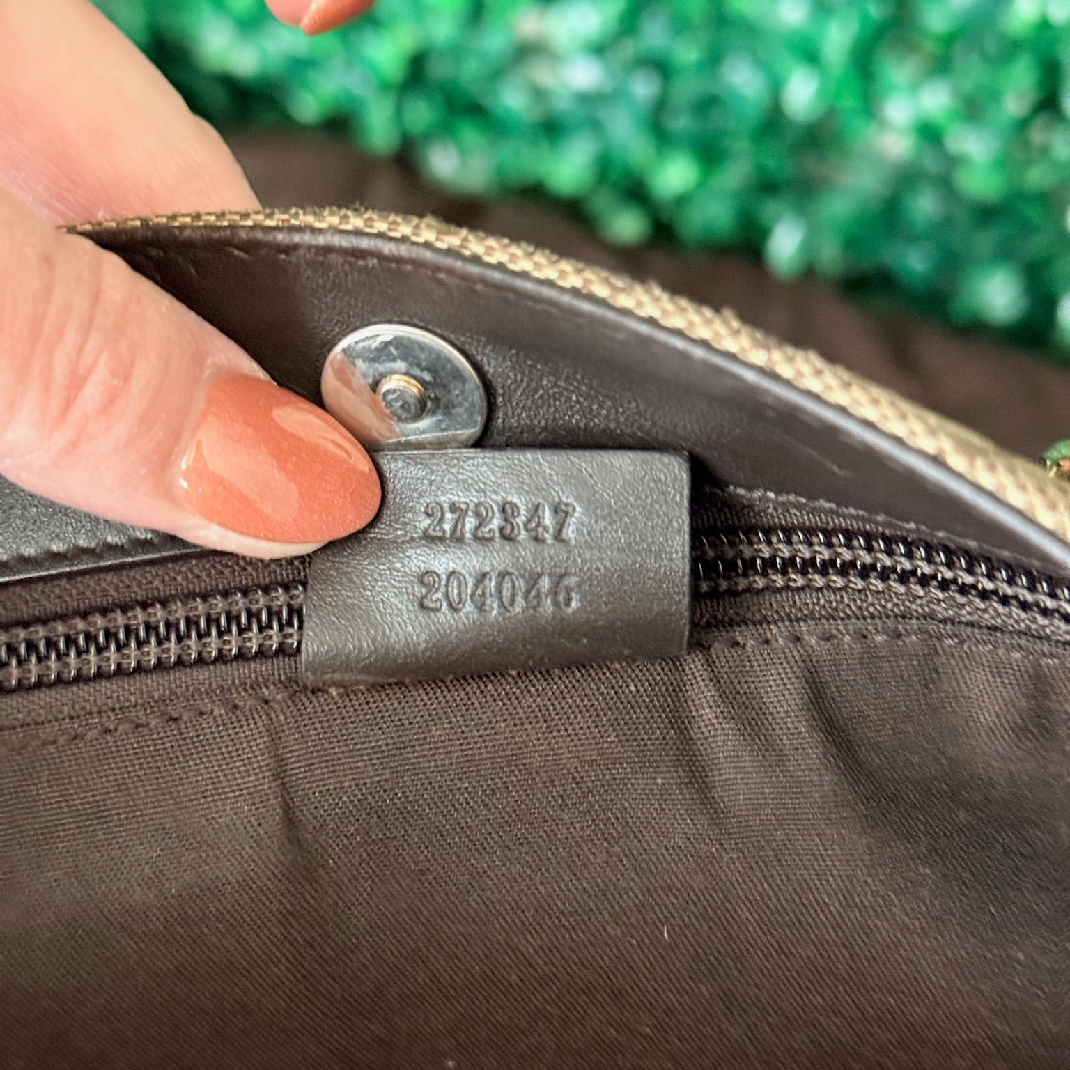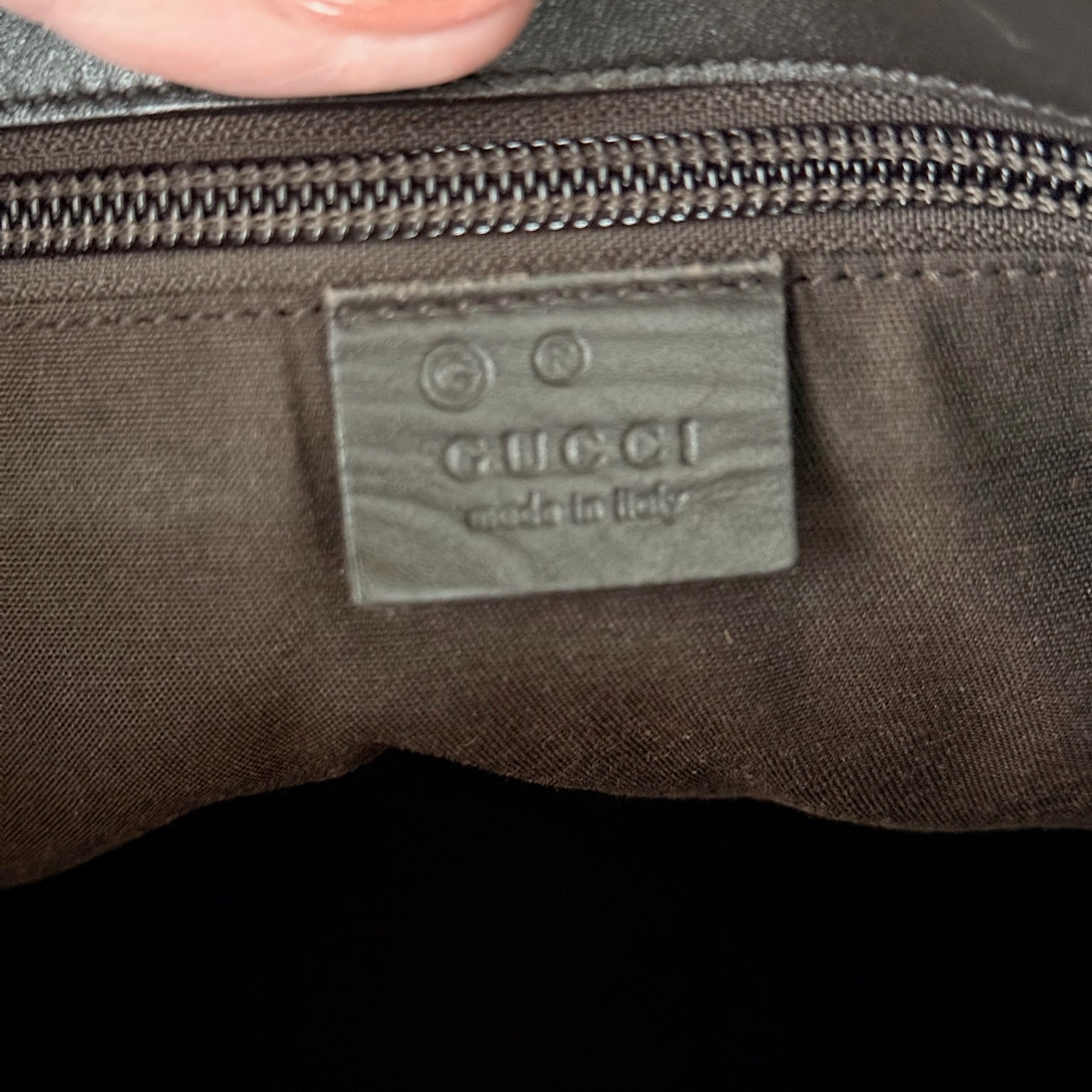 This is an authentic GUCCI Monogram Tote crafted of Gucci GG metallic monogram canvas, brown leather trim and top handles. The top unzips to a fabric interior with a zipper pocket.