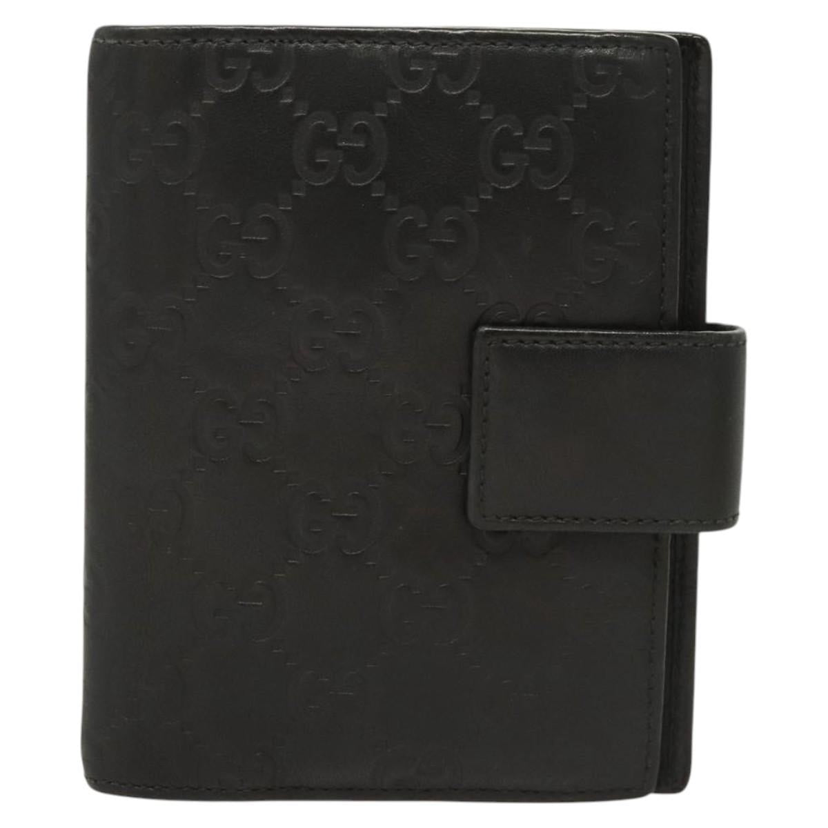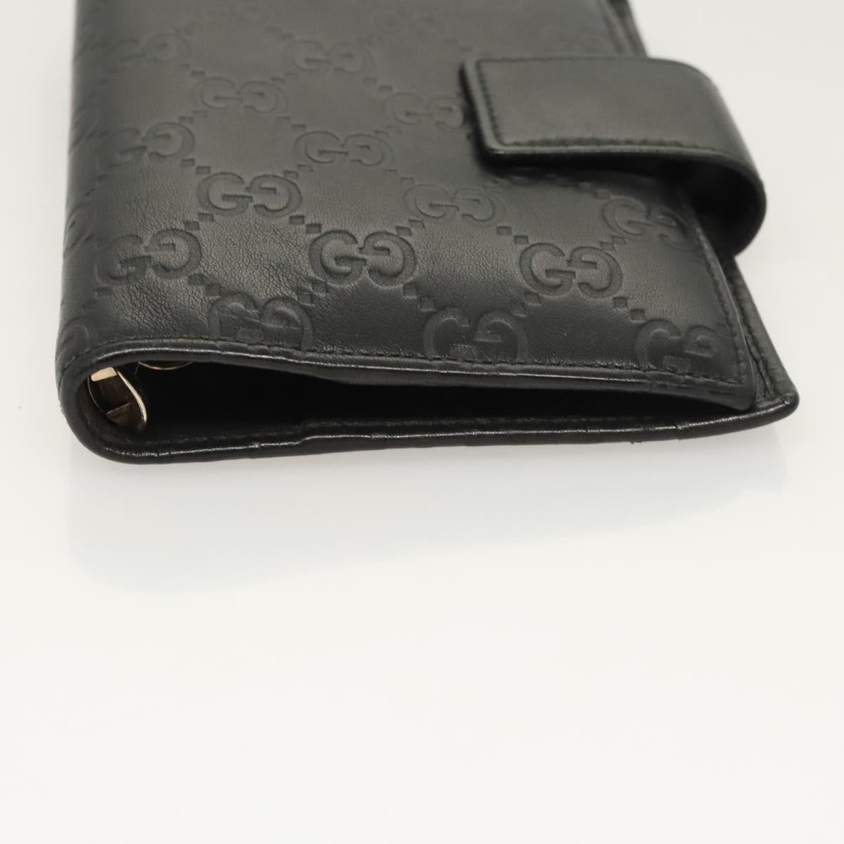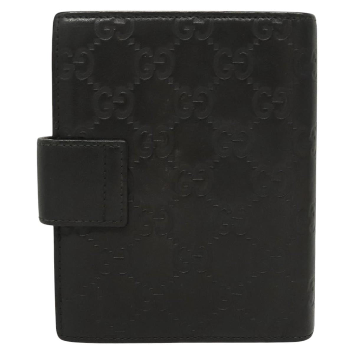 This is an authentic Gucci Small Ring Agenda Cover crafted of black GG monogram embossed calfskin leather held by a snap closure. It opens to an interior of leather with three card slots, two large pockets, and a brass 6-ring binder.