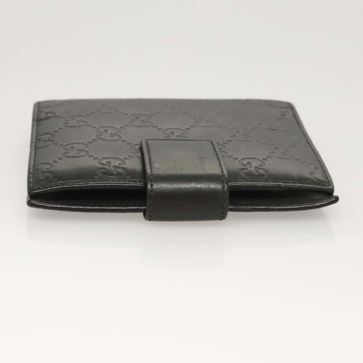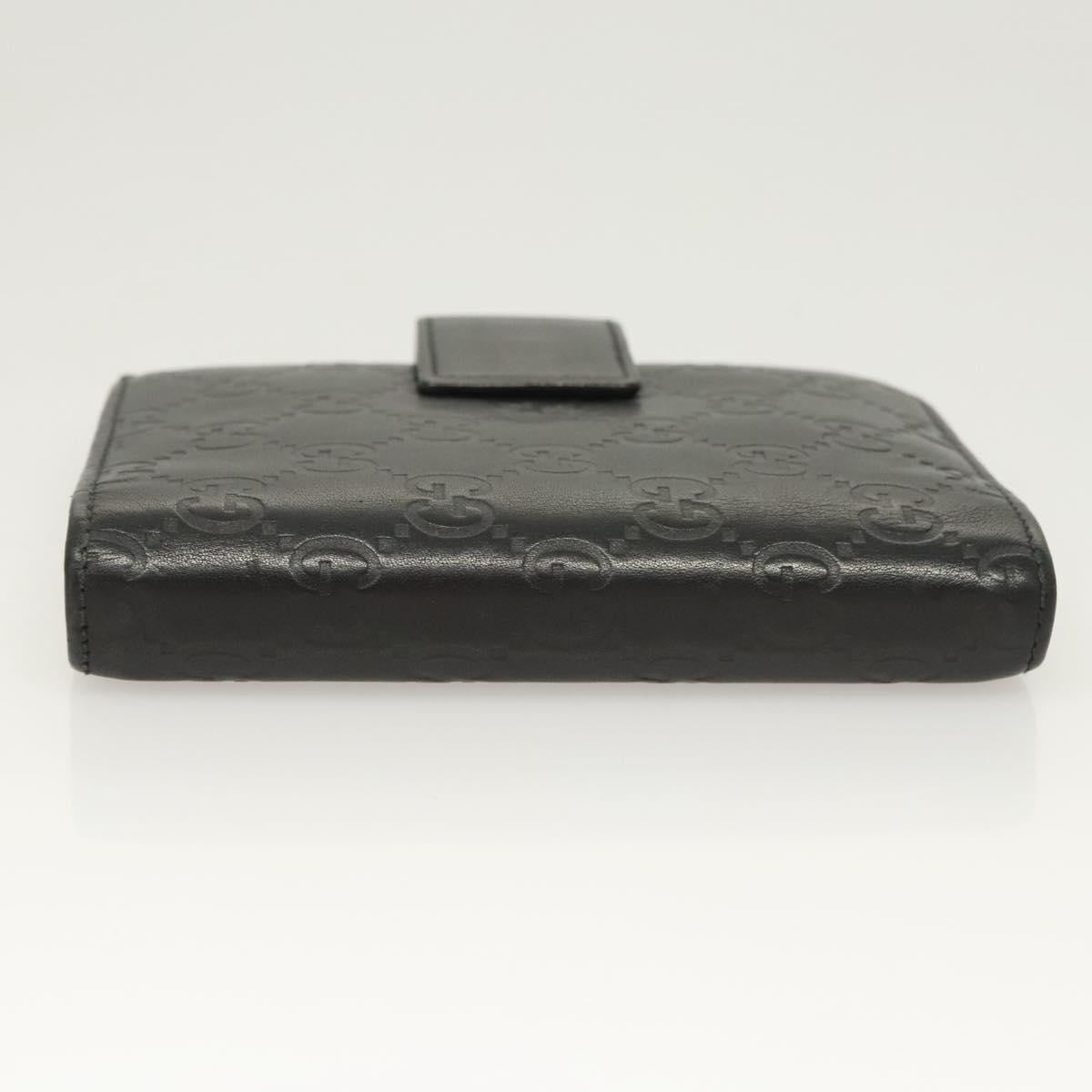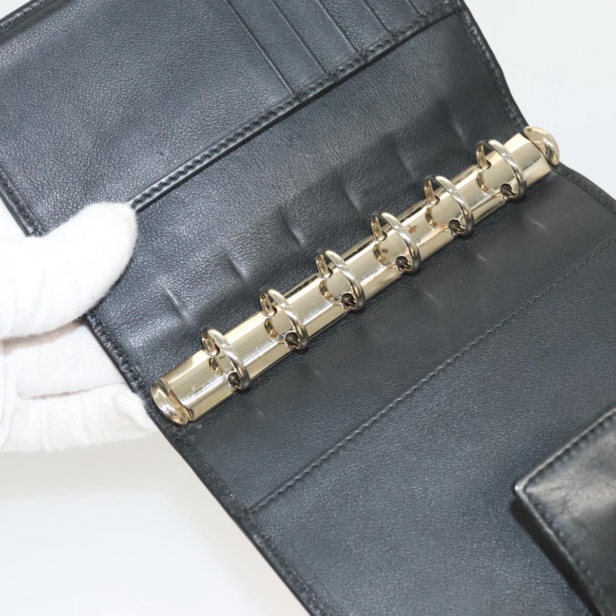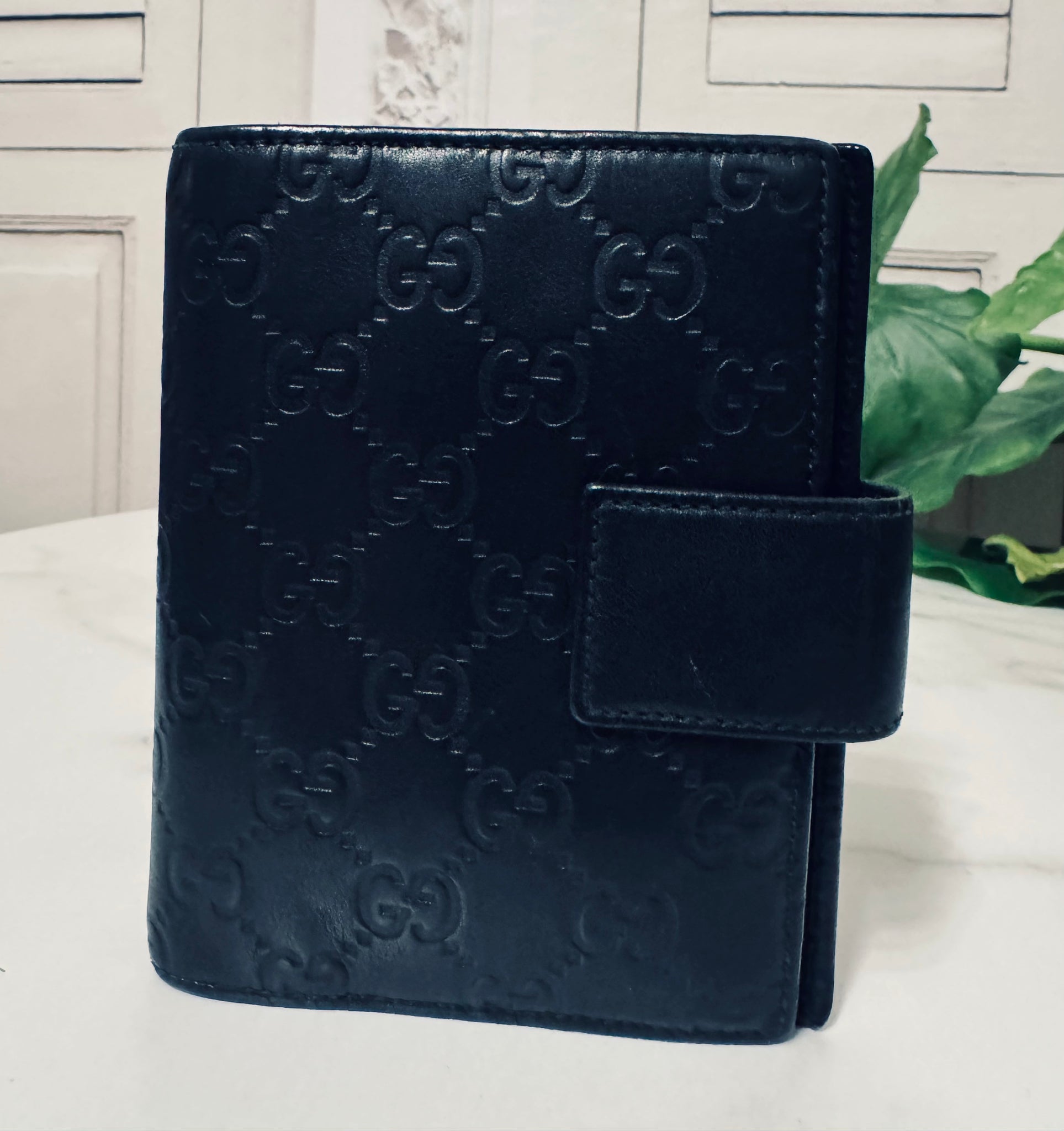 This is an authentic Gucci Small Ring Agenda Cover crafted of black GG monogram embossed calfskin leather held by a snap closure. It opens to an interior of leather with three card slots, two large pockets, and a brass 6-ring binder.