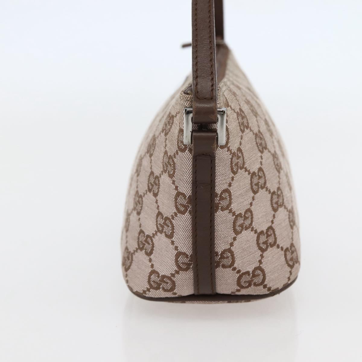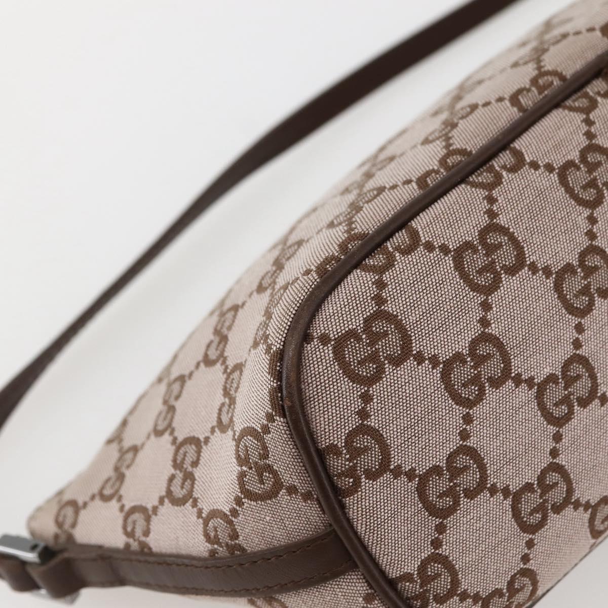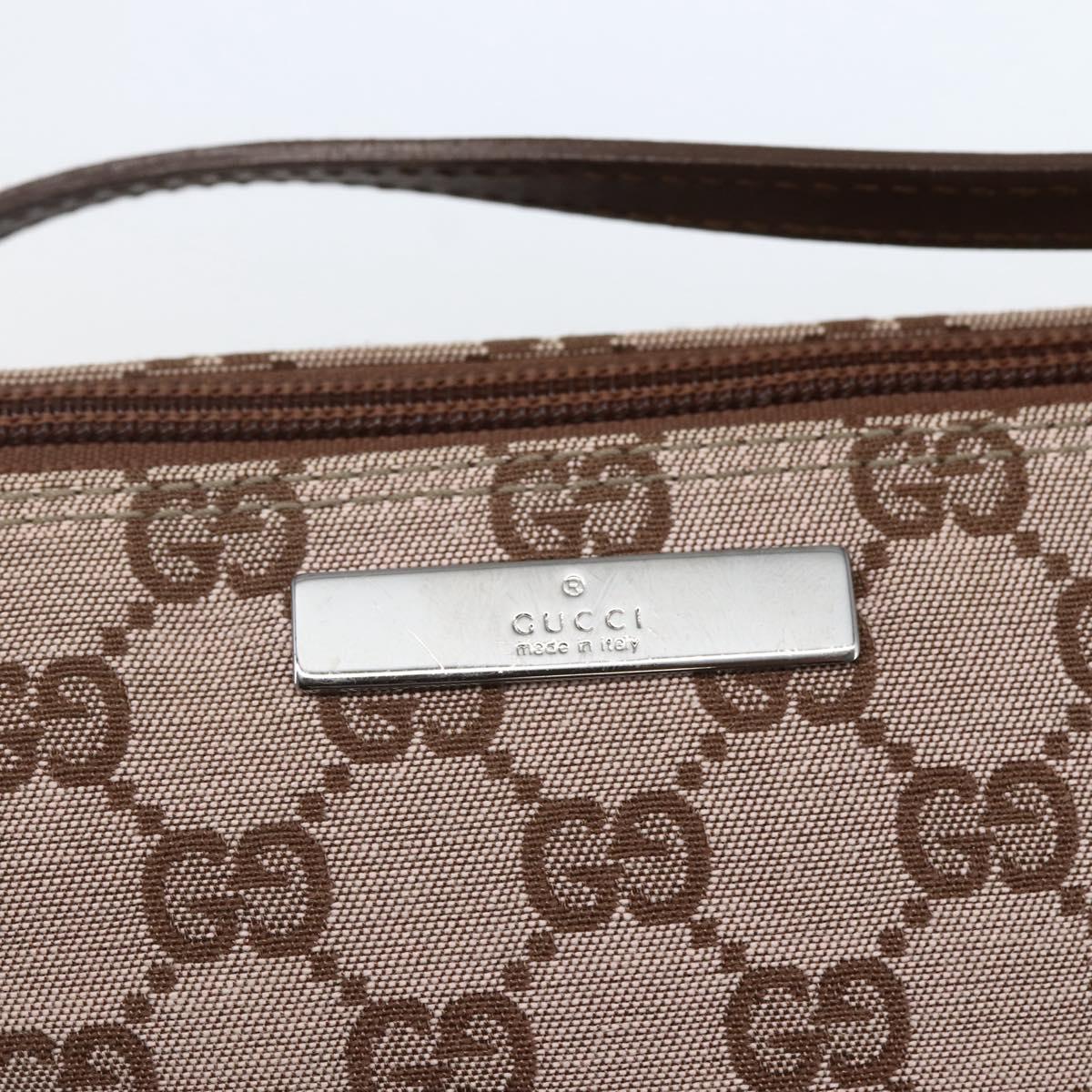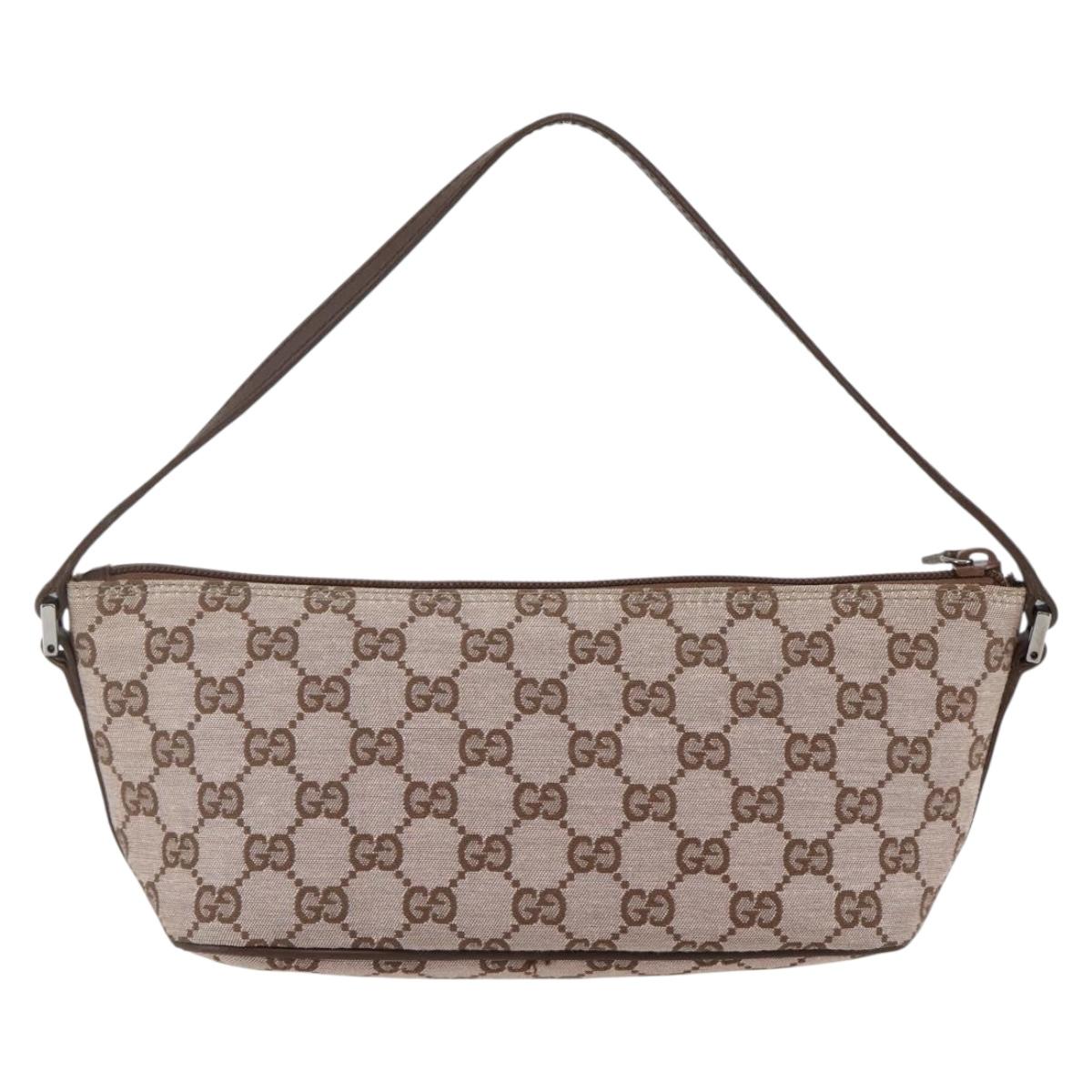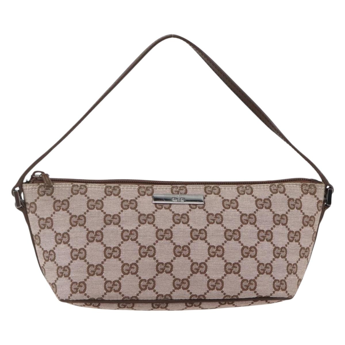 This is an authentic GUCCI Monogram Boat Pochette in Brown. This chic pochette is finely crafted of Gucci GG monogram canvas in a golden brown. The bag features a brown leather wrist strap and silver hardware. The top zipper opens to a dark gray fabric interior.