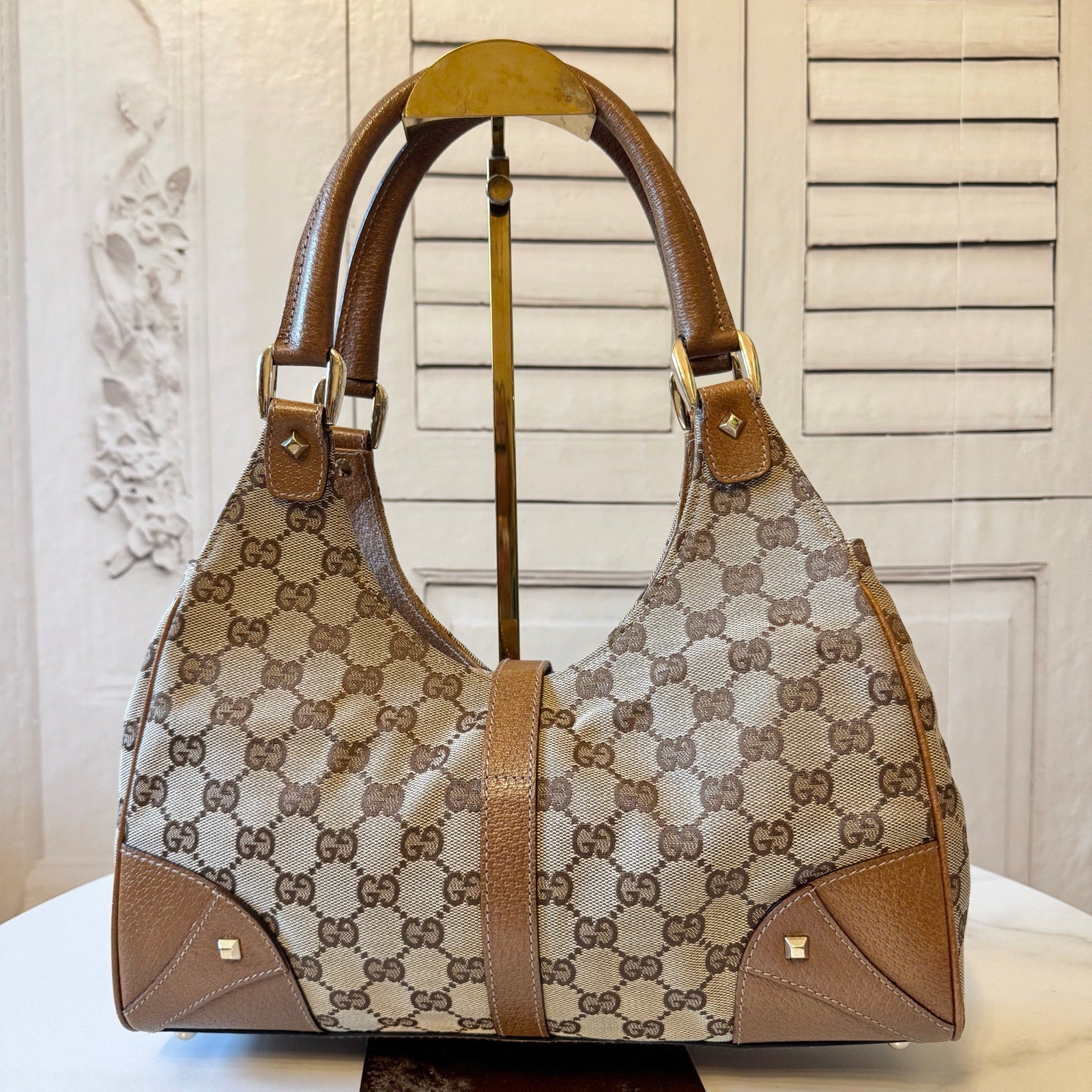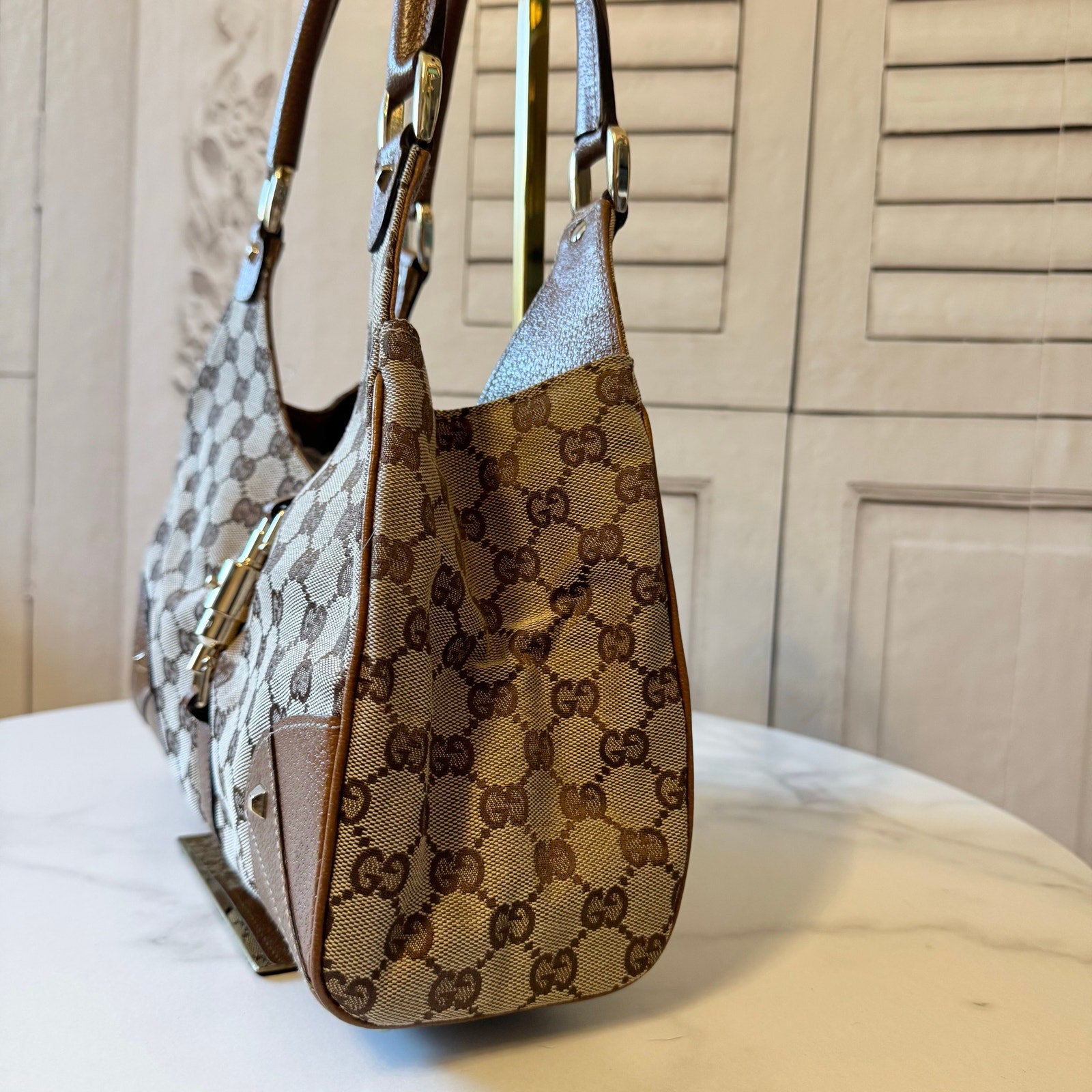 This is an authentic GUCCI Monogram Jackie Hobo crafted of brown fabric canvas with brown cowhide leather trim and looping leather shoulder straps with a light gold piston lock. This opens to a brown fabric interior with a zipper pocket.
