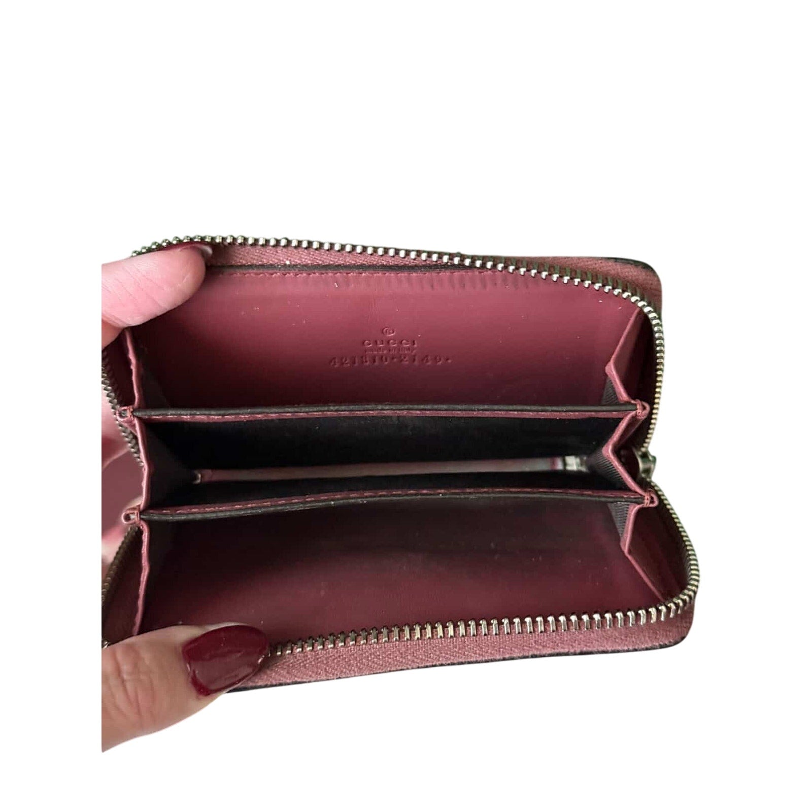 This is an authentic GUCCI GG Supreme Monogram Blooms Print Card Case in Antique Rose. This compact stylish card holder is crafted of pink floral on Gucci GG monogram canvas. This wallet features a 3/4 sided wrap around zipper that opens to a leather partitioned interior.
