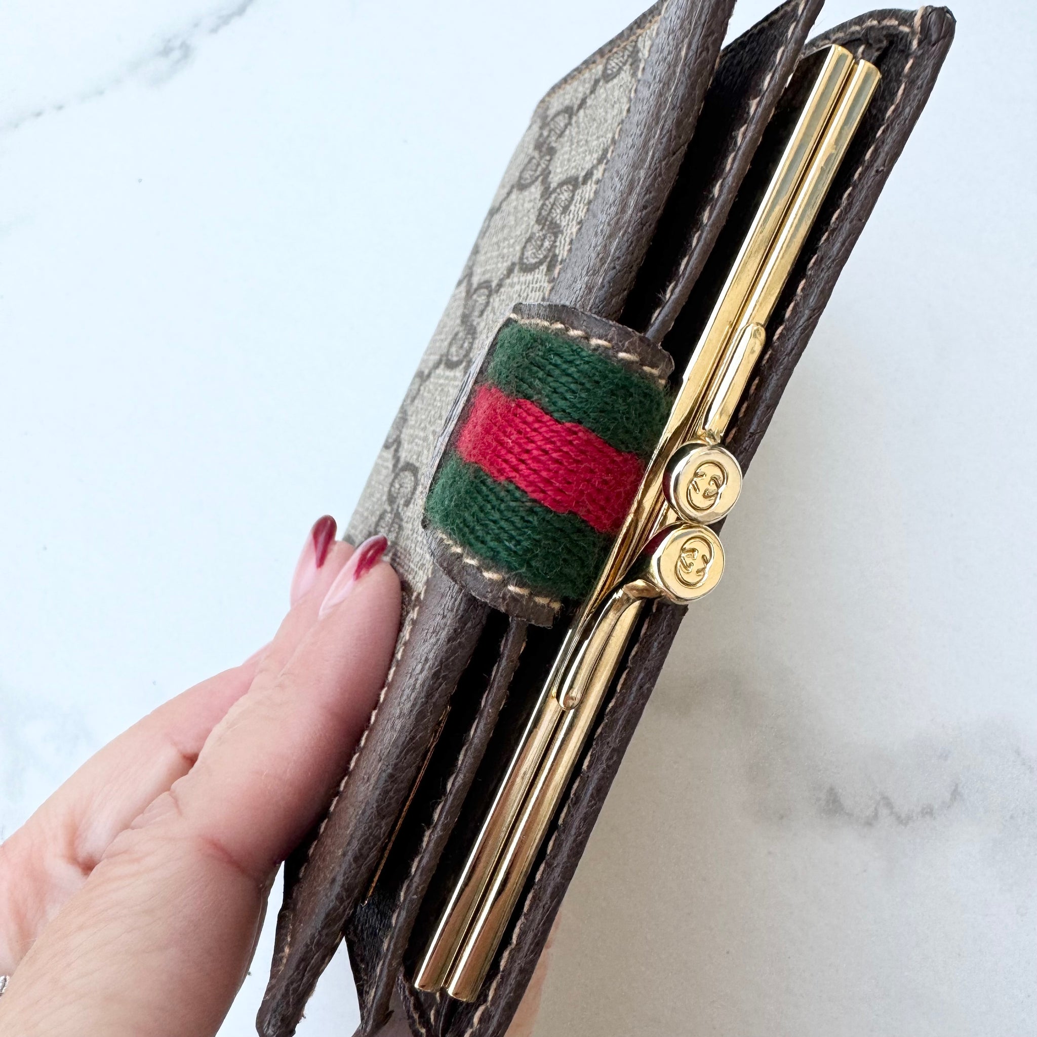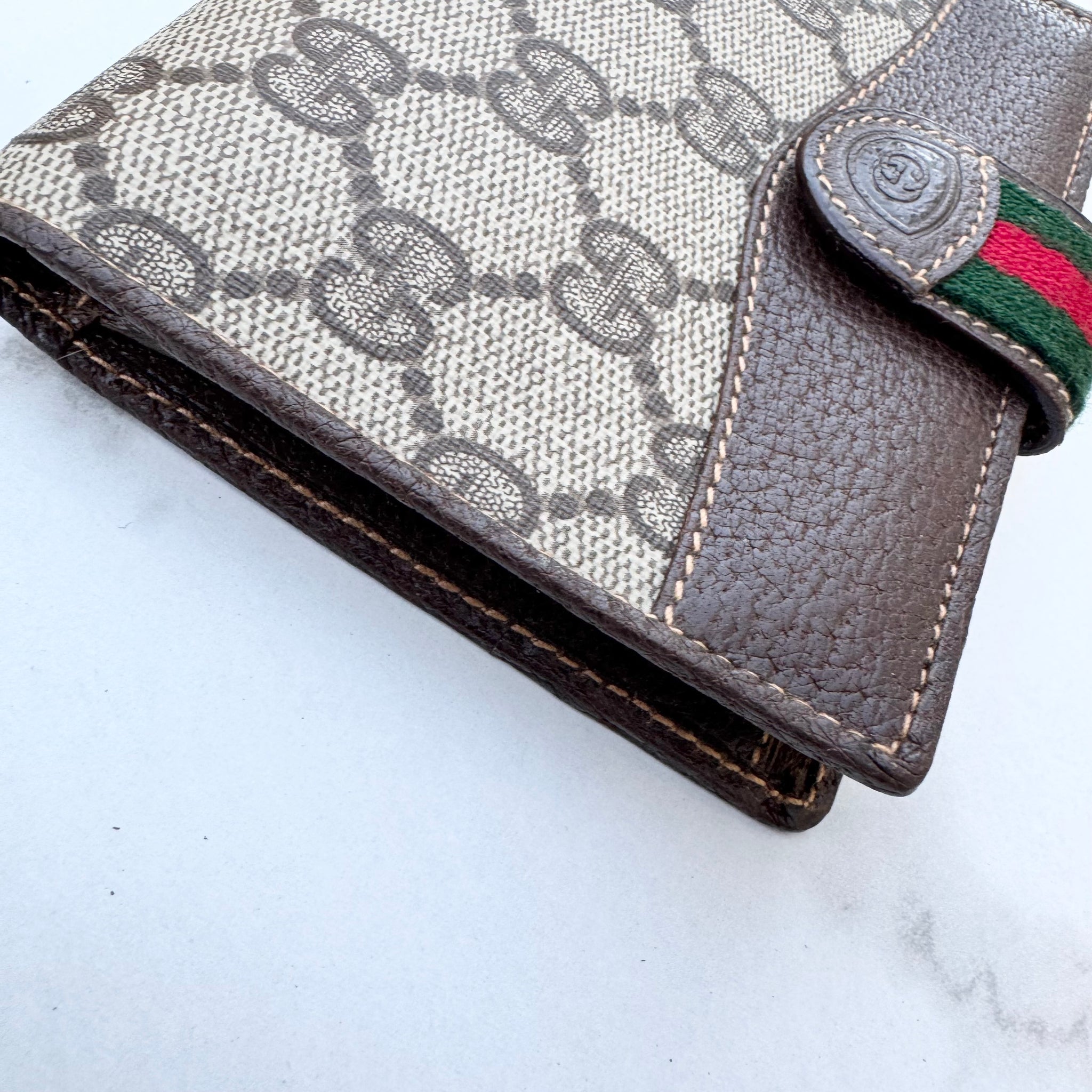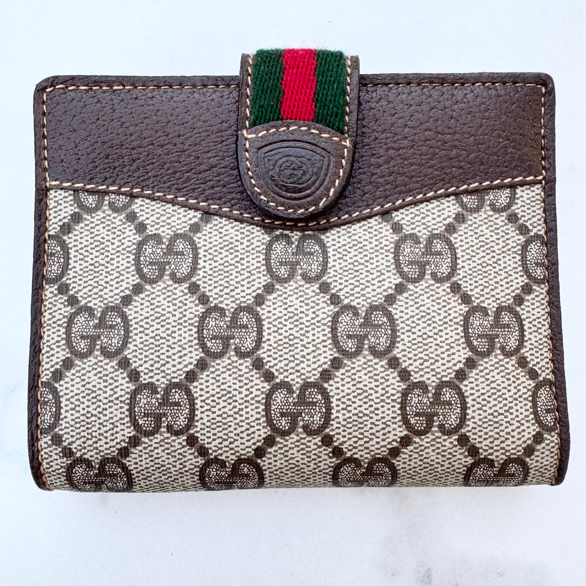 This is an authentic GUCCI Wallet crafted of supreme Gucci monogram coated canvas with brown leather trim. It opens to a leather interior with vertical card slots and pockets.