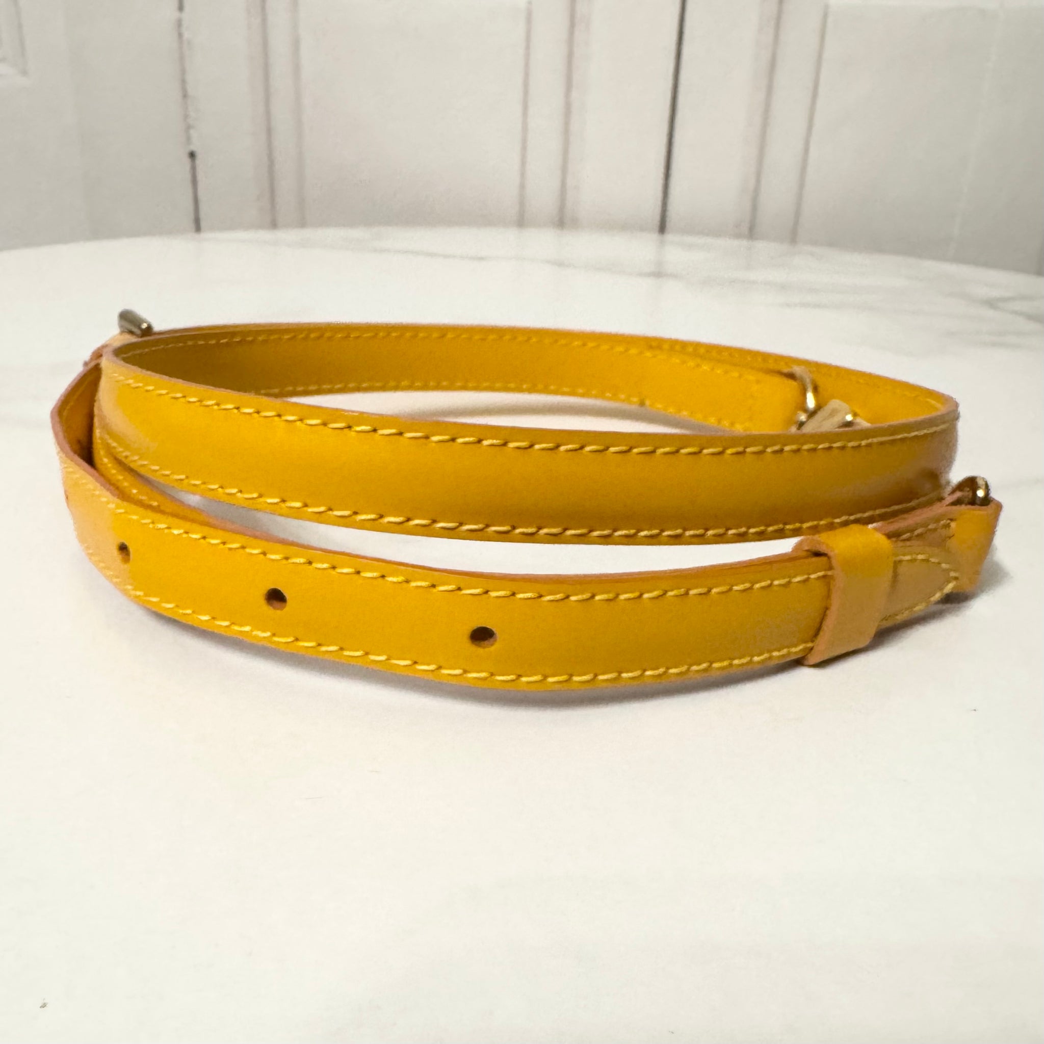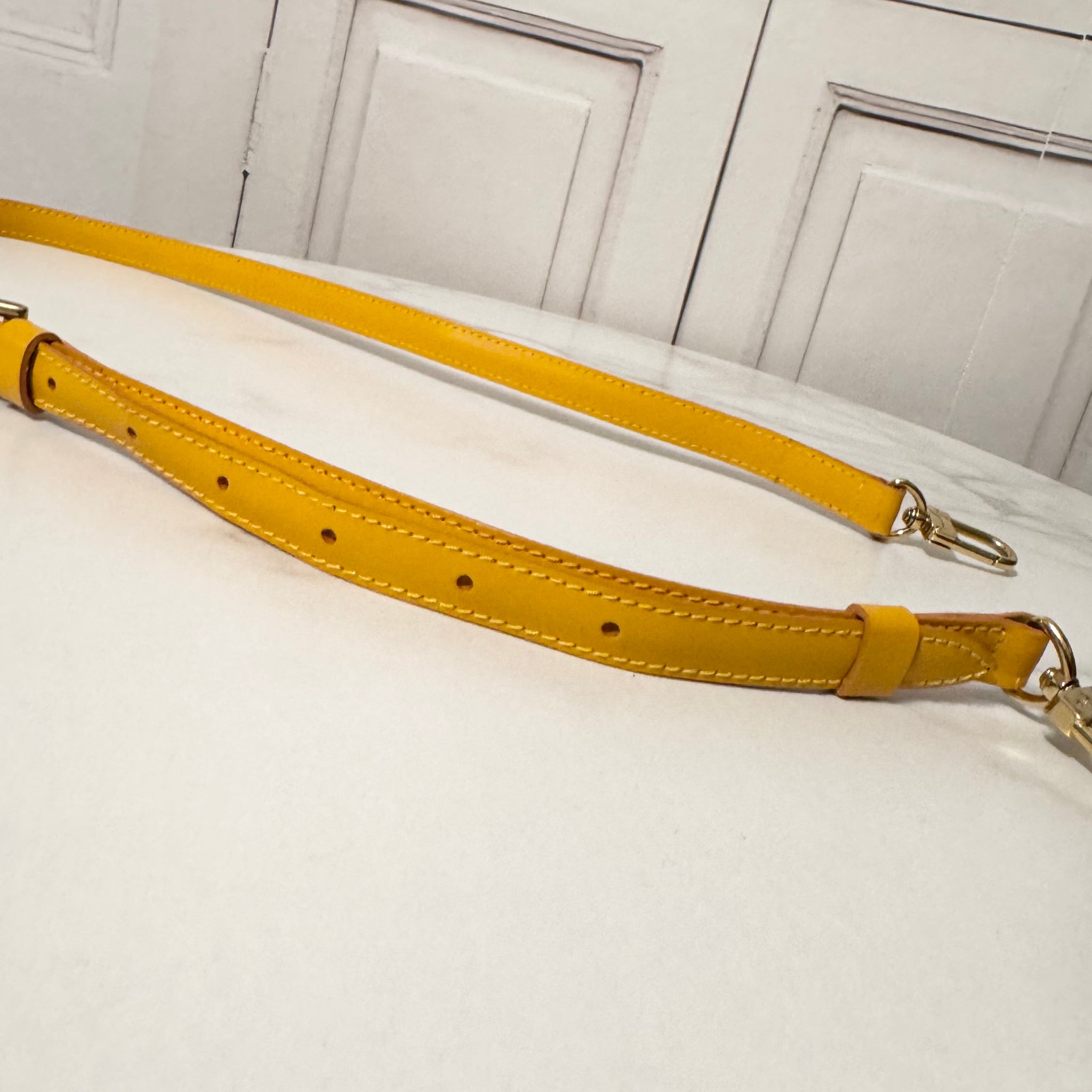 This is an Authentic Louis Vuitton Strap crafted of leather in a saffron yellow with brass hardware. Strap is .75 inches wide and adjustable from 38-48 inches; Suitable for use with small to medium sized bags.