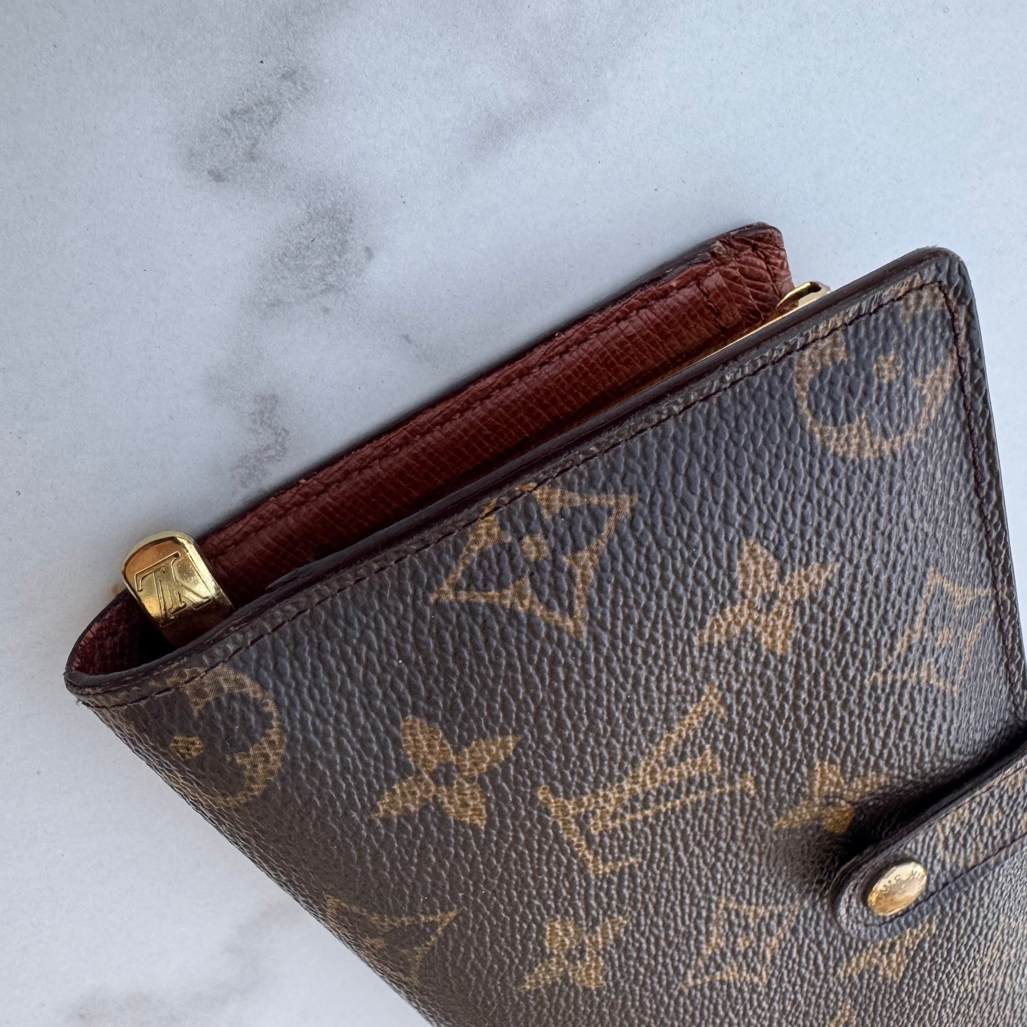 This is an authentic LOUIS VUITTON Monogram Continental Kisslock Wallet crafted of classic Louis Vuitton monogram canvas. The front flap opens with a cross-grain snap to a cross grain leather interior with a card slot panel and a zippered compartment. Also features a kisslock compartment.