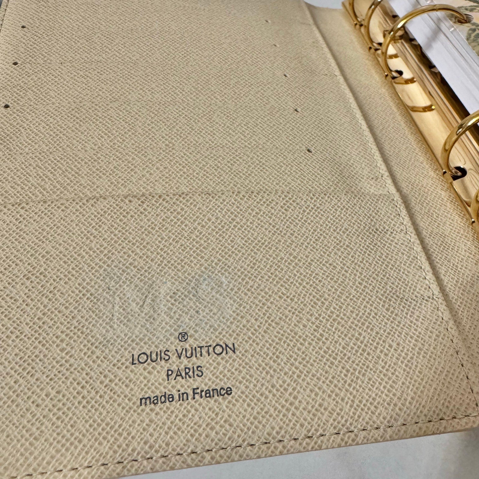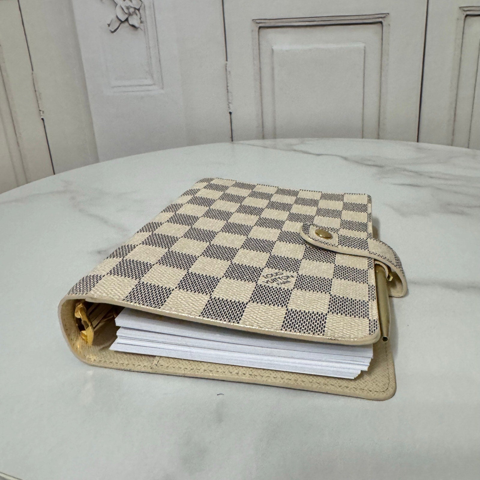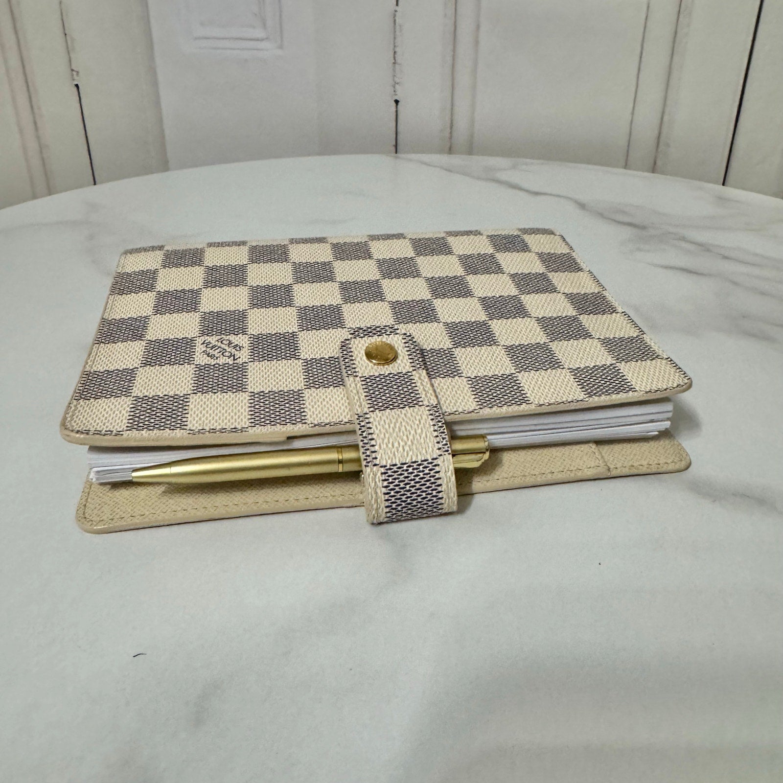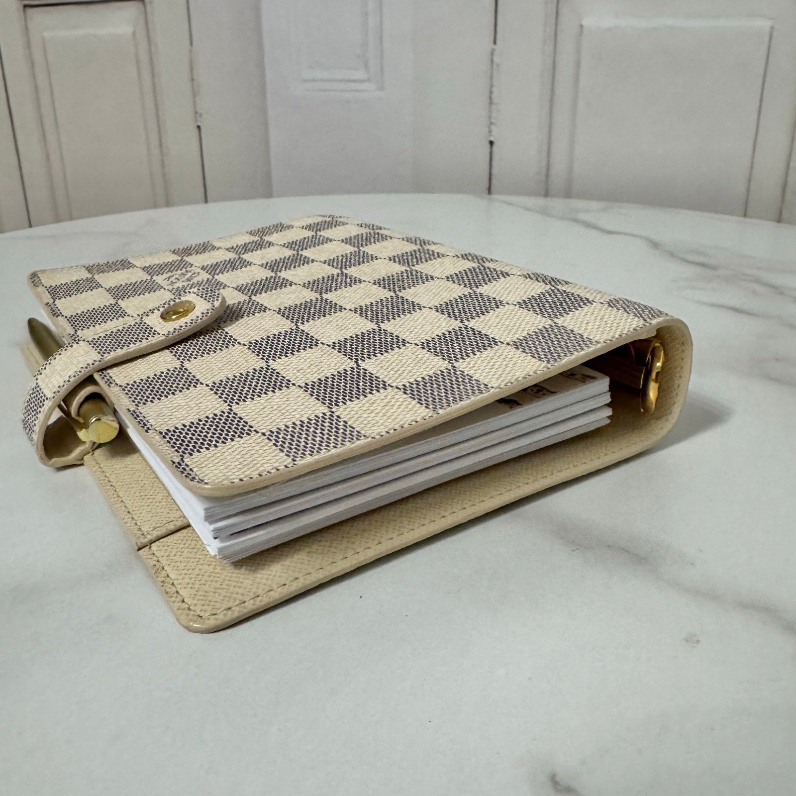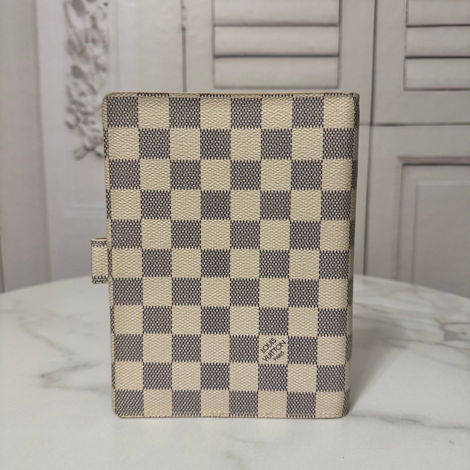This is an authentic LOUIS VUITTON Medium Ring Agenda Cover crafted of Louis Vuitton damier azur coated canvas. It features a folder style structure and a cross over polished gold snap closure. This opens to a cross grain leather interior. This item is discontinued in the azur color and hard to find in this color! Includes custom designed full color dashboards and inserts.