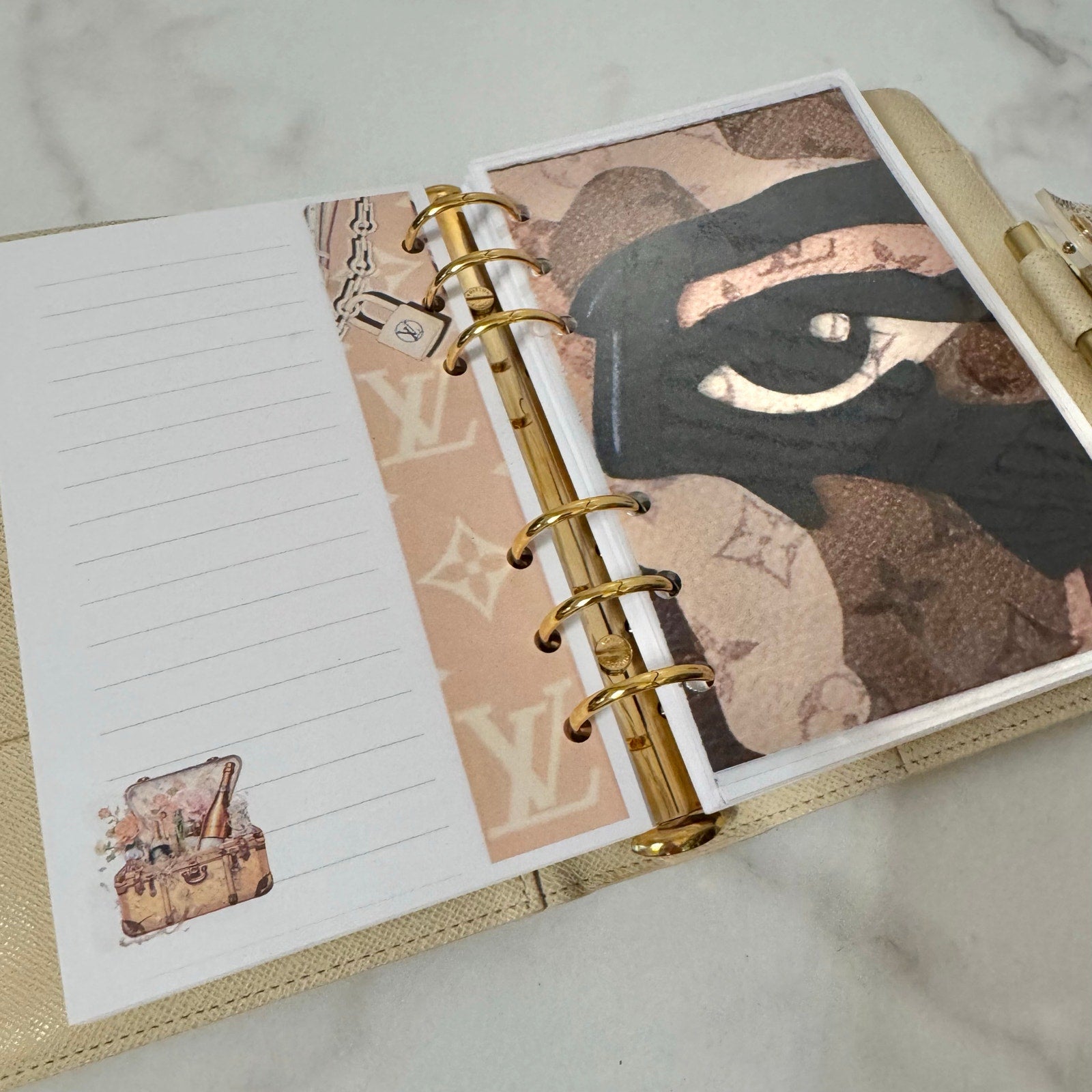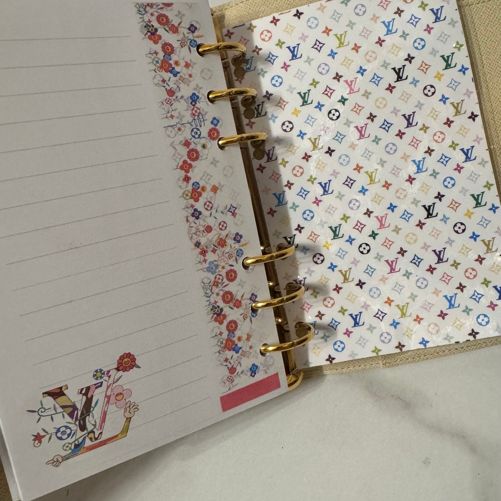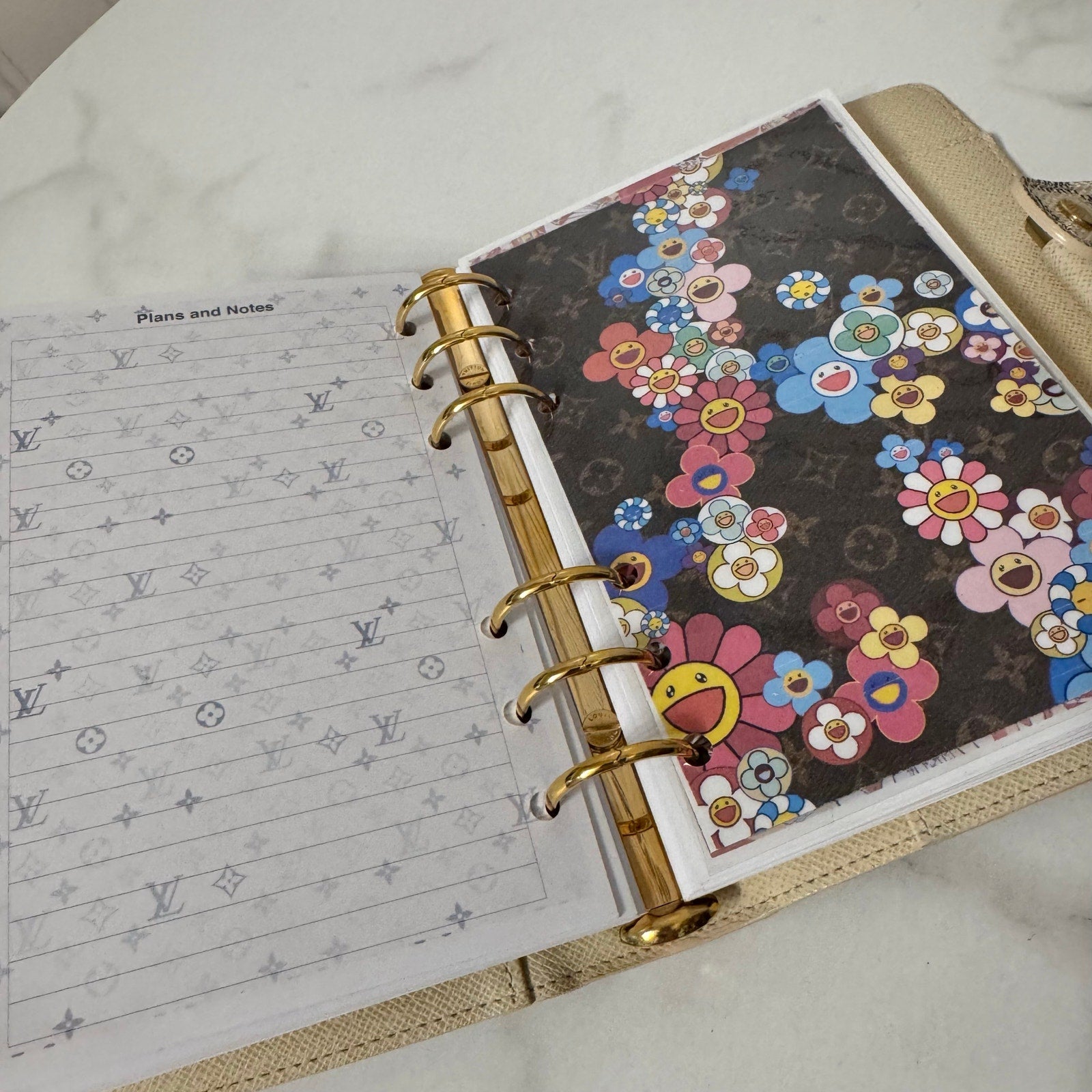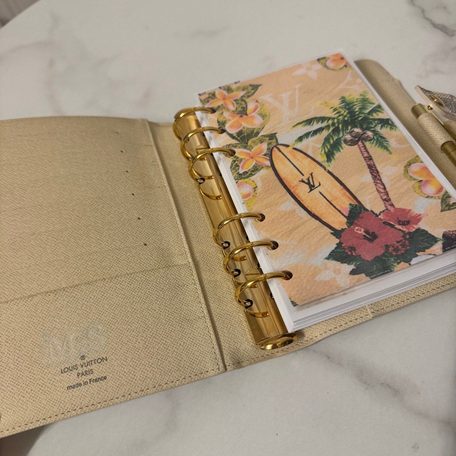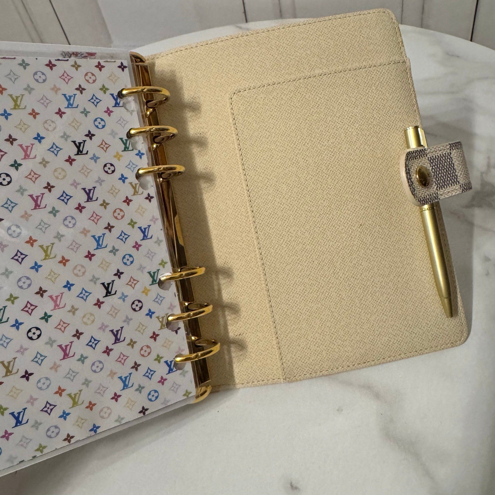 This is an authentic LOUIS VUITTON Medium Ring Agenda Cover crafted of Louis Vuitton damier azur coated canvas. It features a folder style structure and a cross over polished gold snap closure. This opens to a cross grain leather interior. This item is discontinued in the azur color and hard to find in this color! Includes custom designed full color dashboards and inserts.