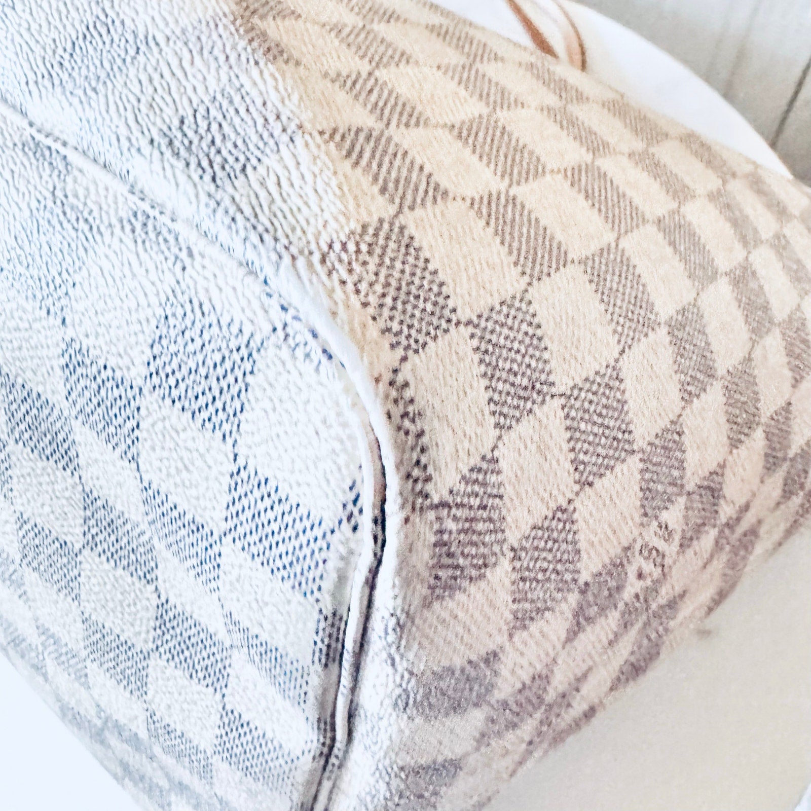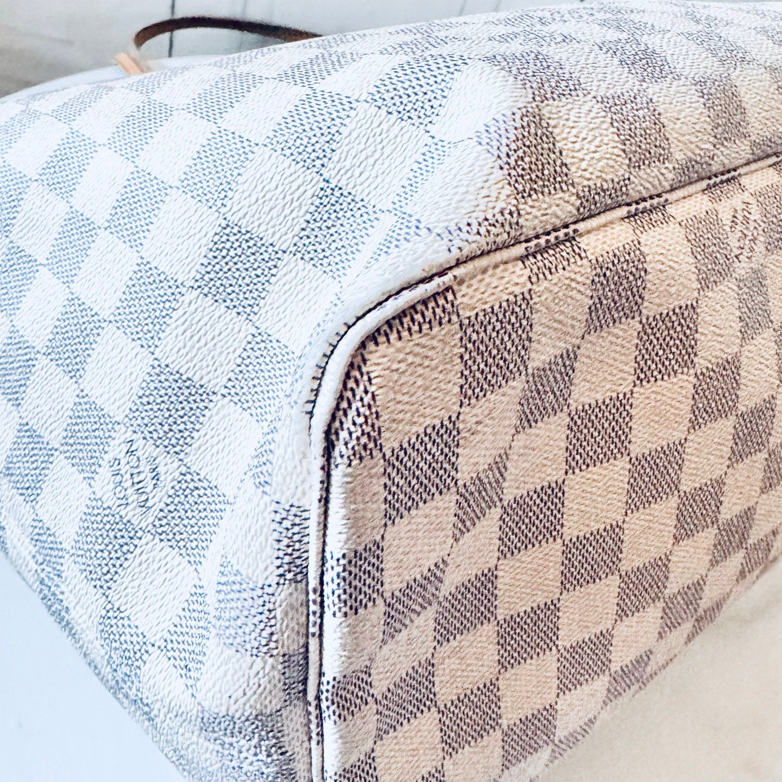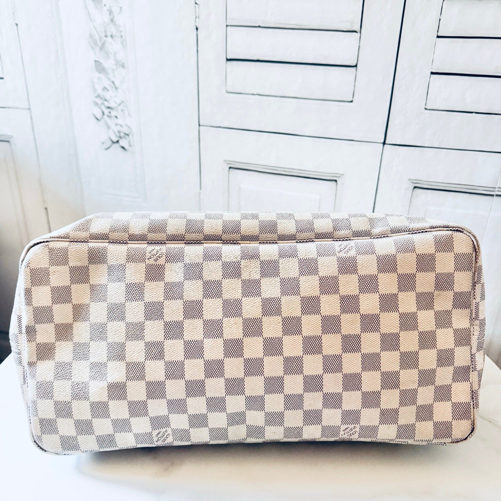 This is an authentic LOUIS VUITTON Damier Azur Neverfull GM. This chic tote is crafted of Louis Vuitton signature Damier in blue and white on coated canvas. The bag features vachetta cowhide leather trim, shoulder straps, and side cinches with polished gold tone hardware. The top is open to a striped ivory fabric interior with a hanging zipper pocket.