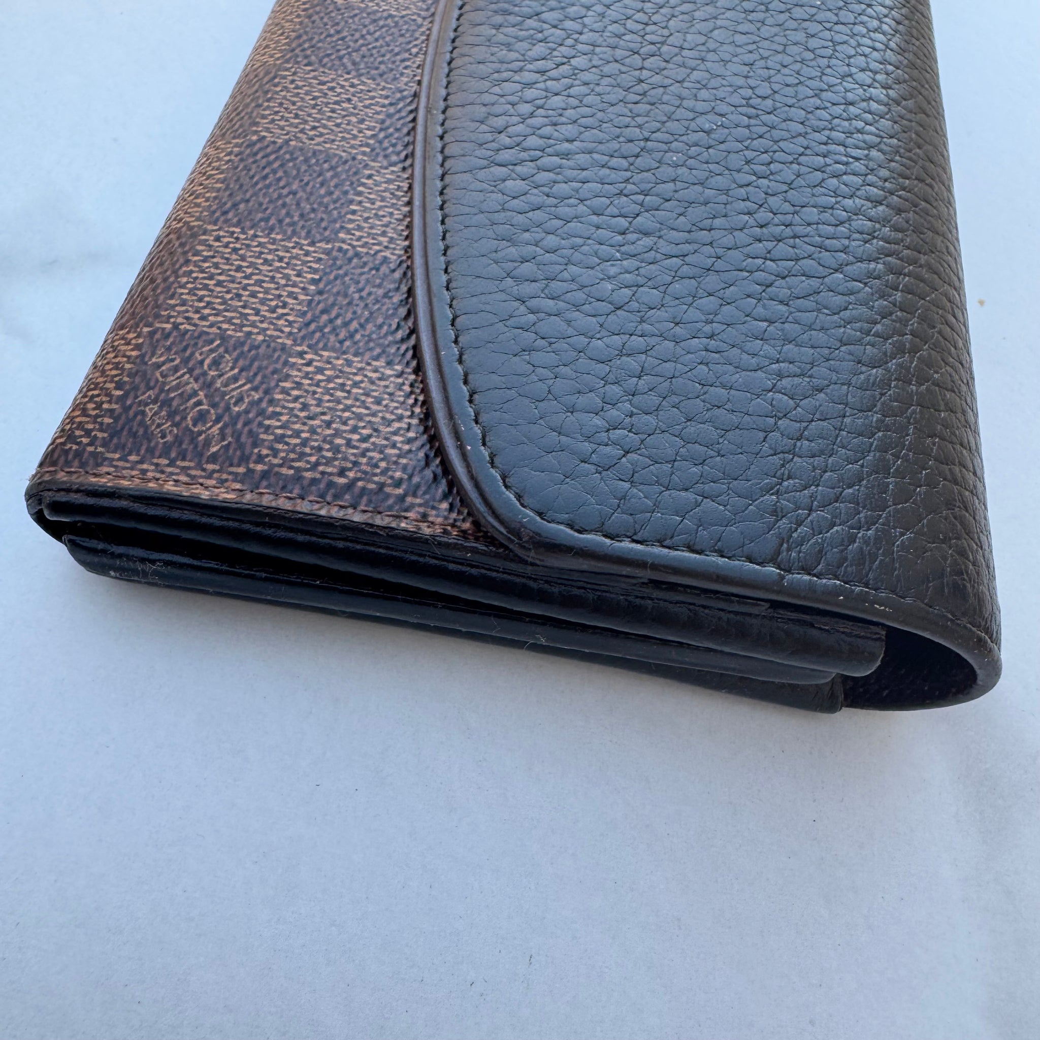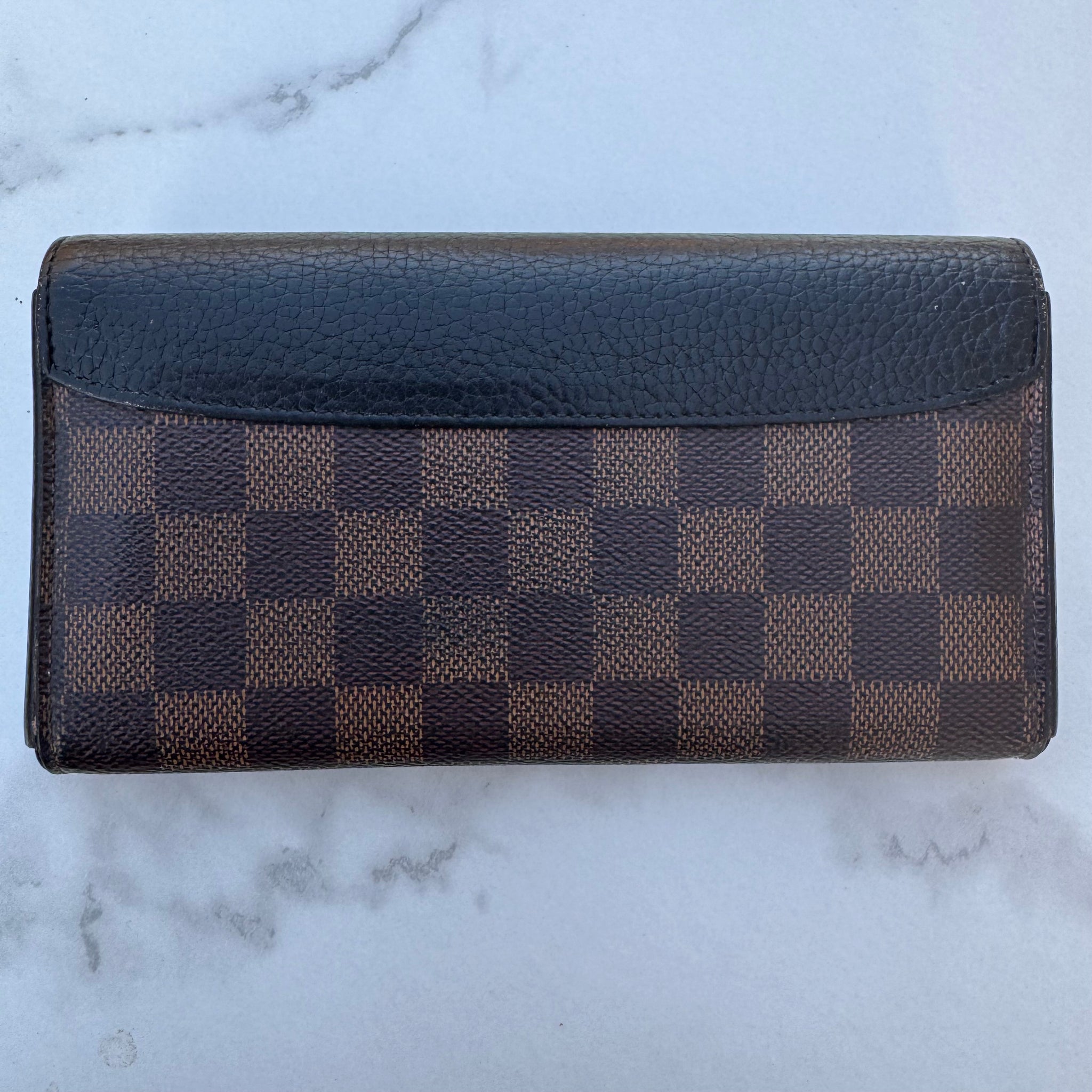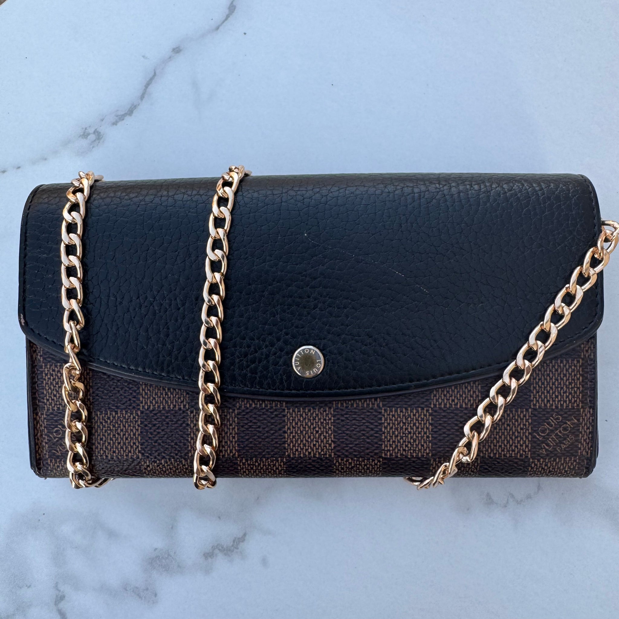 This is an authentic LOUIS VUITTON Damier Ebene Normandy Wallet in Black. This wallet is crafted of traditional Louis Vuitton checkerboard coated toile canvas in brown with a black leather front flap. The flap opens with a brass snap to a brown crossgrain leather interior with card slots, patch pocket, and a zipper compartment. Includes unbranded crossbody chan.