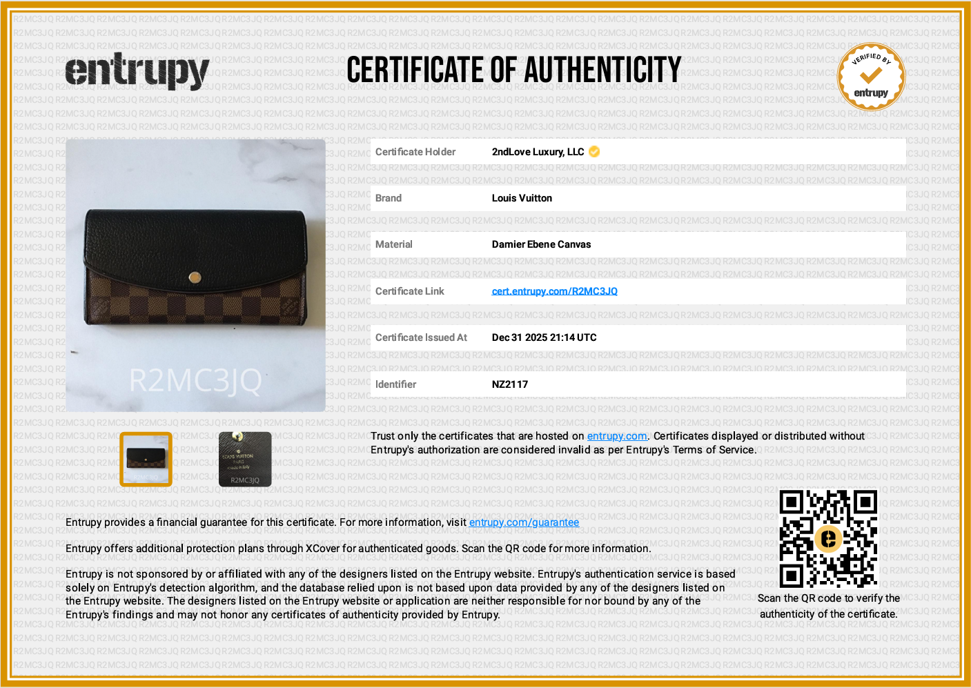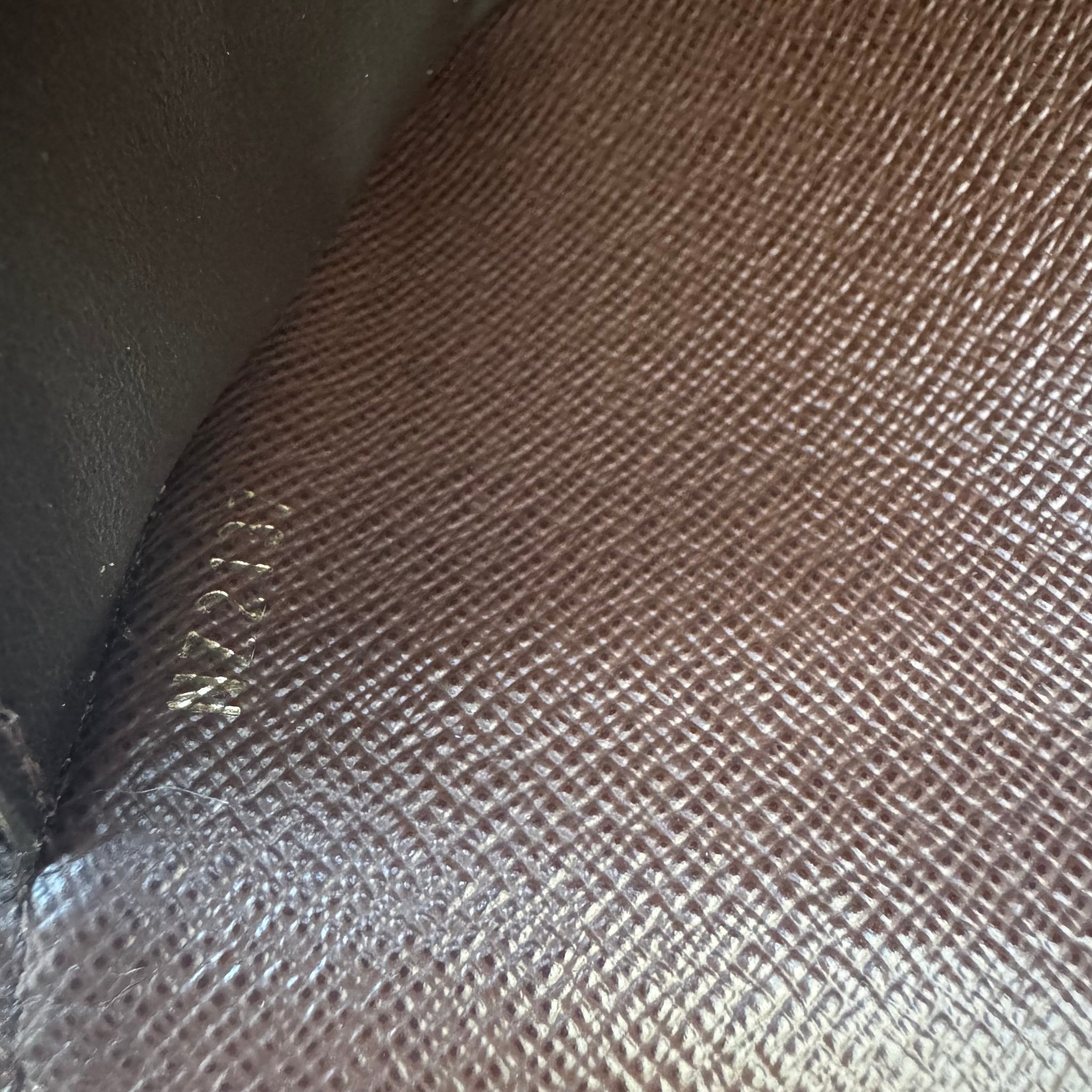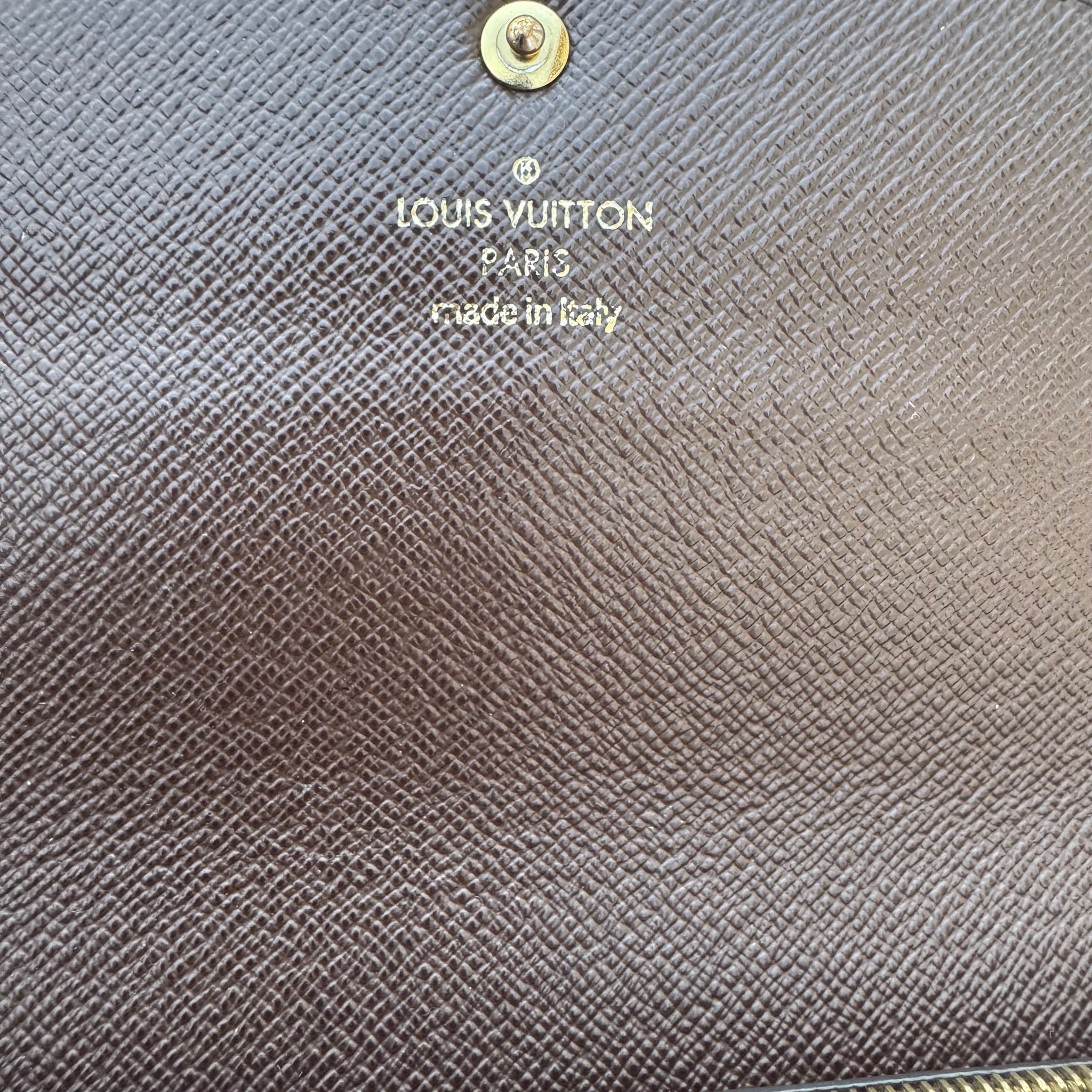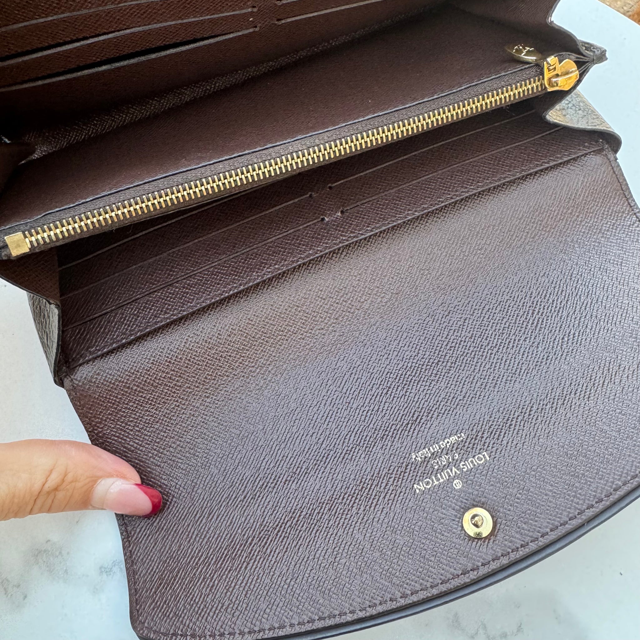 This is an authentic LOUIS VUITTON Damier Ebene Normandy Wallet in Black. This wallet is crafted of traditional Louis Vuitton checkerboard coated toile canvas in brown with a black leather front flap. The flap opens with a brass snap to a brown crossgrain leather interior with card slots, patch pocket, and a zipper compartment. Includes unbranded crossbody chan.