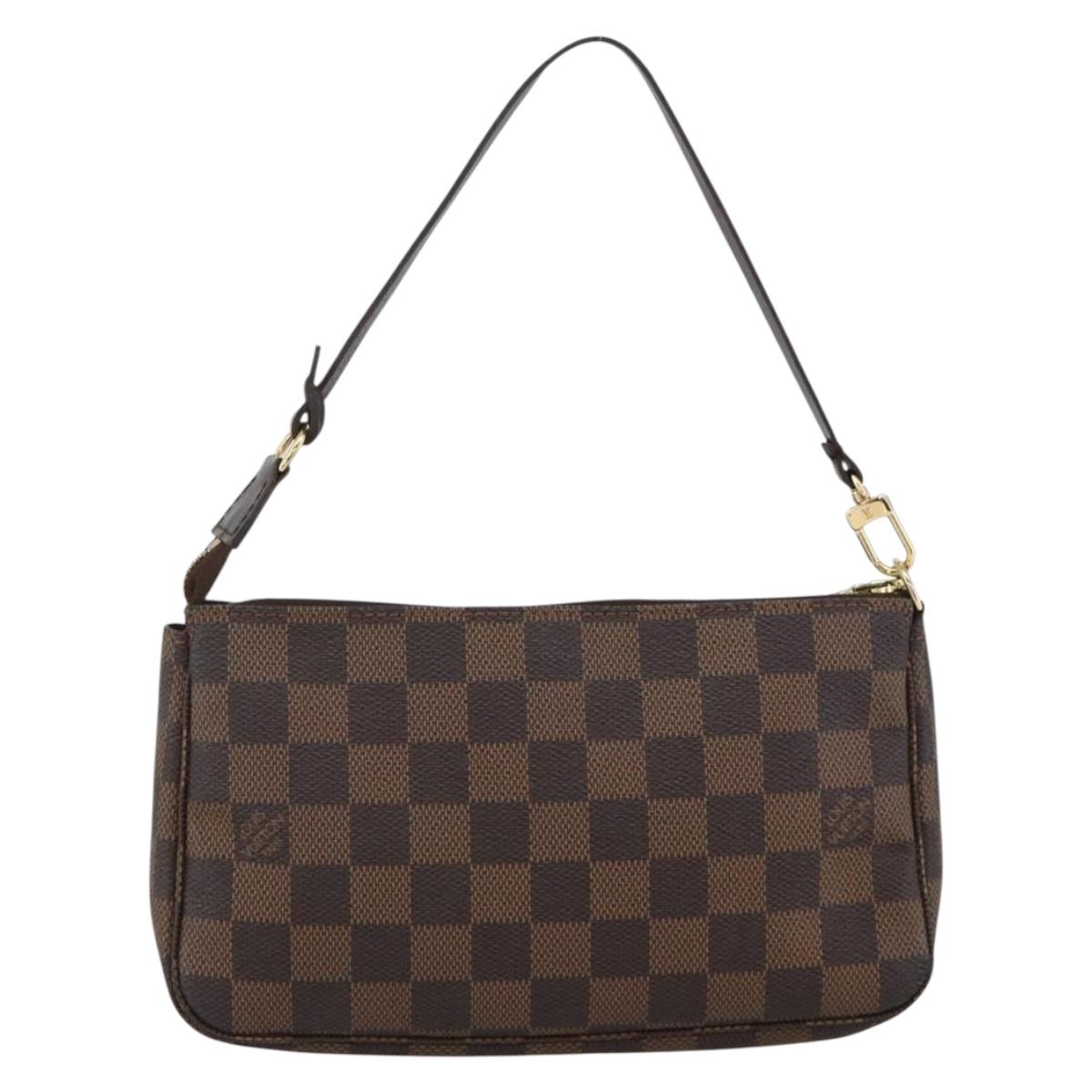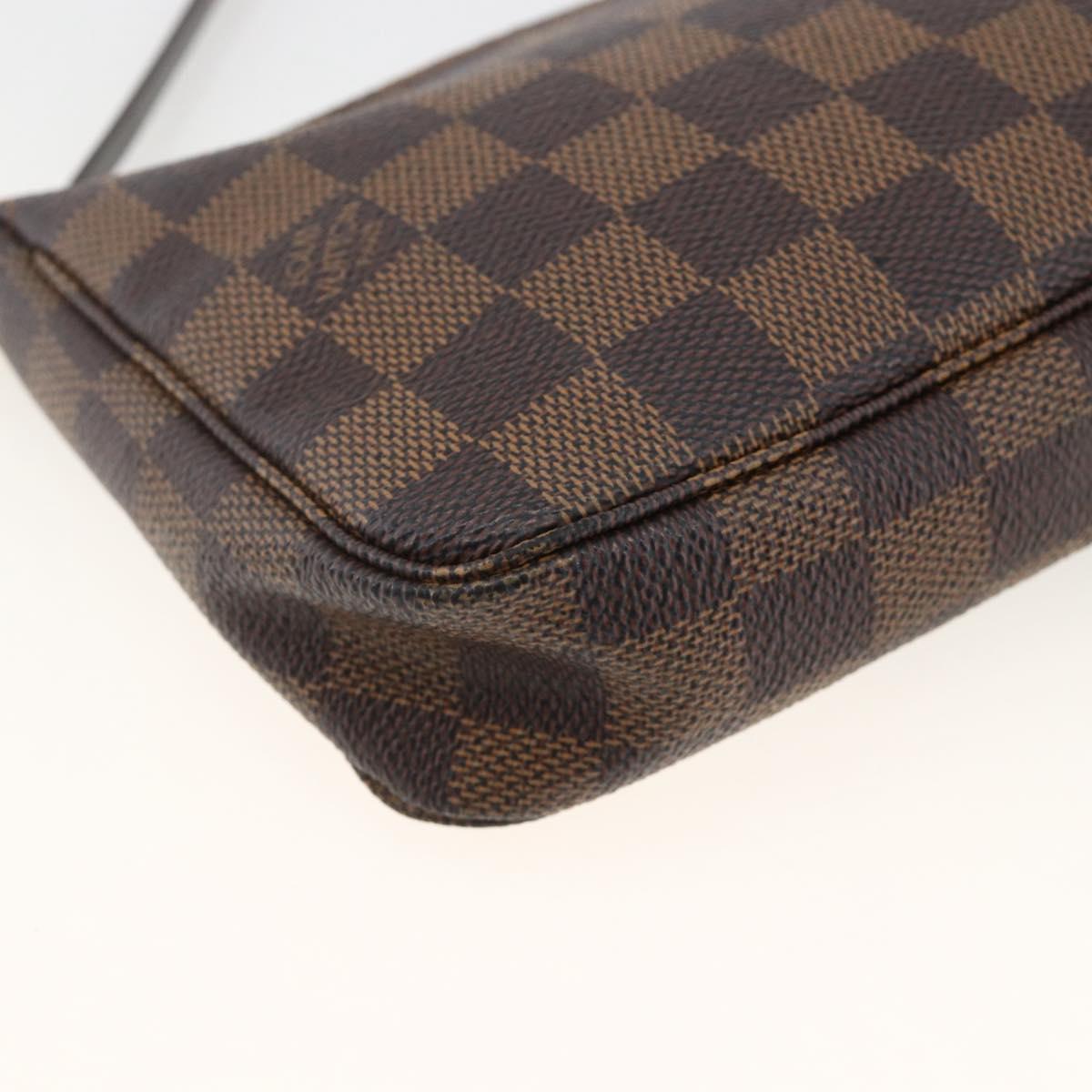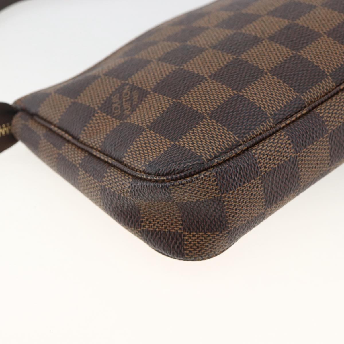 This is an authentic LOUIS VUITTON Pochette Accessories crafted of Louis Vuitton damier ebene coated canvas. The bag features a brown leather strap and a brass top zipper which opens to a red interior.