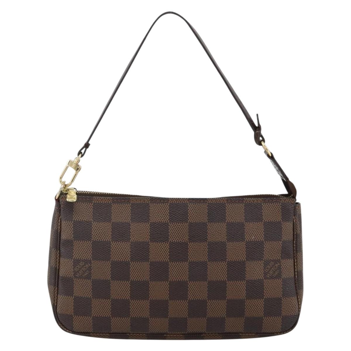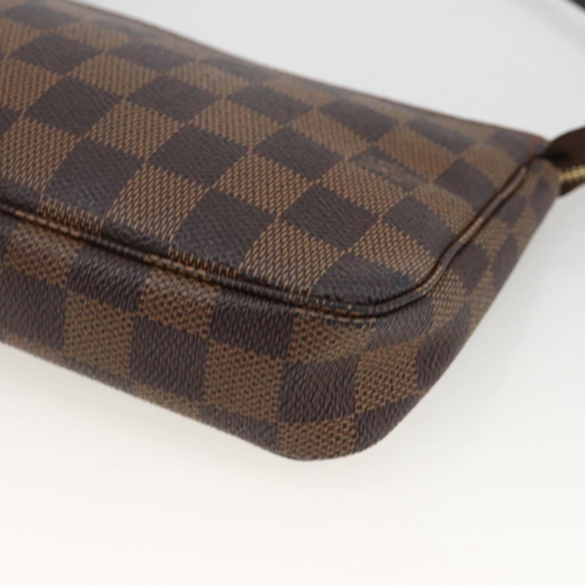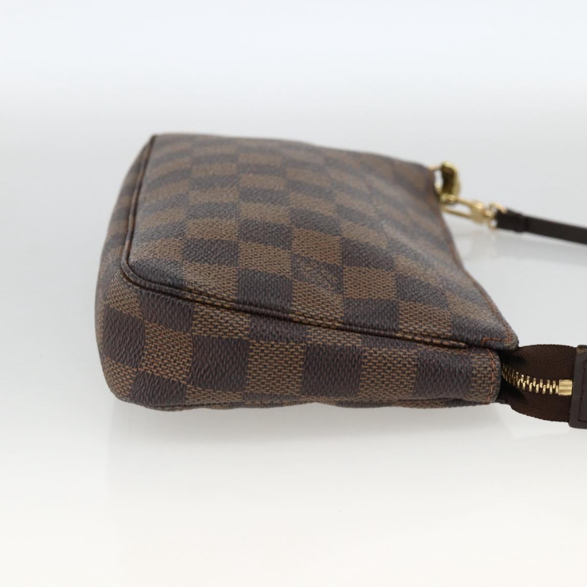 This is an authentic LOUIS VUITTON Pochette Accessories crafted of Louis Vuitton damier ebene coated canvas. The bag features a brown leather strap and a brass top zipper which opens to a red interior.