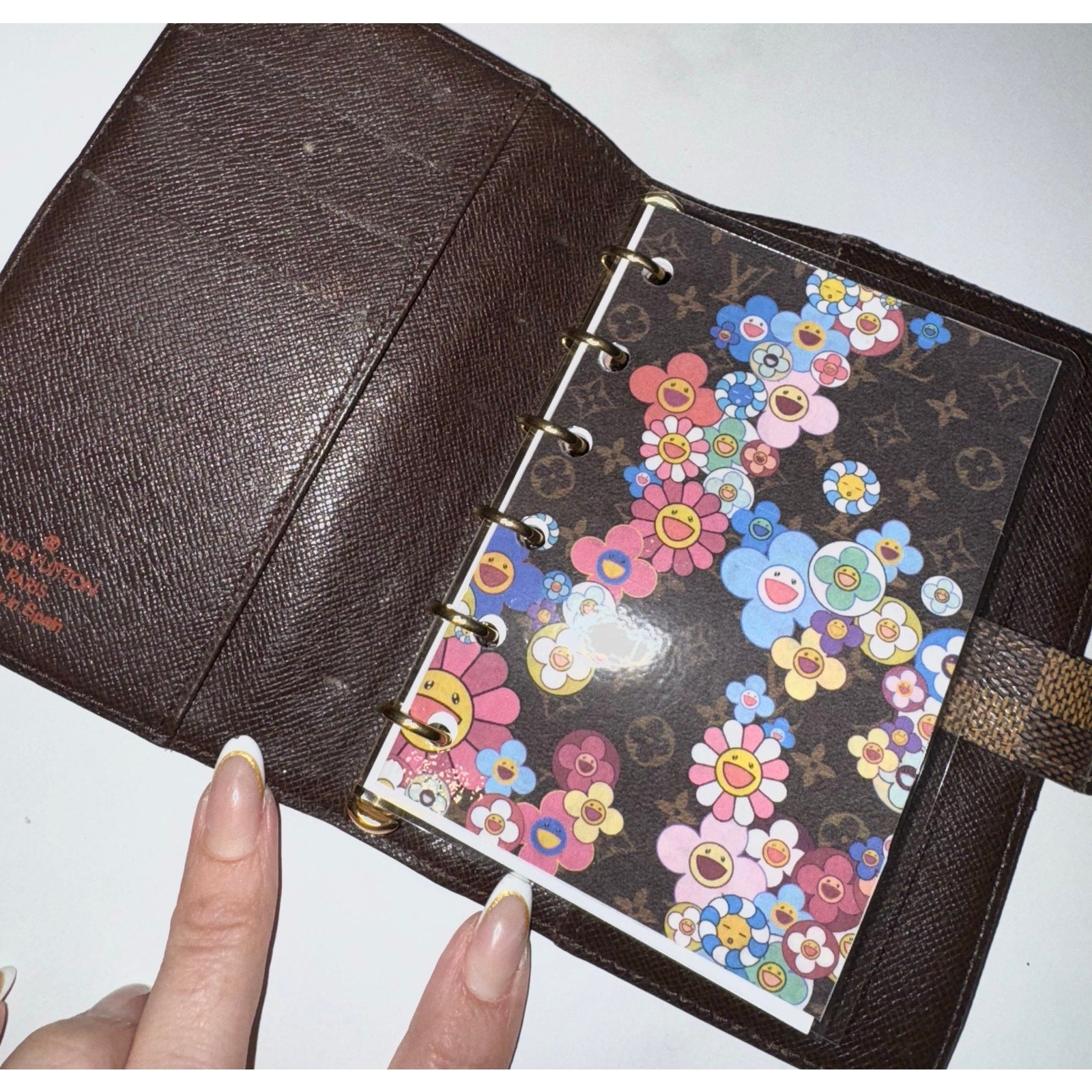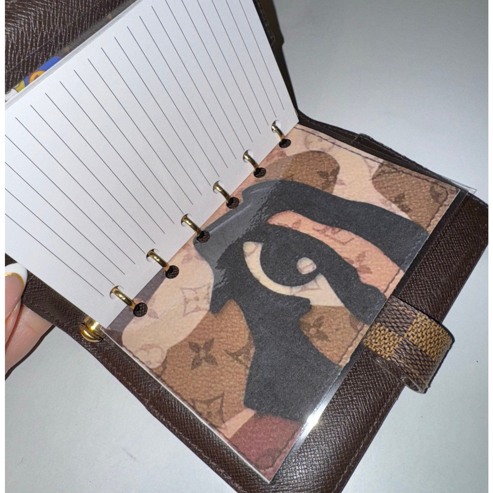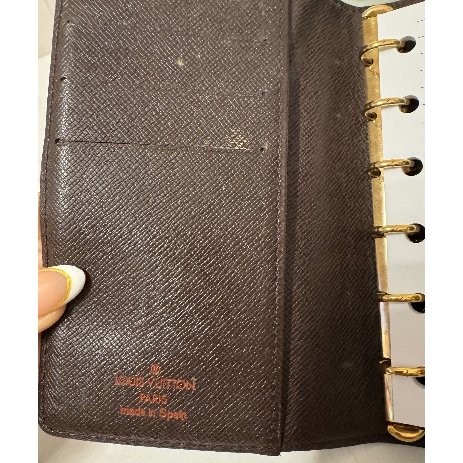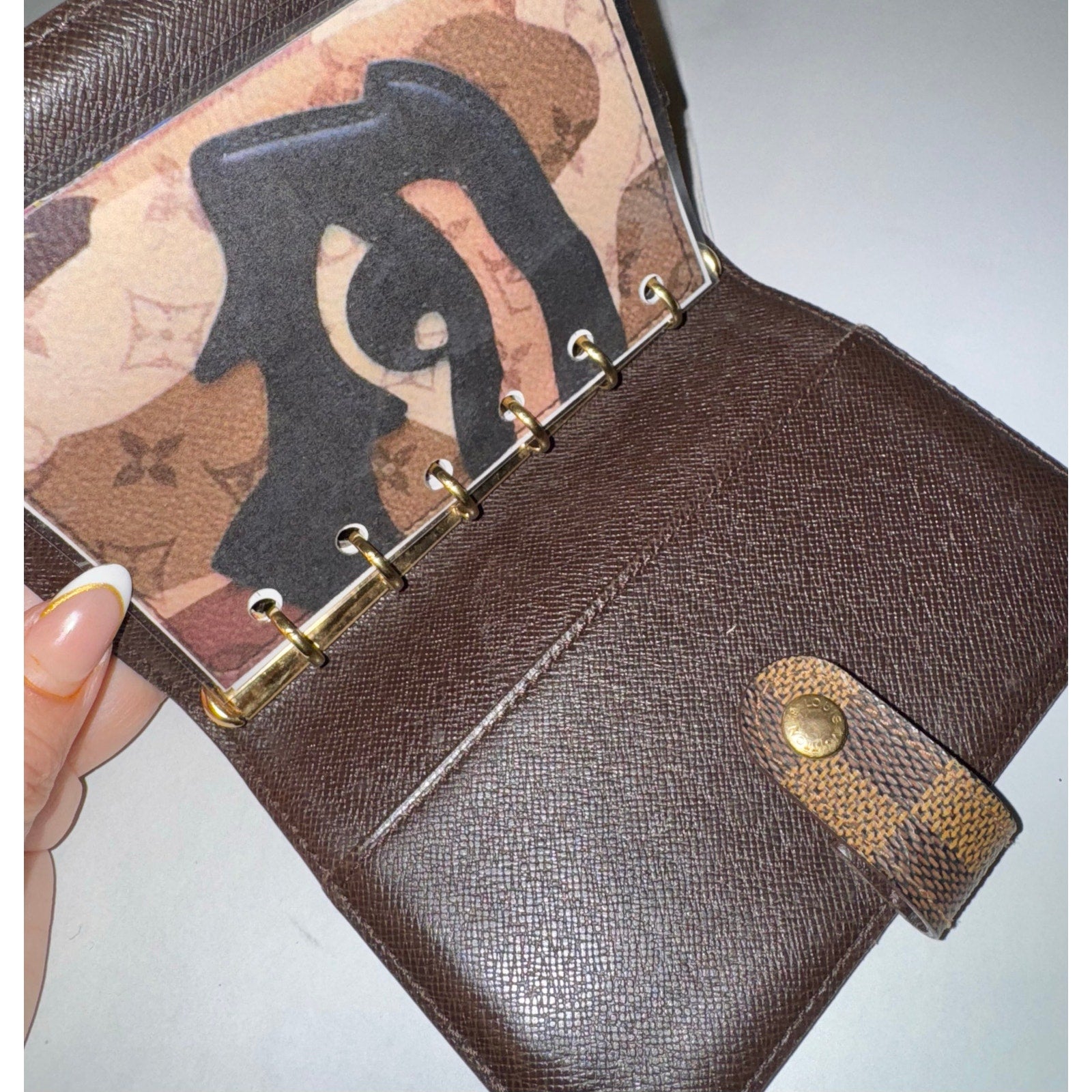 This is an authentic LOUIS VUITTON Small Ring Agenda Cover crafted of durable damier ebene coated canvas held by a snap closure. It opens to an interior of terracotta cross-grained leather with three card slots, two large pockets, and a brass 6-ring binder. Includes 2 full color custom laminated inserts and paper.