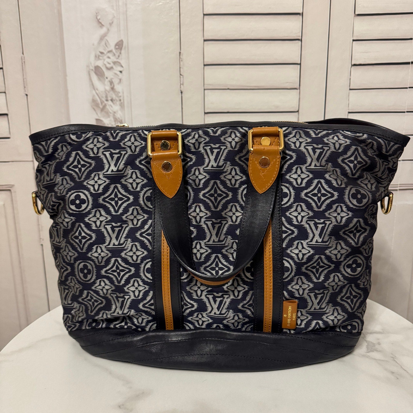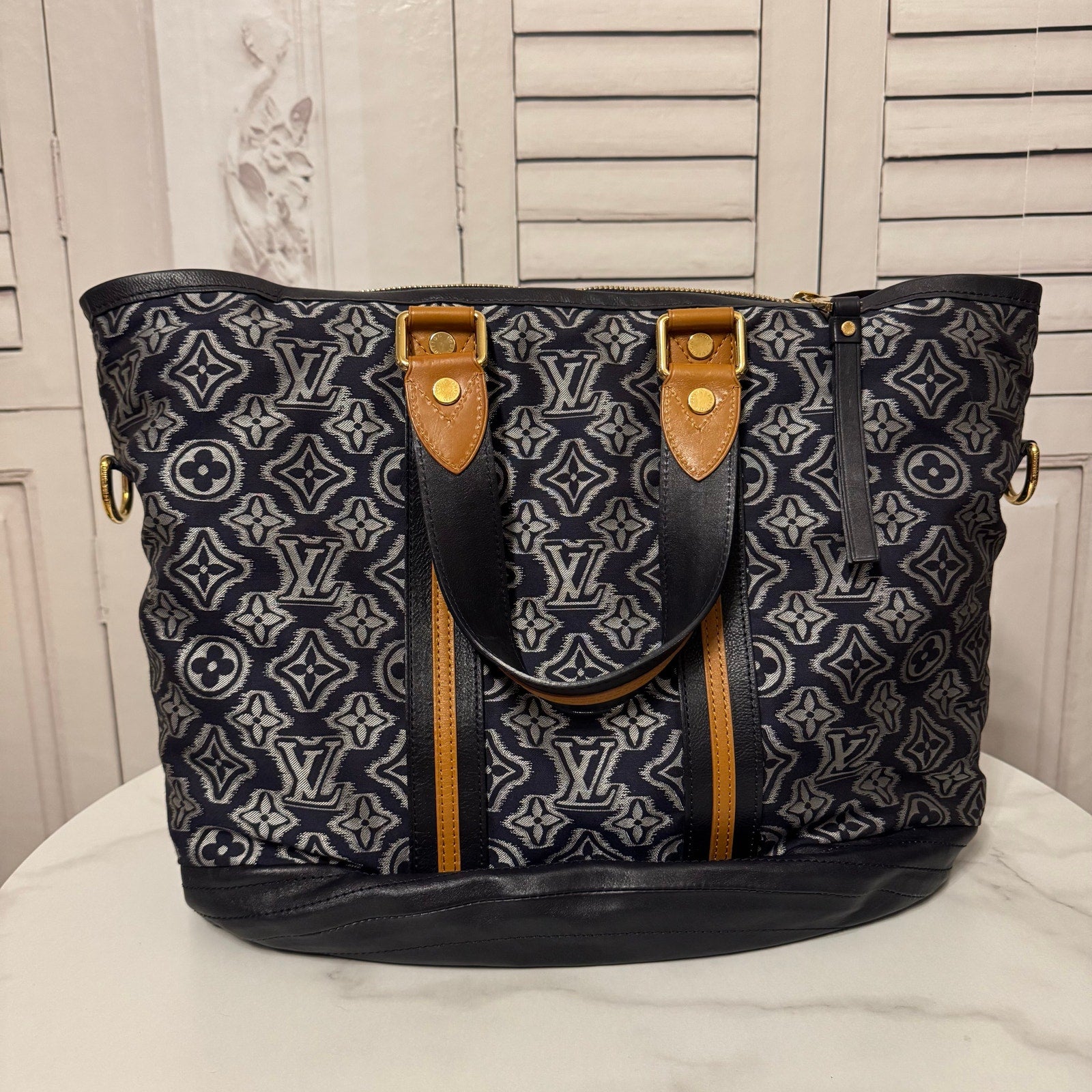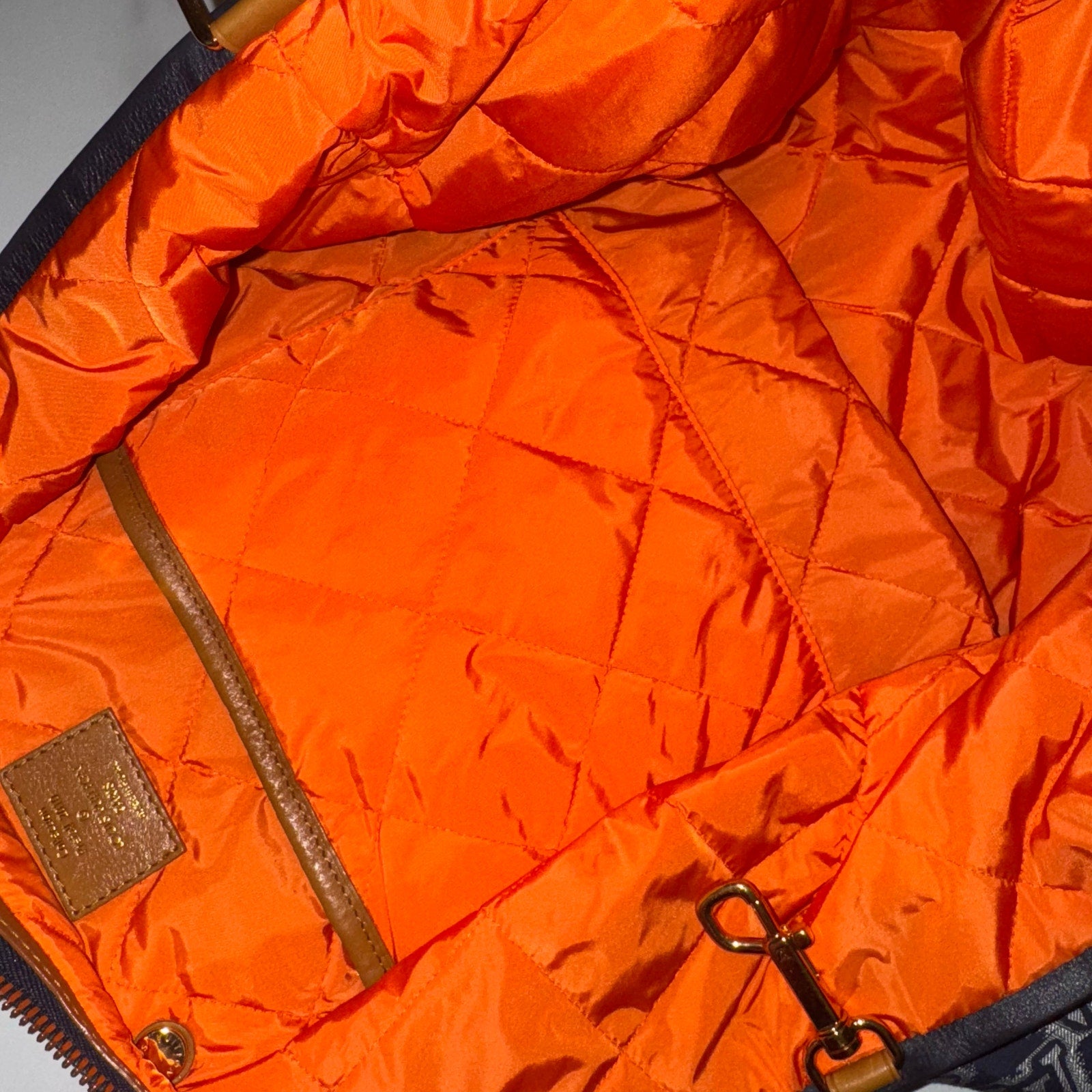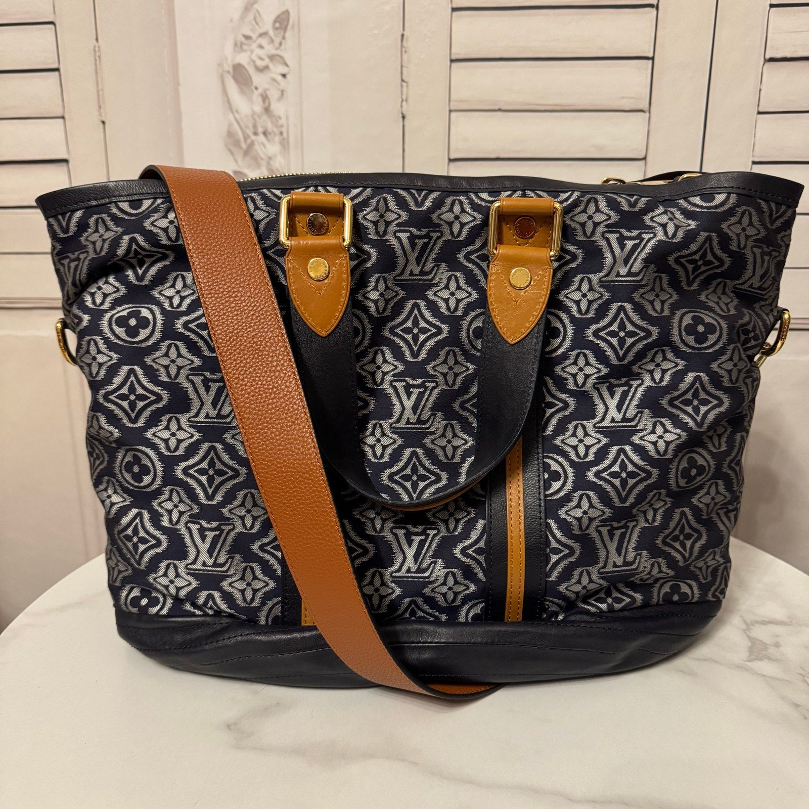 This is an authentic LOUIS VUITTON Jacquard Monogram Aviator in Navy. This chic and spacious bag is crafted of silver and blue jacquard fabric, featuring a silver monogrammed print. The base and side trim feature tan and navy leather, which match the top handles. The top polished gold zipper opens to a quilted orange nylon interior with a patch pocket. The original shoulder strap is NOT included, however a non-branded matching shoulder strap is provided.