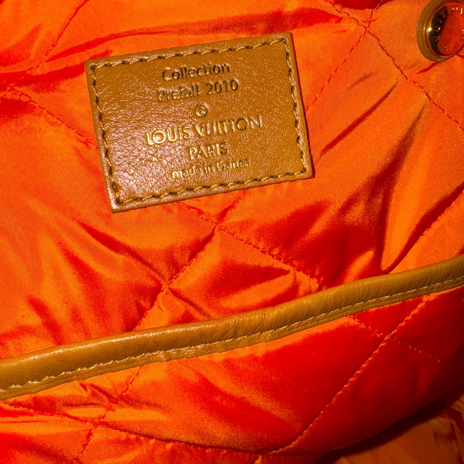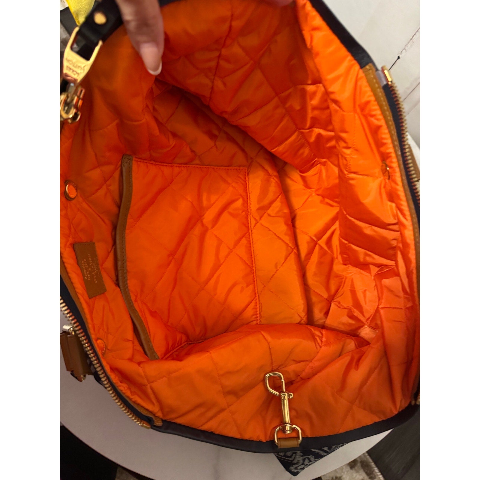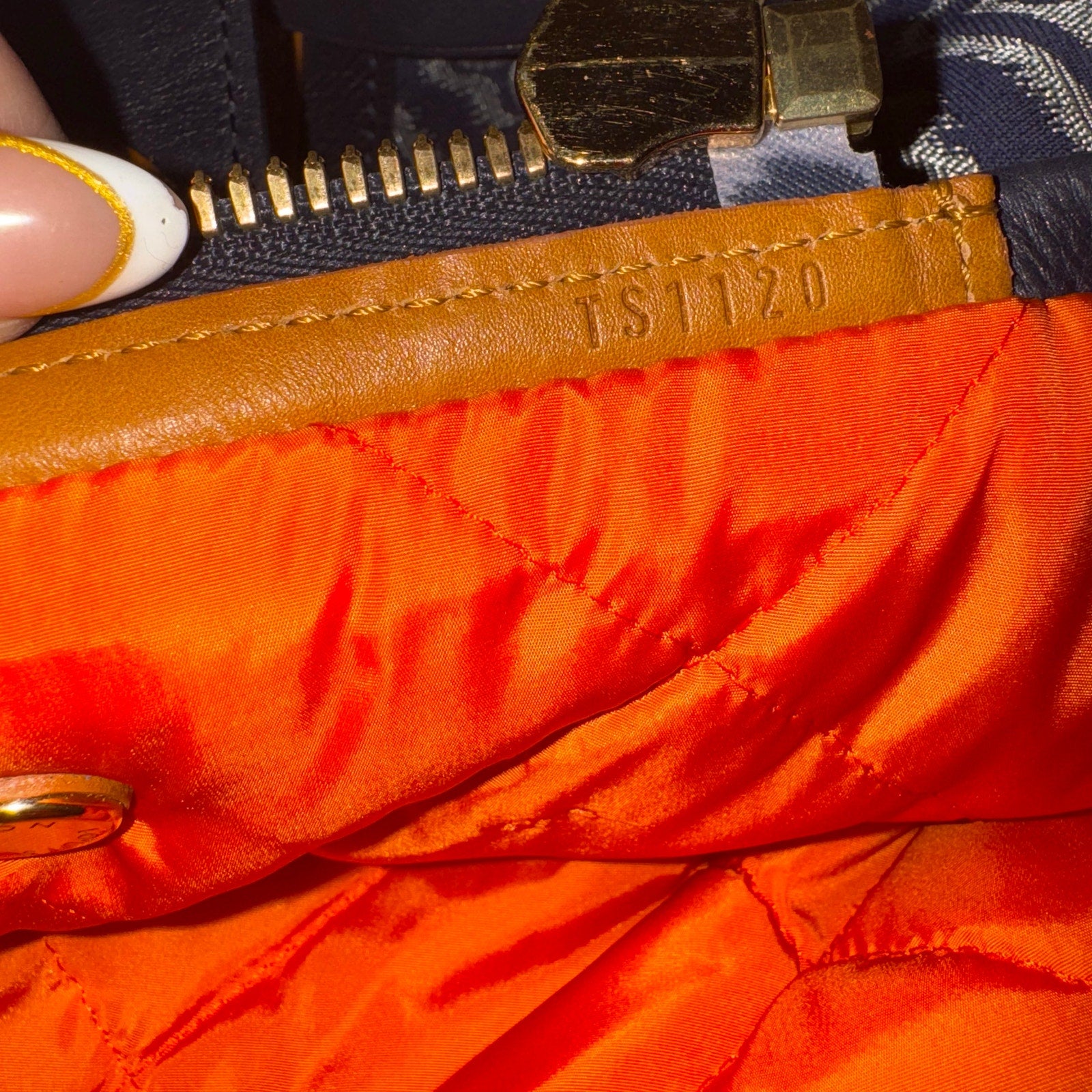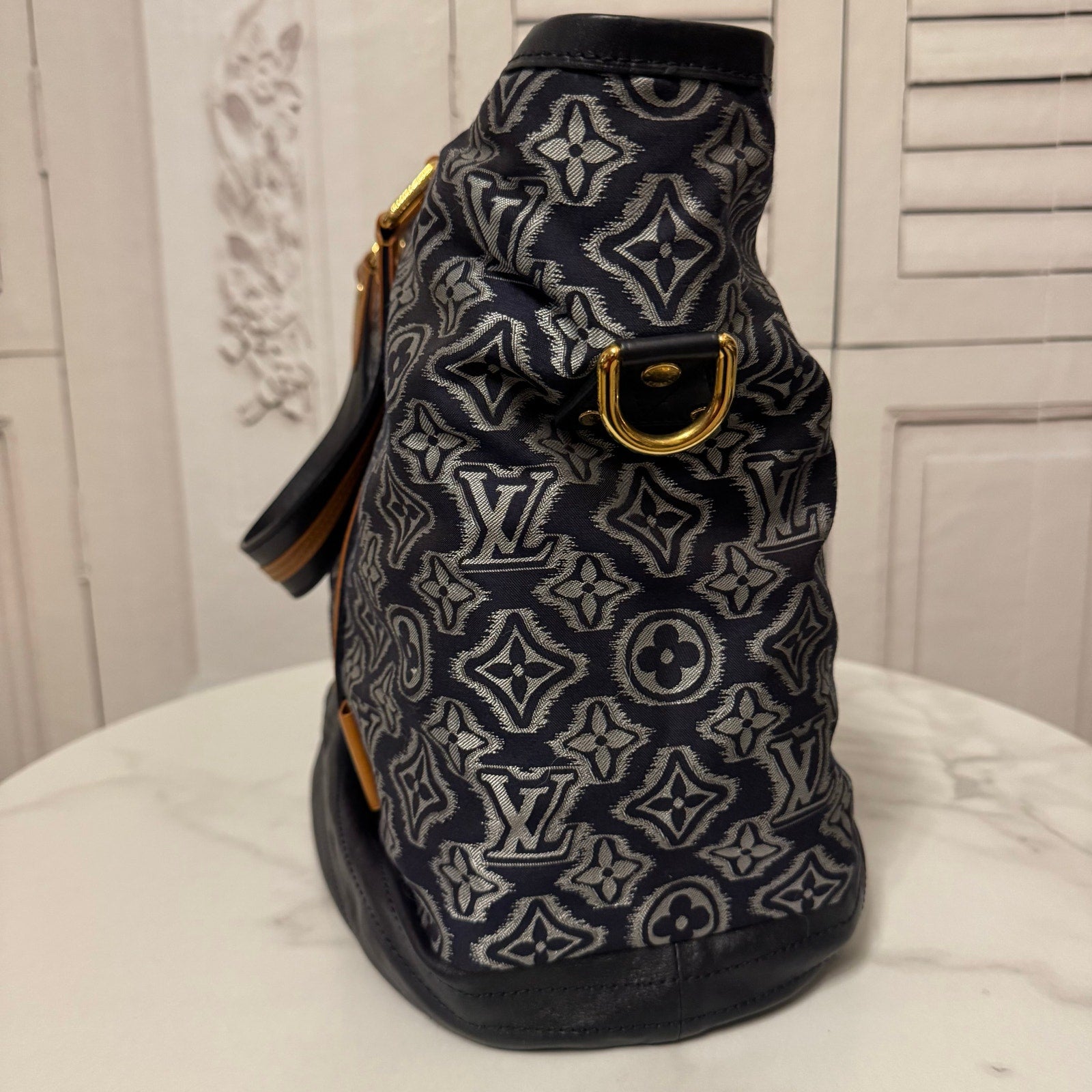 This is an authentic LOUIS VUITTON Jacquard Monogram Aviator in Navy. This chic and spacious bag is crafted of silver and blue jacquard fabric, featuring a silver monogrammed print. The base and side trim feature tan and navy leather, which match the top handles. The top polished gold zipper opens to a quilted orange nylon interior with a patch pocket. The original shoulder strap is NOT included, however a non-branded matching shoulder strap is provided.