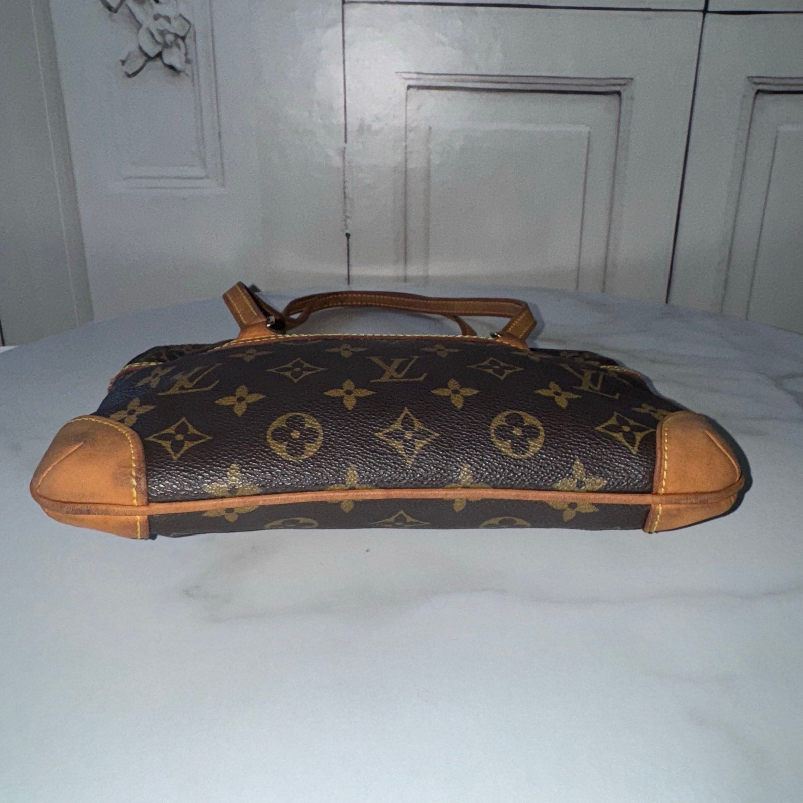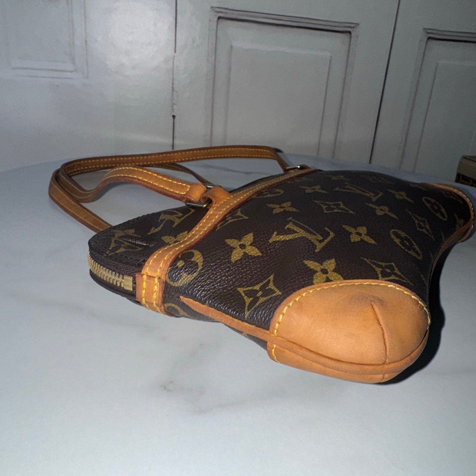 This is an authentic LOUIS VUITTON Mini Monogram Coussin PM. This lovely shoulder bag is crafted of classic Louis Vuitton monogram on signature toile canvas, complemented by vachetta cowhide leather trim and strap handles. There is a convenient patch pocket on the front, and the top zipper opens to a raspberry red alcantara fabric interior with patch pockets.