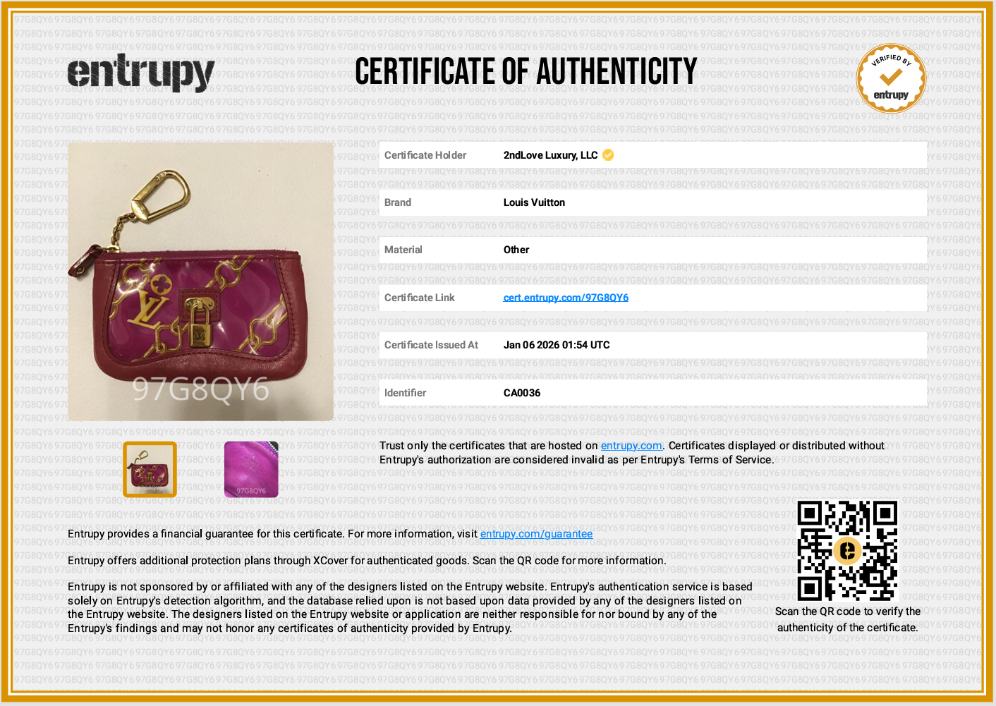 This is an authentic LOUIS VUITTON Monogram Charms Key Pouch Fuchsia. This stylish key pouch is crafted of vinyl coated printed canvas with a trim of cowhide leather and a frontal decorative polished brass padlock. The purse features a D-ring clasp and chain attachable to your Louis Vuitton handbag and a leather zipper pull that opens to a matching leather interior.