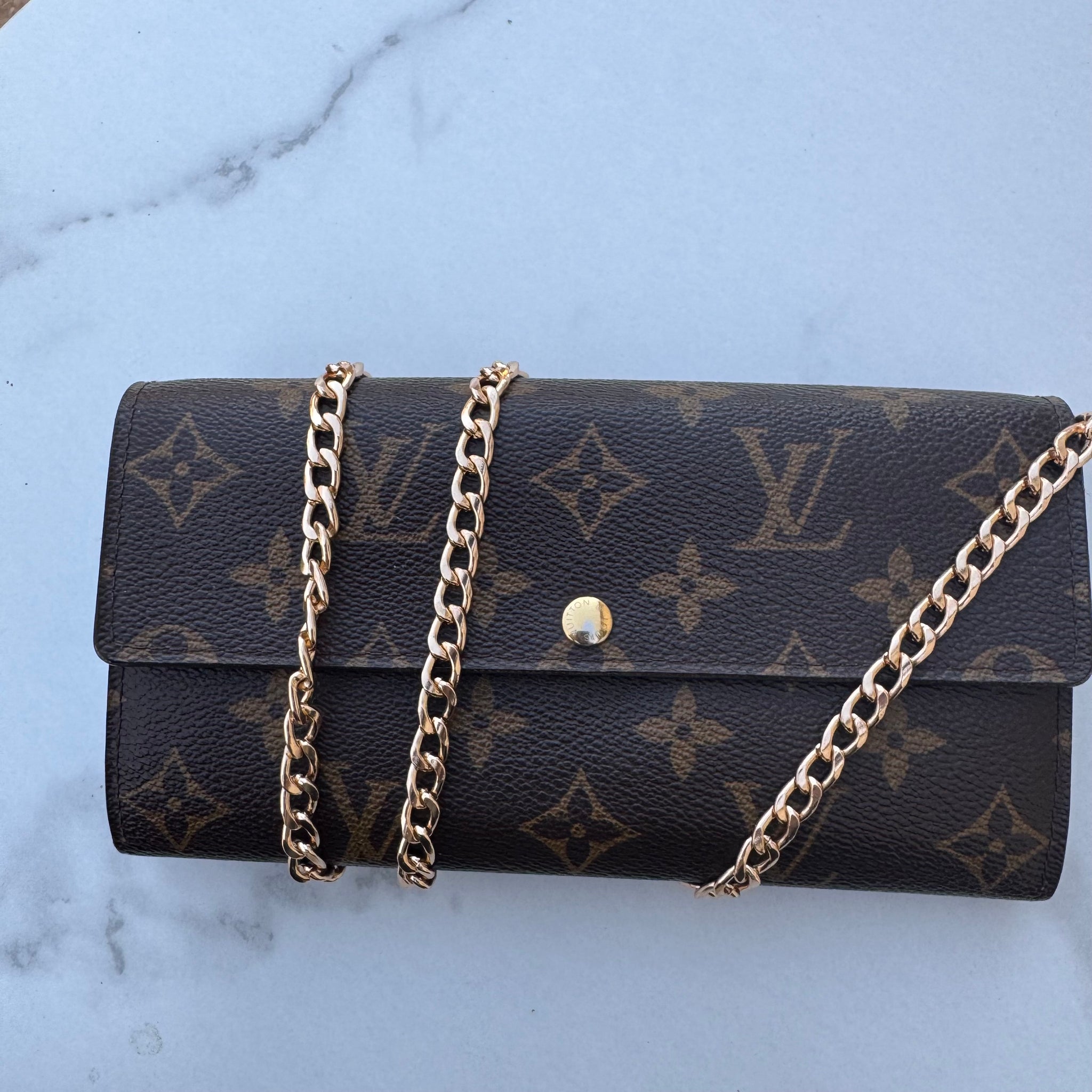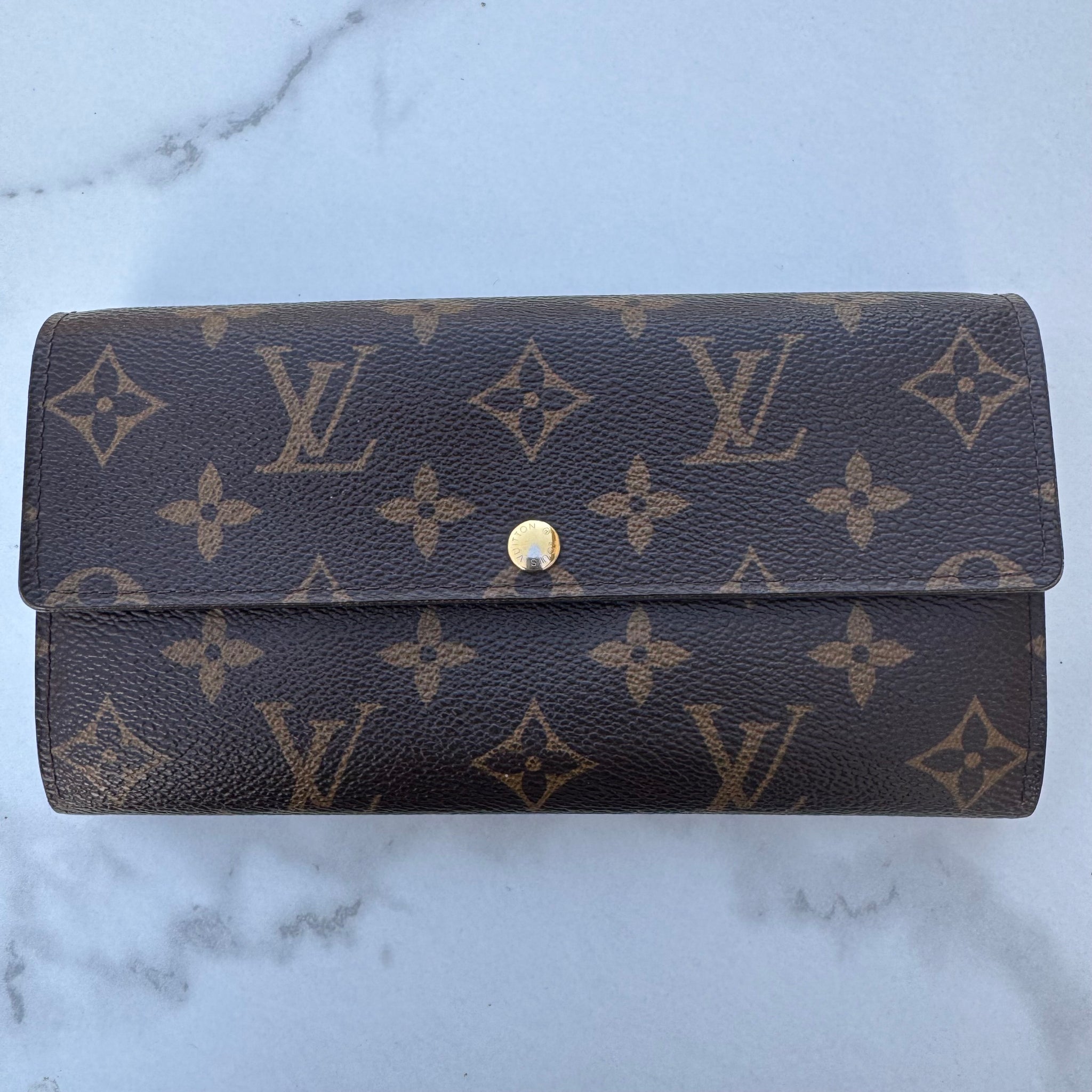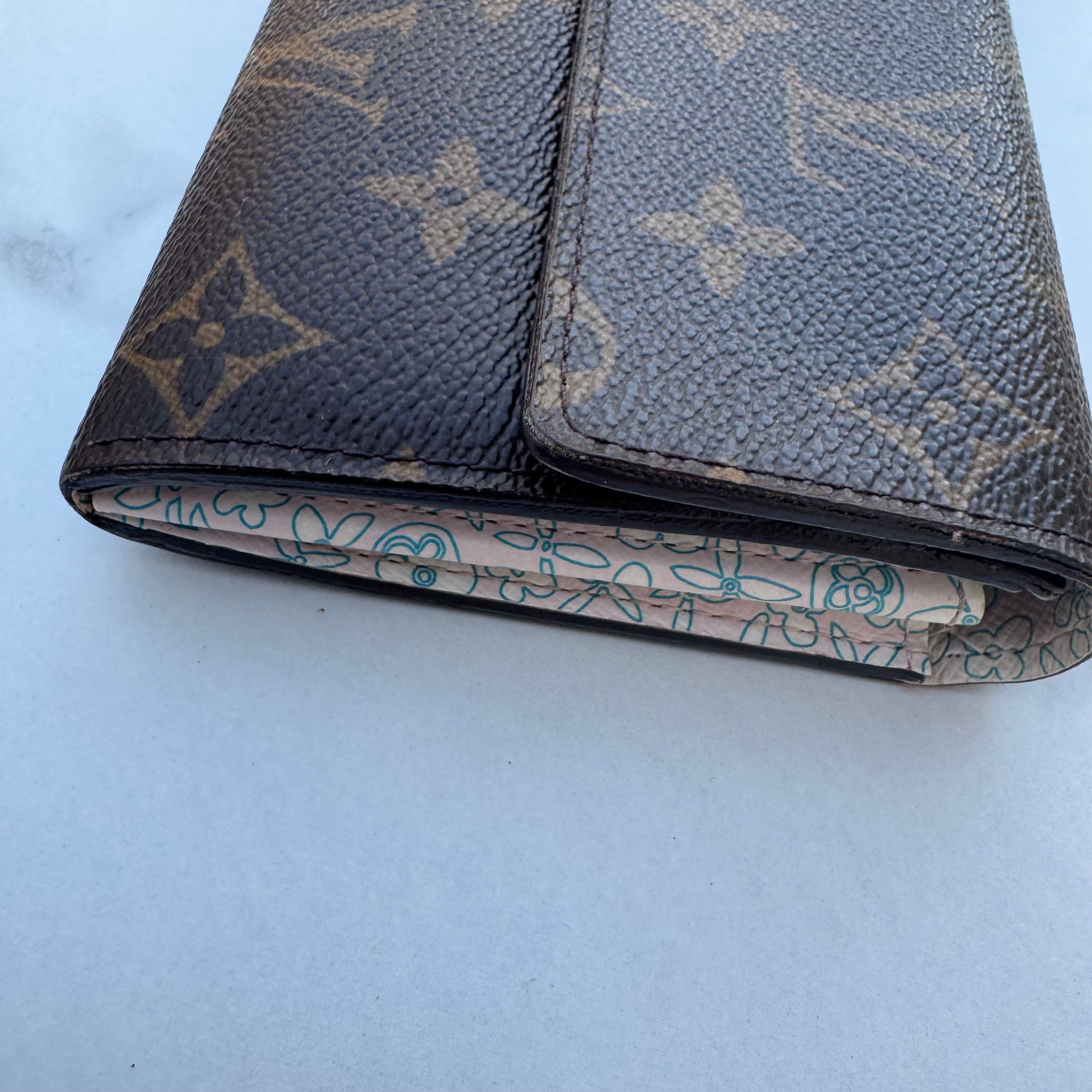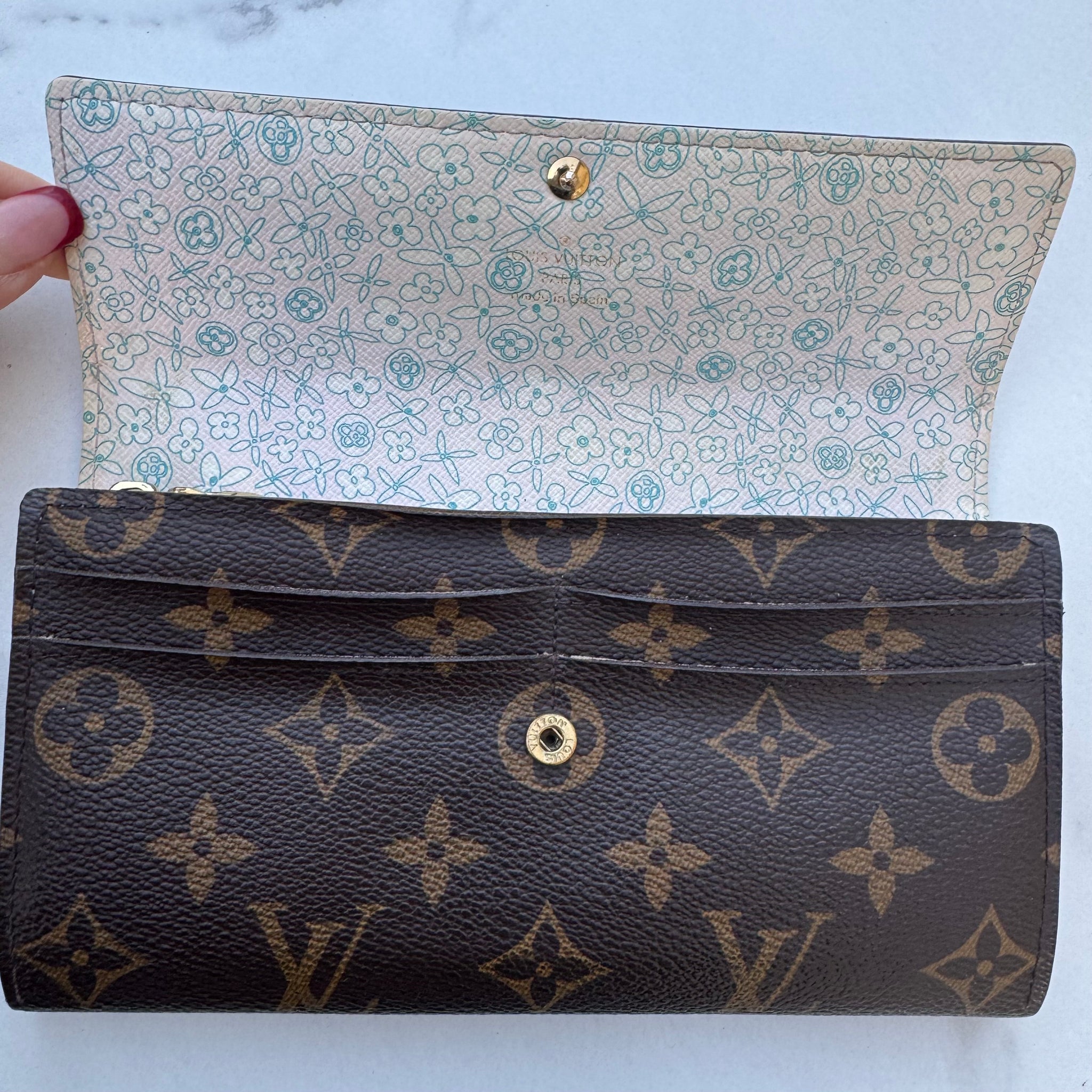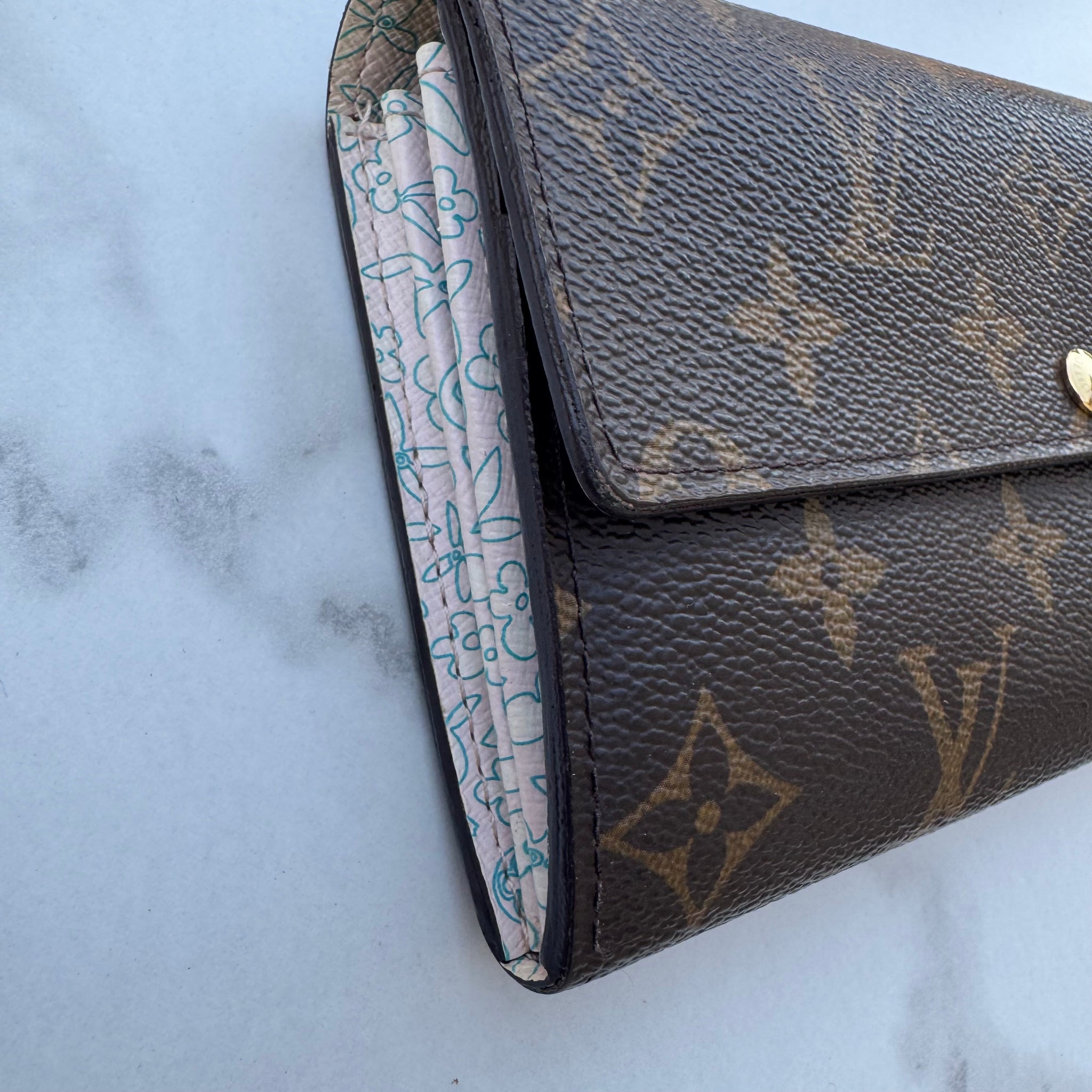 This is the authentic LOUIS VUITTON Monogram Fleuri Sarah Wallet. This classic clutch wallet is crafted of traditional monogram coated canvas. The frontal half flap opens with a snap to a floral crossgrain leather interior with a zippered section and two open compartments. Includes unbranded crossbody chain.