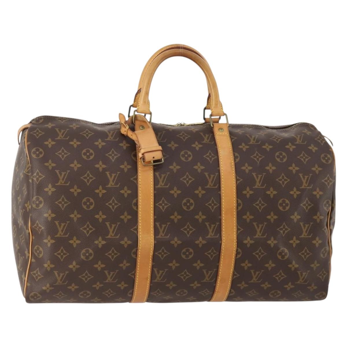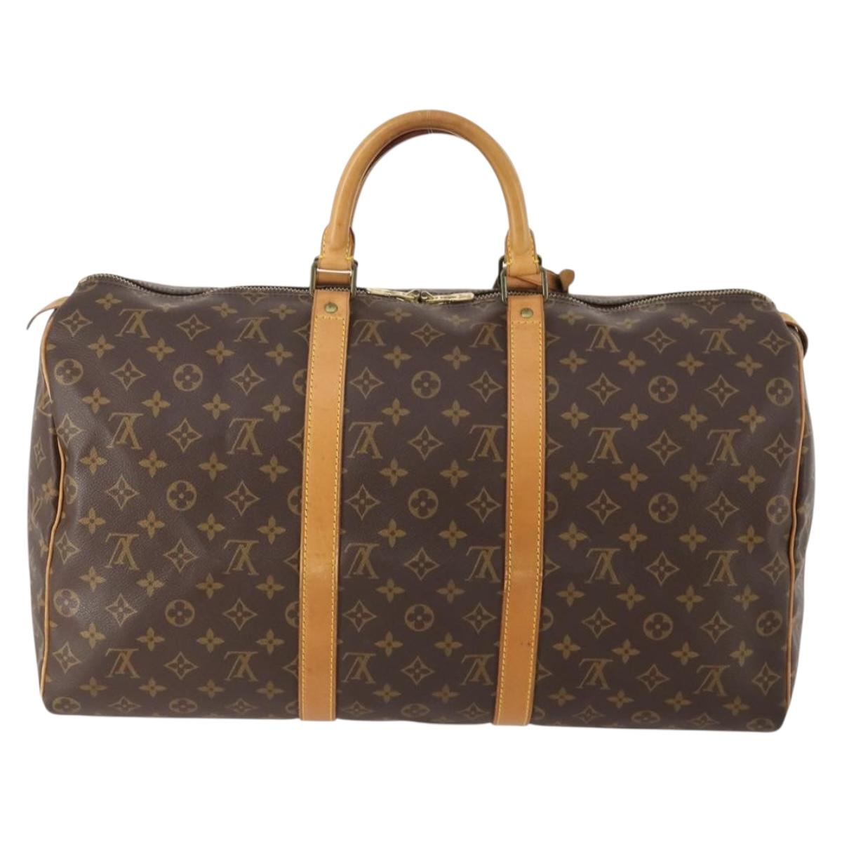 This is an authentic LOUIS VUITTON Monogram Keepall 50. This stylish duffel is crafted of signature Louis Vuitton monogram coated canvas. This bag features vachetta cowhide leather trim including rolled top handles. The polished brass top zippers open to a spacious cocoa brown fabric interior.