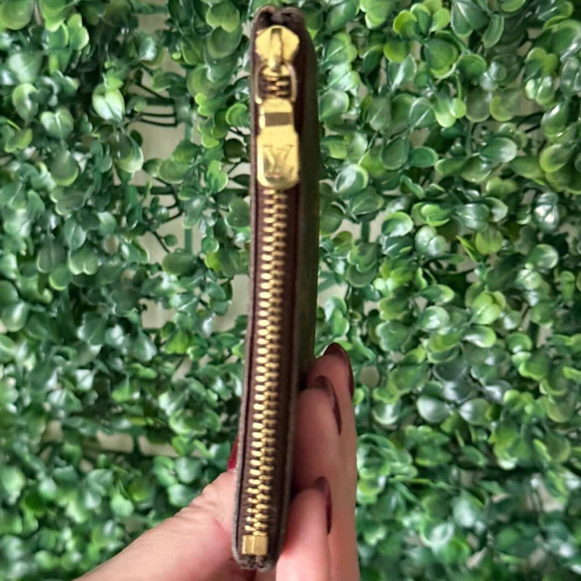This is an authentic LOUIS VUITTON Monogram Key Pouch. This pouch is crafted of Louis Vuitton monogram toile canvas in brown. The top zipper opens top a brown, cross-grain leather interior with an attached carabiner that can be clipped to your keys or handbag.