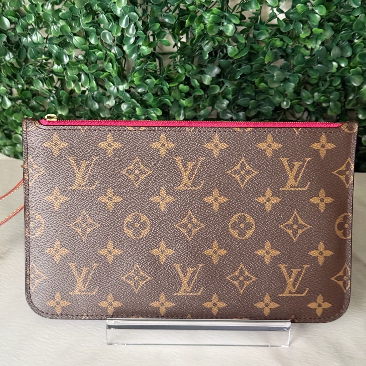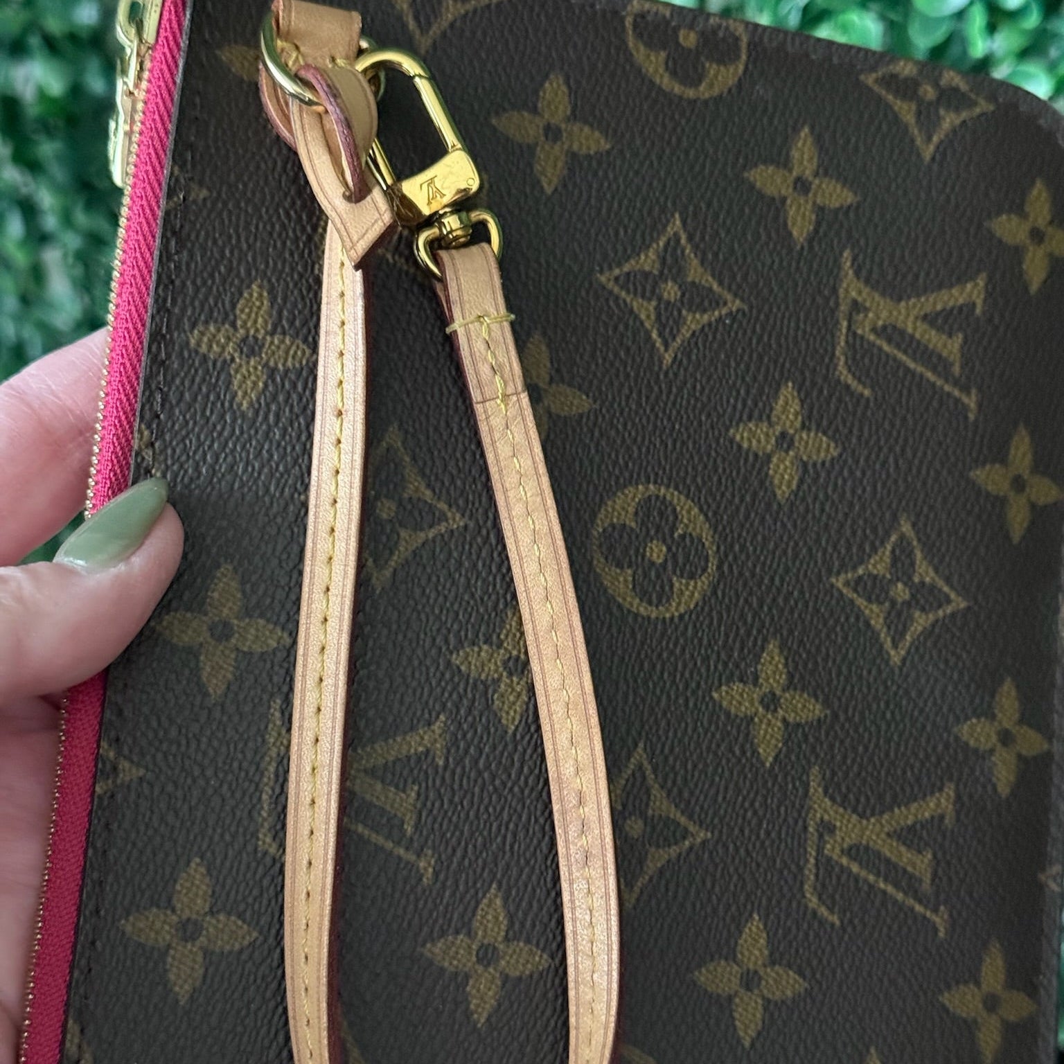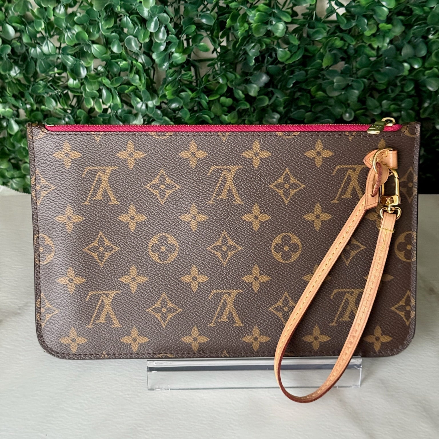 This is an authentic LOUIS VUITTON Monogram Neverfull MM and Pouch crafted of classic Louis Vuitton monogram coated canvas with a detachable vachetta leather wrist strap. The top unzips to a striped fuchsia fabric interior with an internal pocket. It fits an iPhone ProMax!