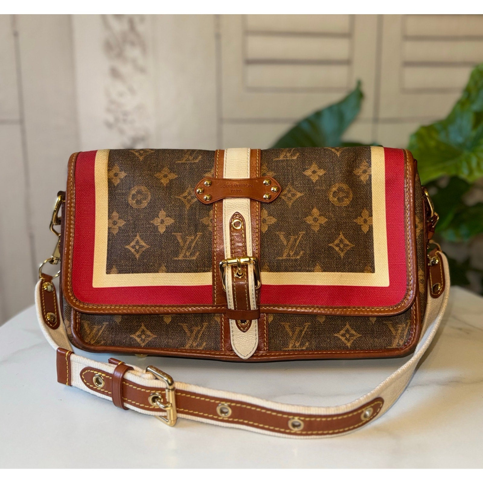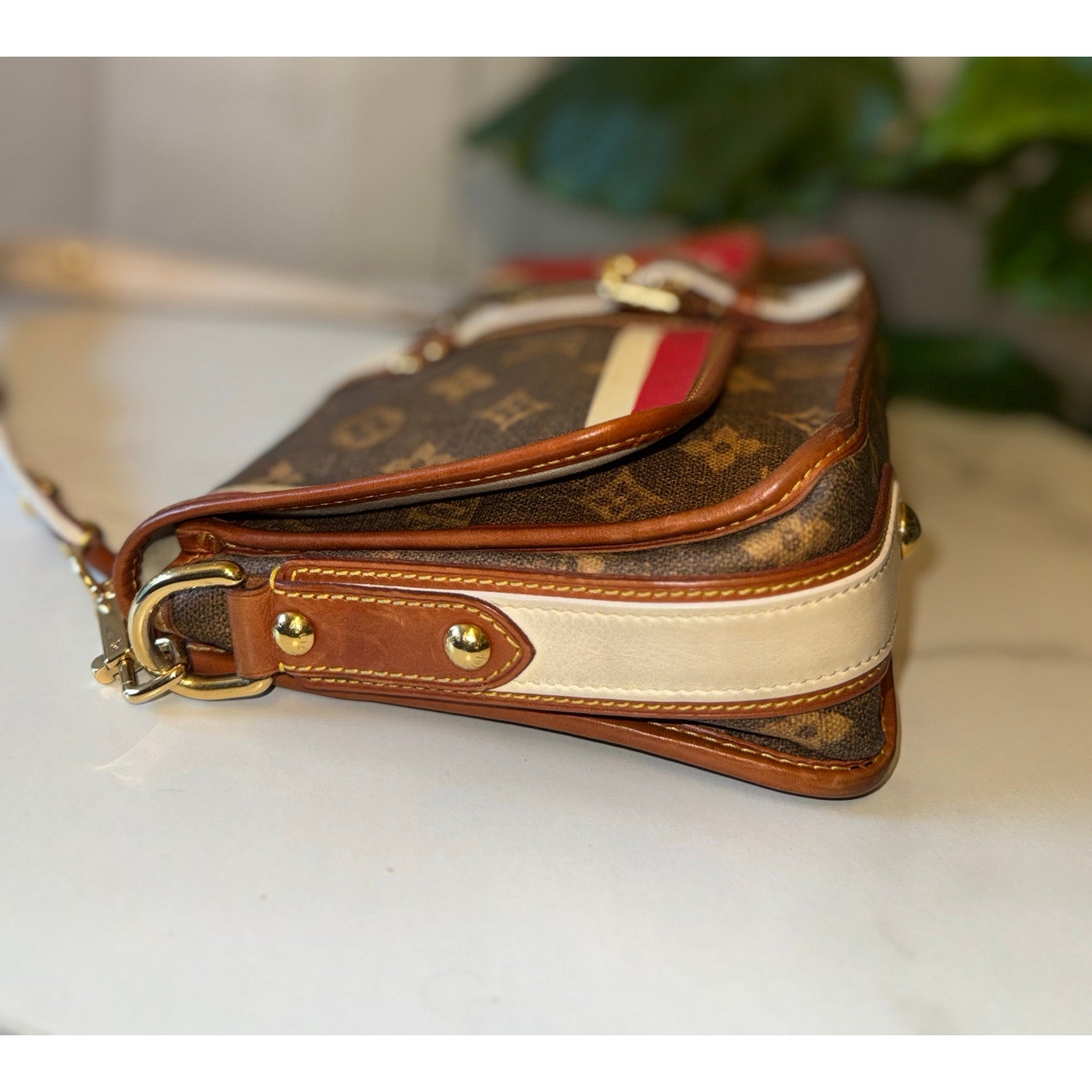 This is an authentic LOUIS VUITTON Monogram Tisse Rayures shoulder bag crafted of a distinctive Louis Vuitton monogram pulp created canvas. The bag features an optional white nylon shoulder strap with toffee leather support and brass hardware, a frontal flap with white and red striped borders, and a leather strap closure with a brass buckle. This opens the frontal flap to a white interior a pocket.