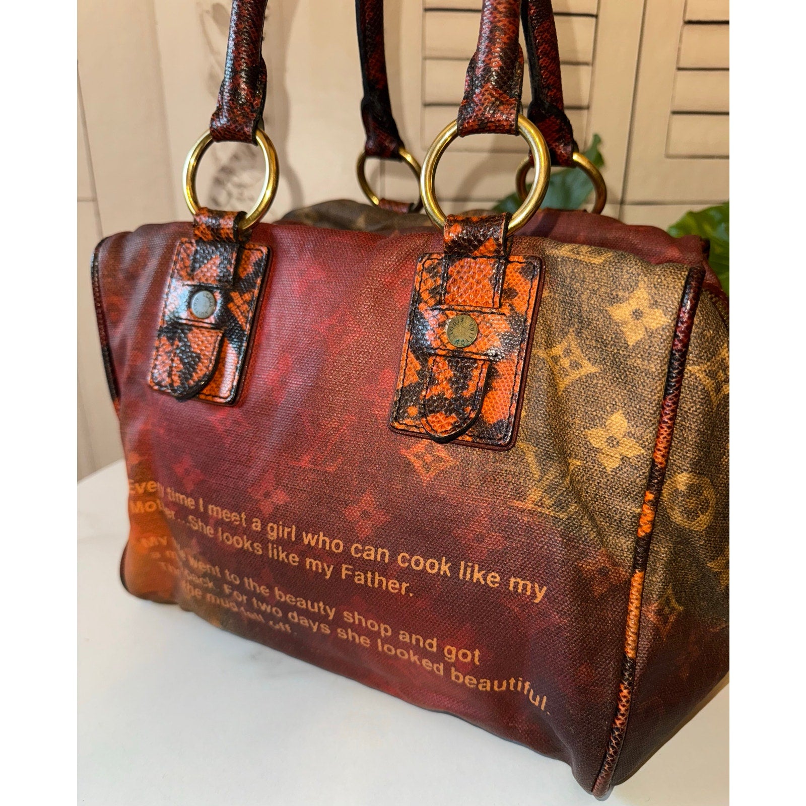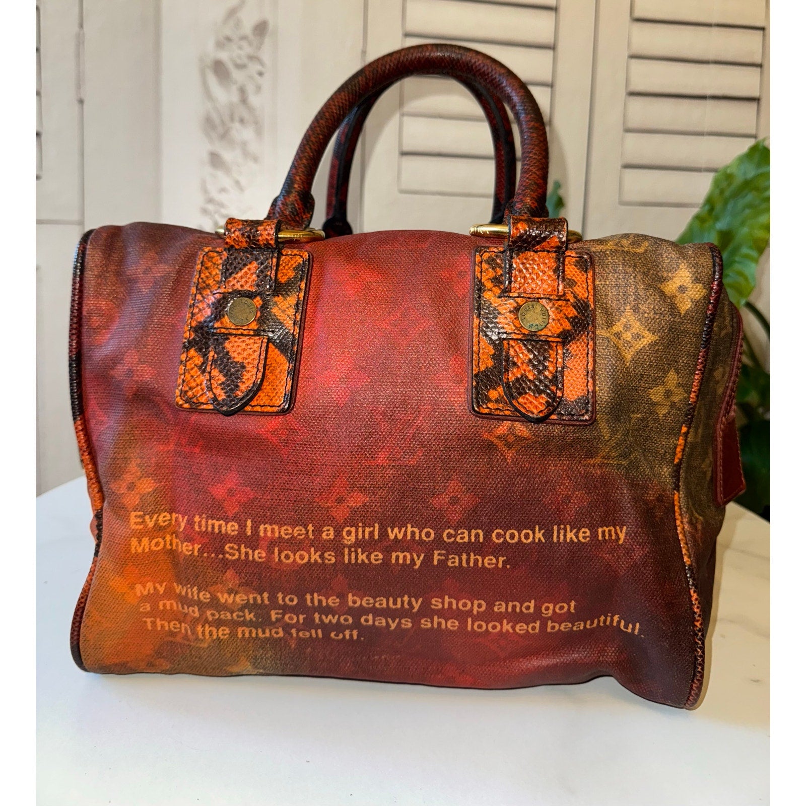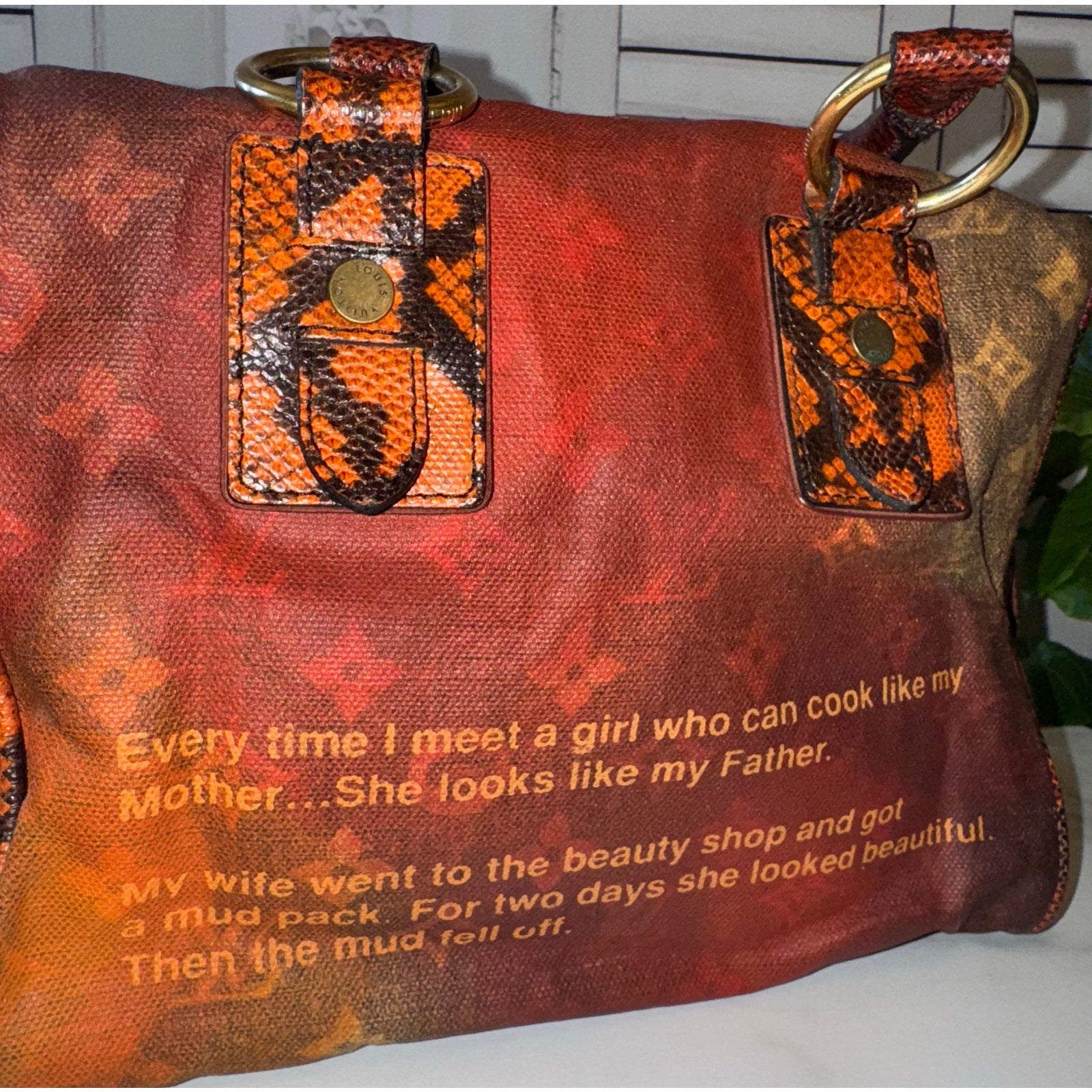 This is an authentic LOUIS VUITTON Richard Prince Mancrazy Jokes Bag. This exceptional tote is created of classic Louis Vuitton monogram coated canvas and an additional layer of bold and bright graffiti style colors with printed jokes. The bag features rolled snakeskin top handles and trim with polished brass hardware. The top features two zippers that each open to a microfiber interior with patch pockets.
