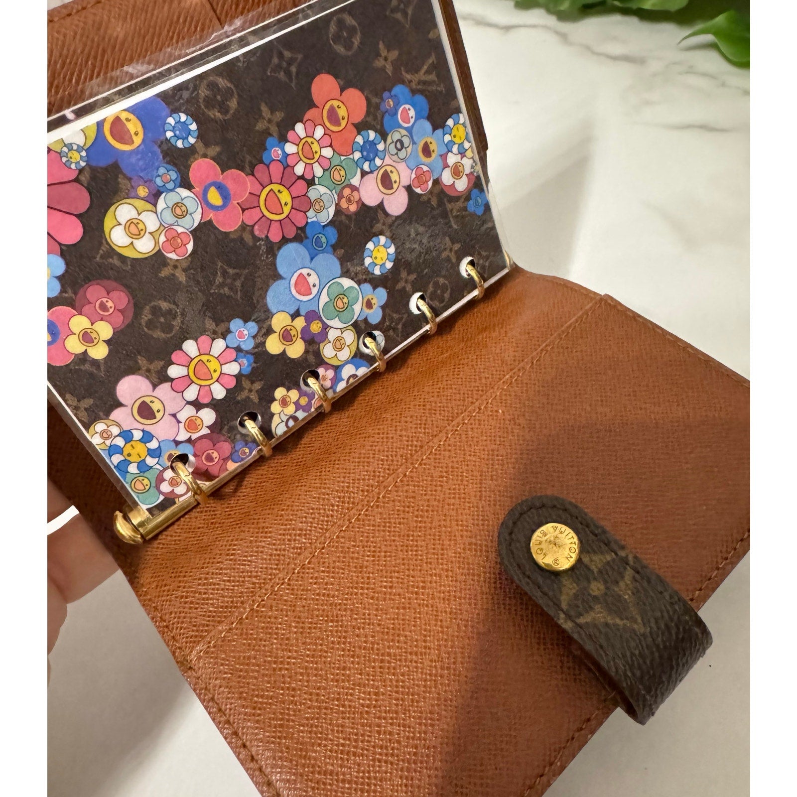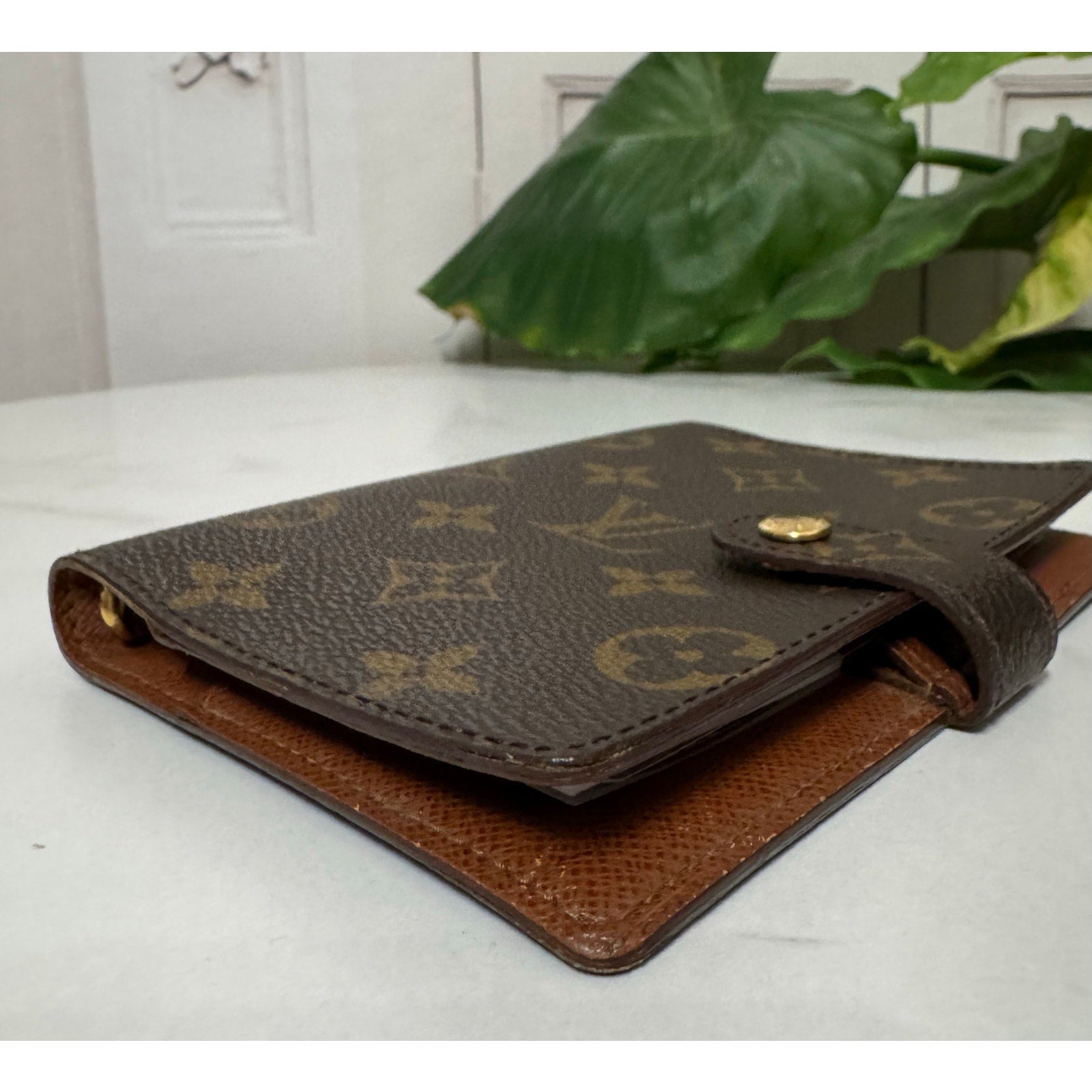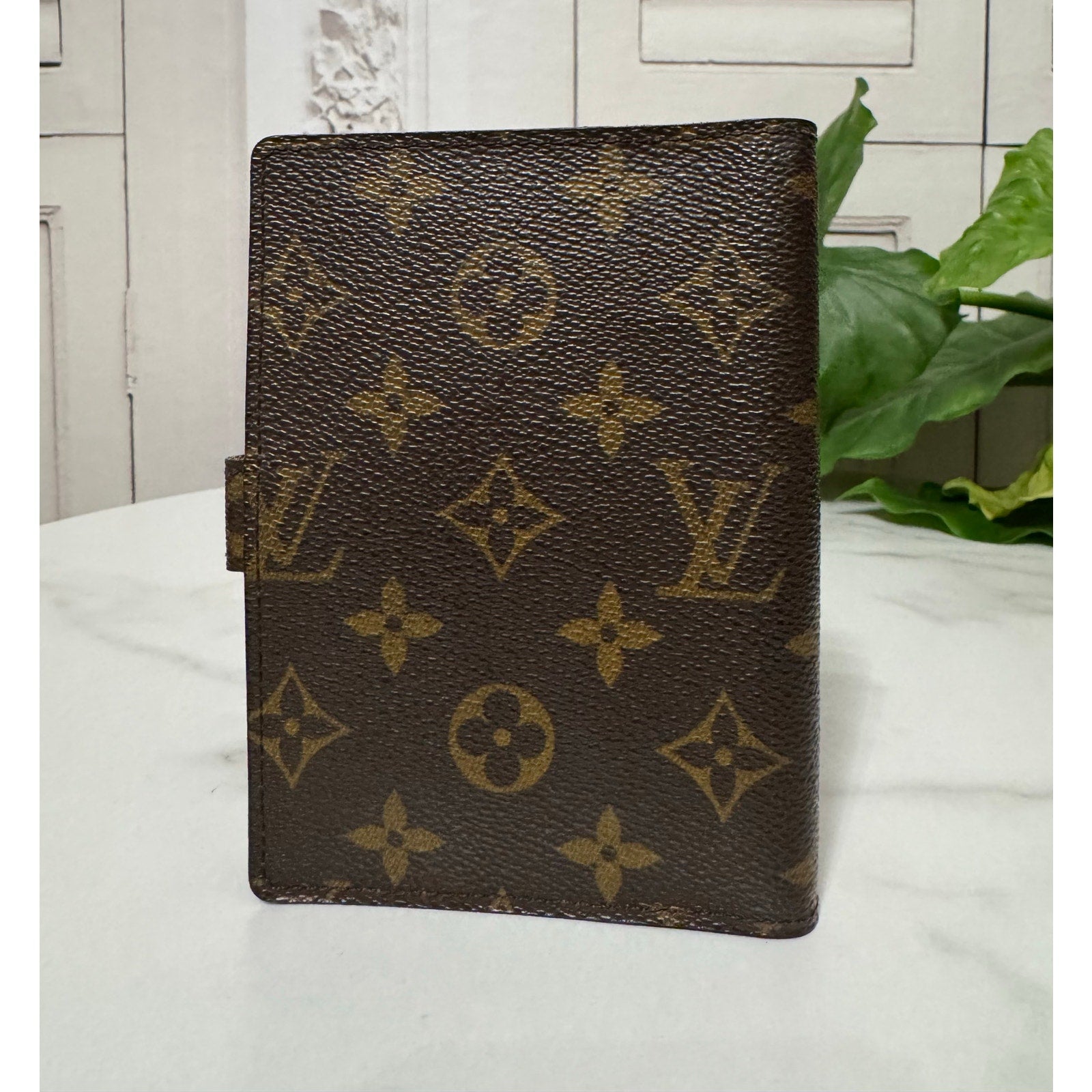 This is an authentic LOUIS VUITTON Monogram Small Ring Agenda Cover. This practical Louis Vuitton accessory will help you stay organized. This agenda features an exterior of durable monogram-coated canvas held by a snap closure. It opens to an interior of terracotta cross-grained leather with three card slots, two large pockets, and a brass 6-ring binder. Includes 2 full color custom laminated inserts and paper.