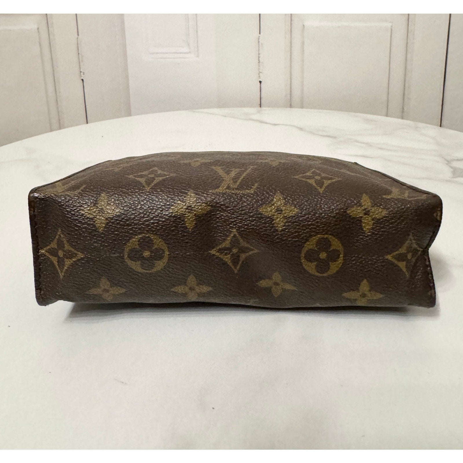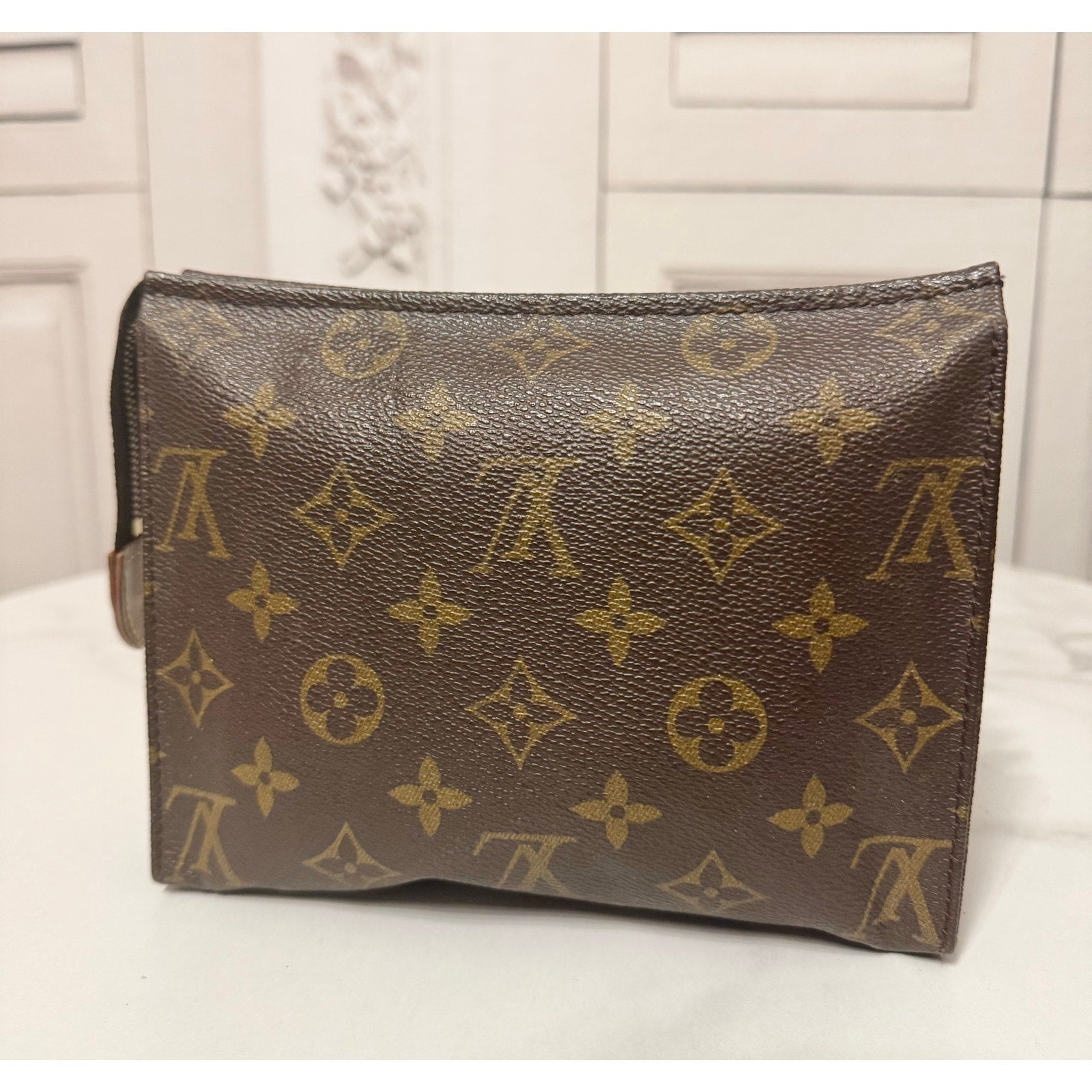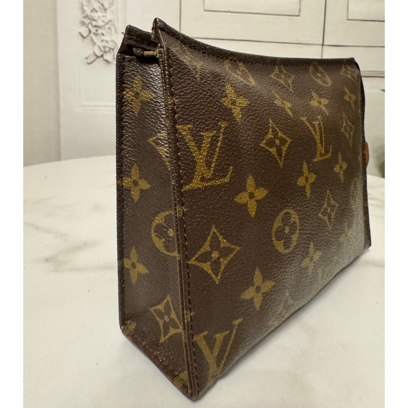This is an authentic LOUIS VUITTON Monogram Toiletry Pouch 19. This small cosmetic pouch is crafted of classic Louis Vuitton monogram coated toile canvas in dark brown. The pouch features an over-extended top zipper that opens to a lined interior.