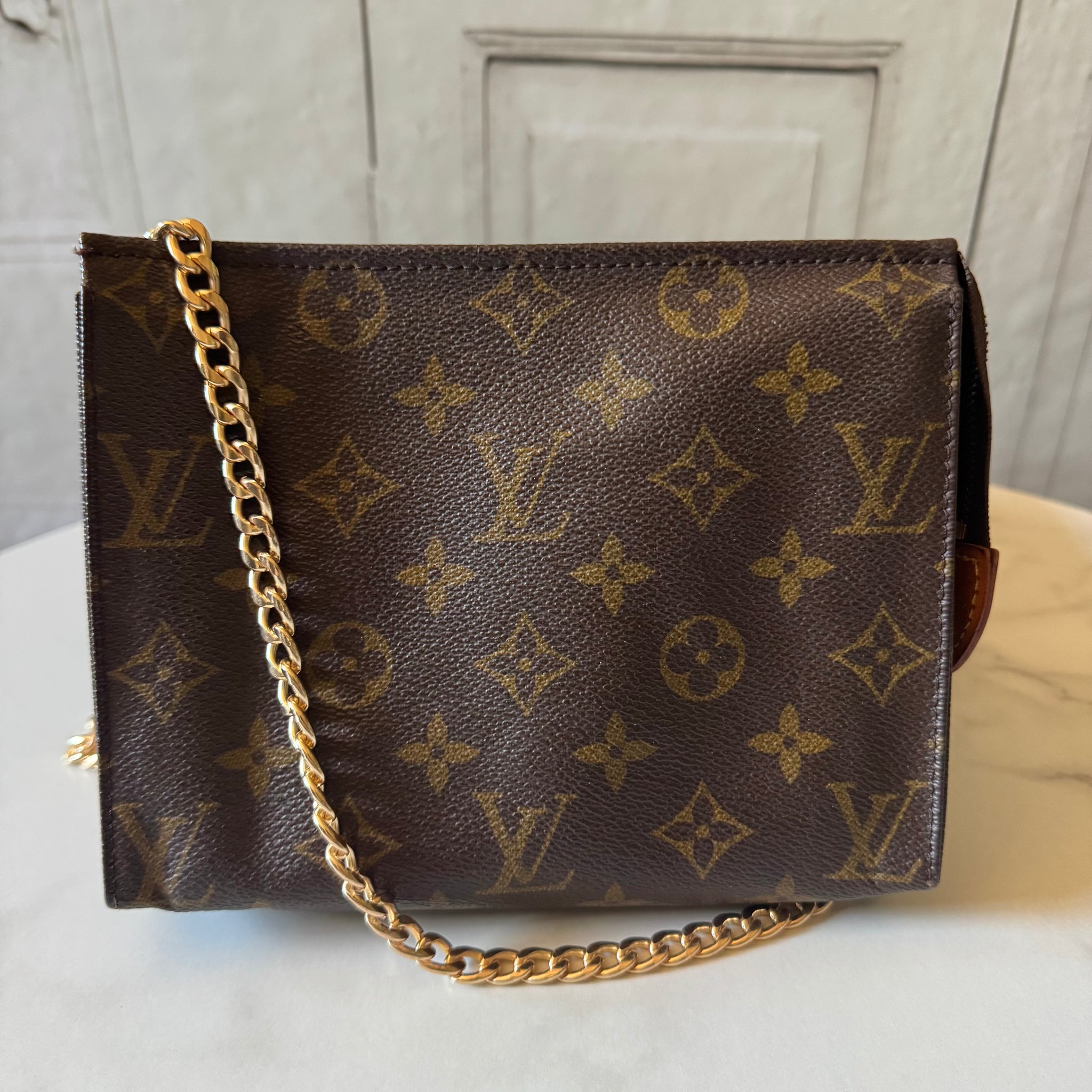 This is an authentic LOUIS VUITTON Monogram Toiletry Pouch 19. This small cosmetic pouch is crafted of classic Louis Vuitton monogram coated toile canvas in dark brown. The pouch features an over-extended top zipper that opens to a lined interior. Includes chain and insert so that it can be used as a shoulder bag.