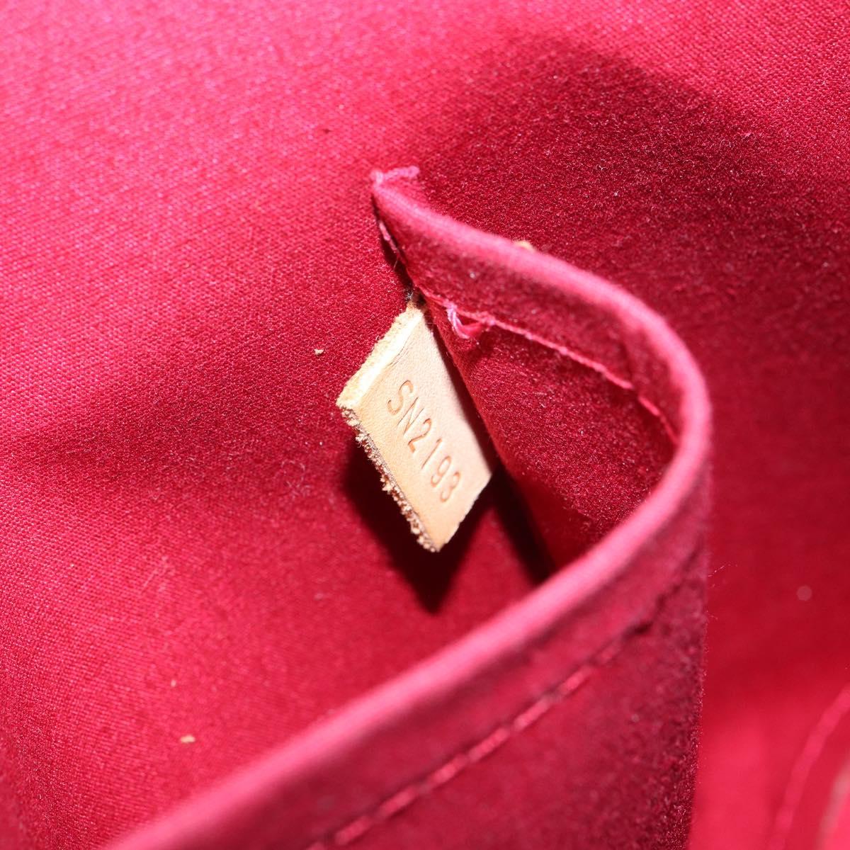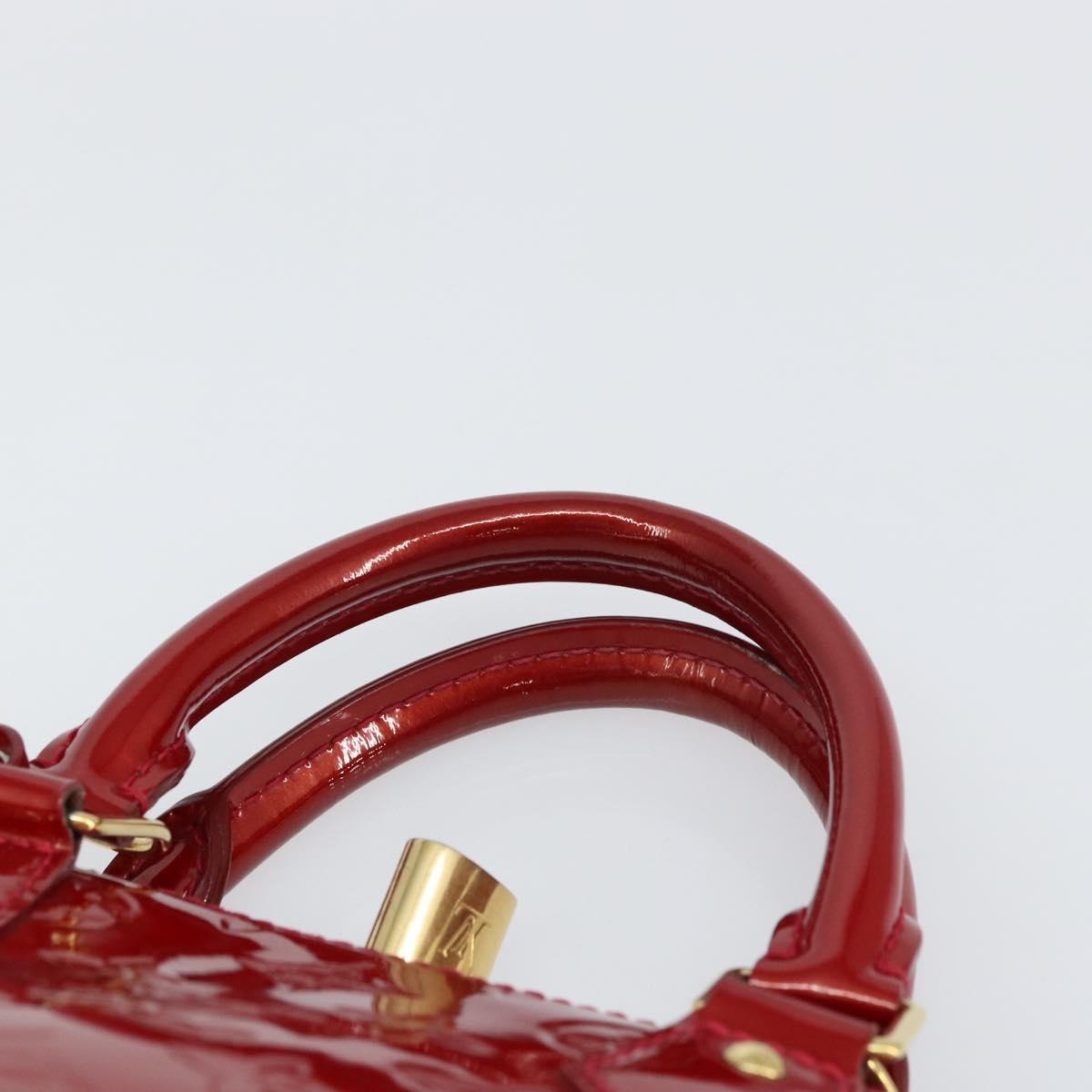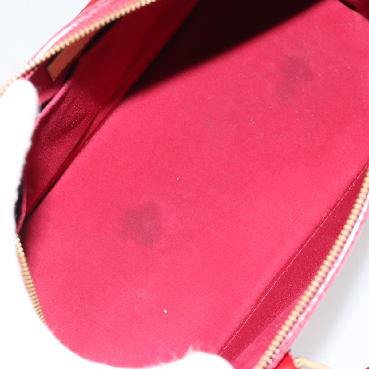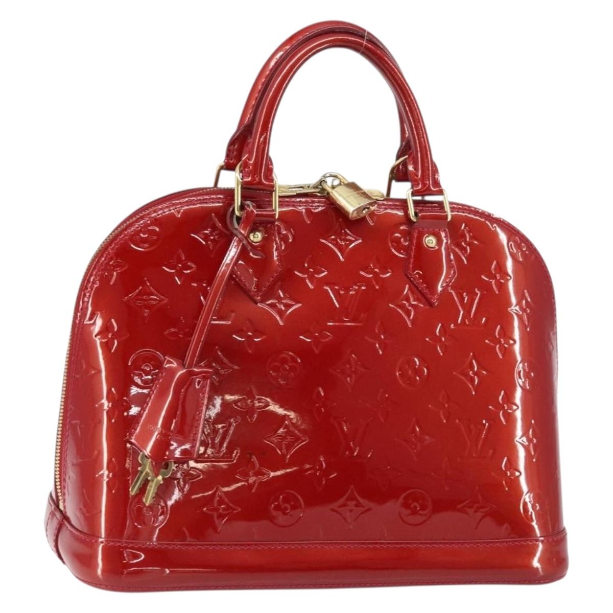 This is an authentic LOUIS VUITTON Vernis Alma PM in Pomme D'Amour. This tote is crafted of Louis Vuitton embossed monogram vernis leather in candy apple red. The bag features a solid patent leather base with protective feet, rolled leather top handles, and a double polished brass zipper that opens to an interior of canvas textile with patched pockets.